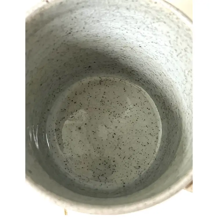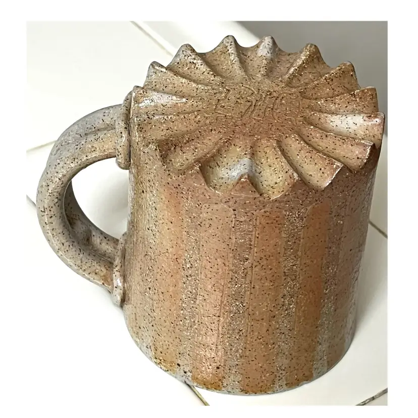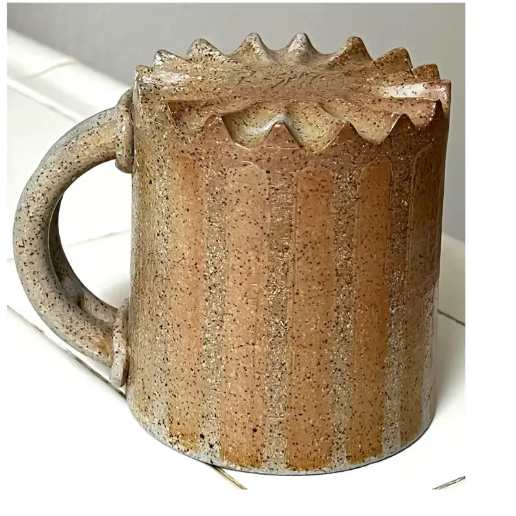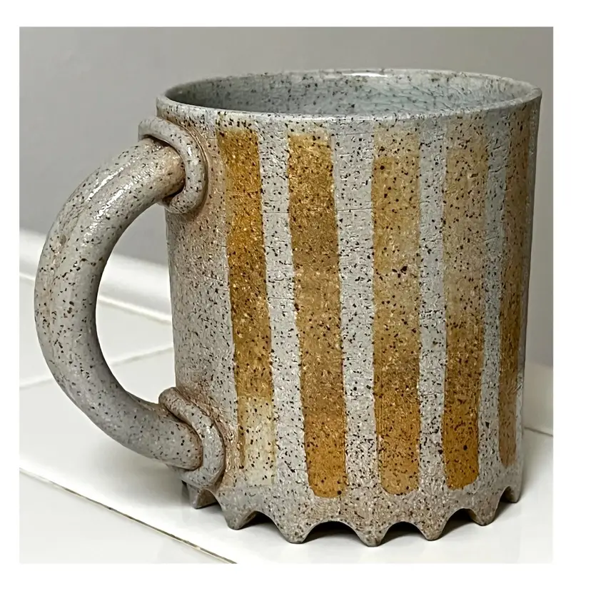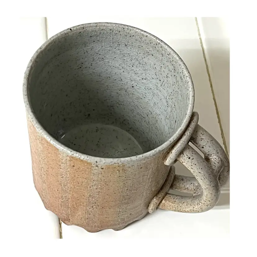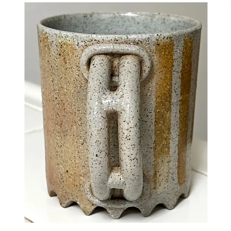 Ceramic Art Pottery Beige Grey Coffee Mug Signed 'Big Feeling' 4 in Height, 3.5 in Diameter. 14 oz. No chips