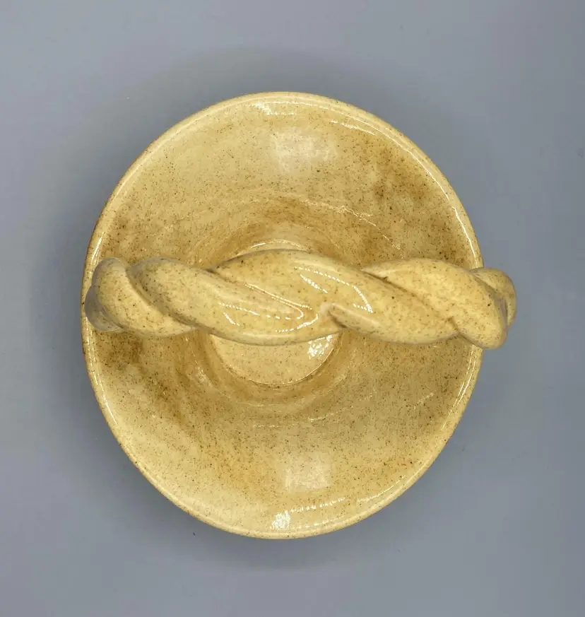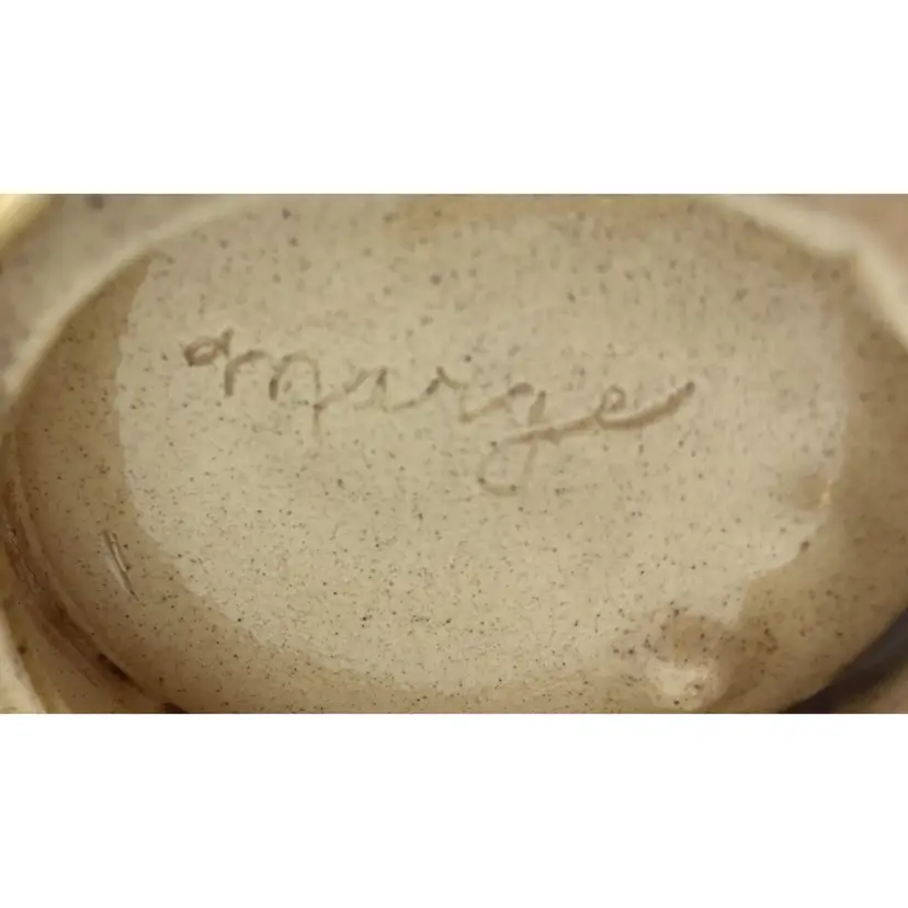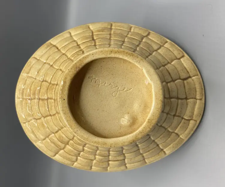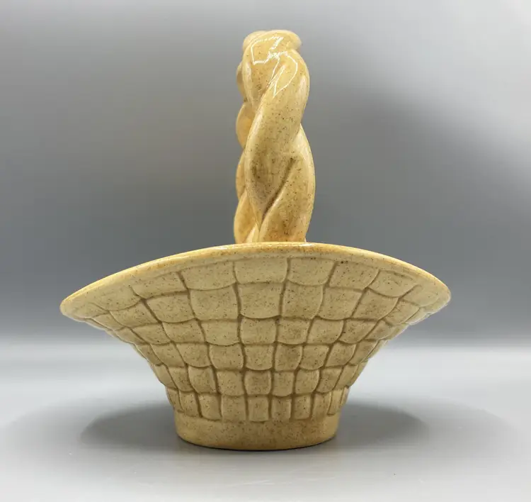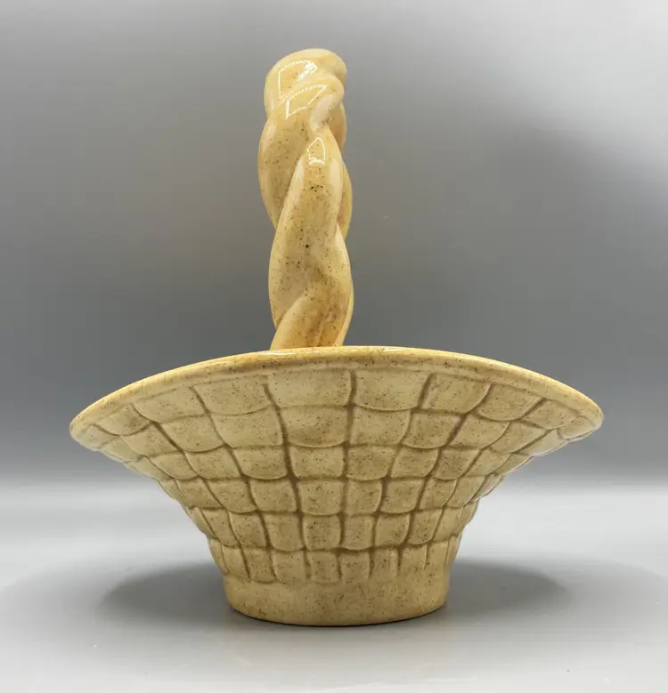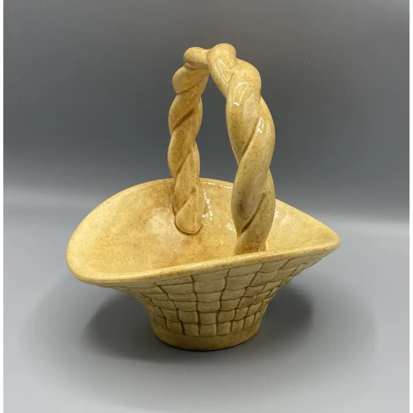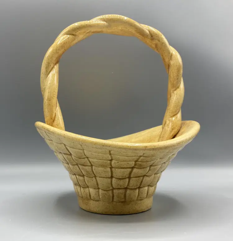This ceramic basket is in excellent condition. No chips or cracks. It is signed "Marge" on the bottom. I believe it is vintage, but can't be 100% certain. This basket measures approximately 7" tall and the top opening of the basket is approximately 6.5" across at the widest point and 5.5" across at the narrowest point.