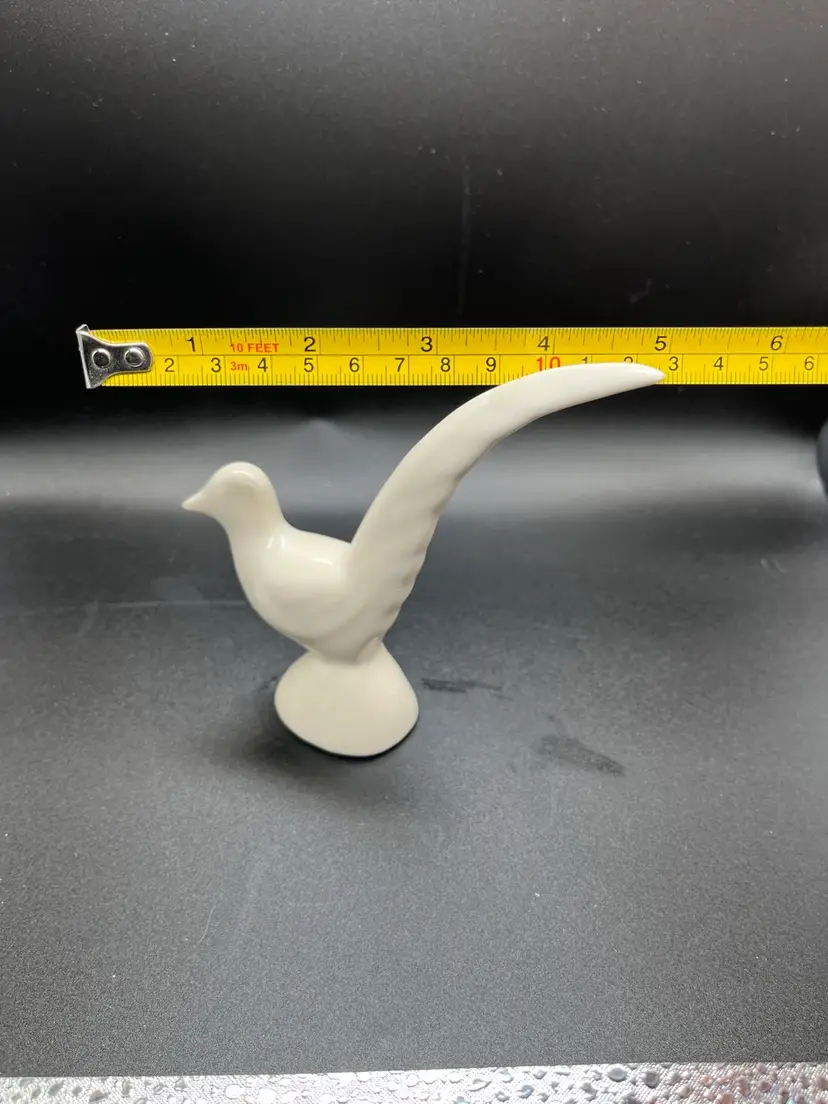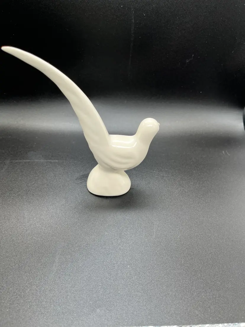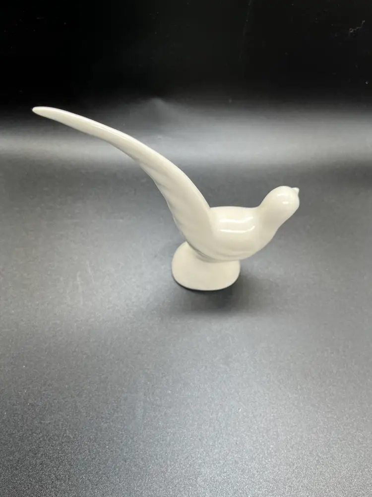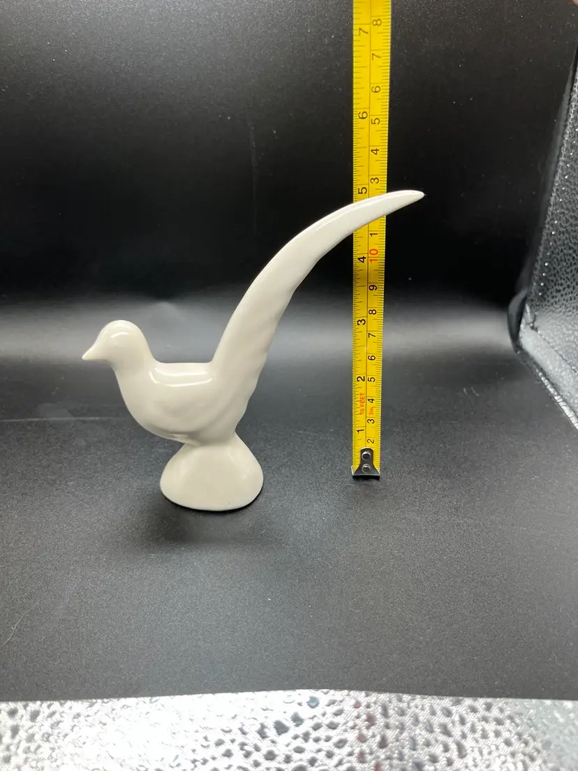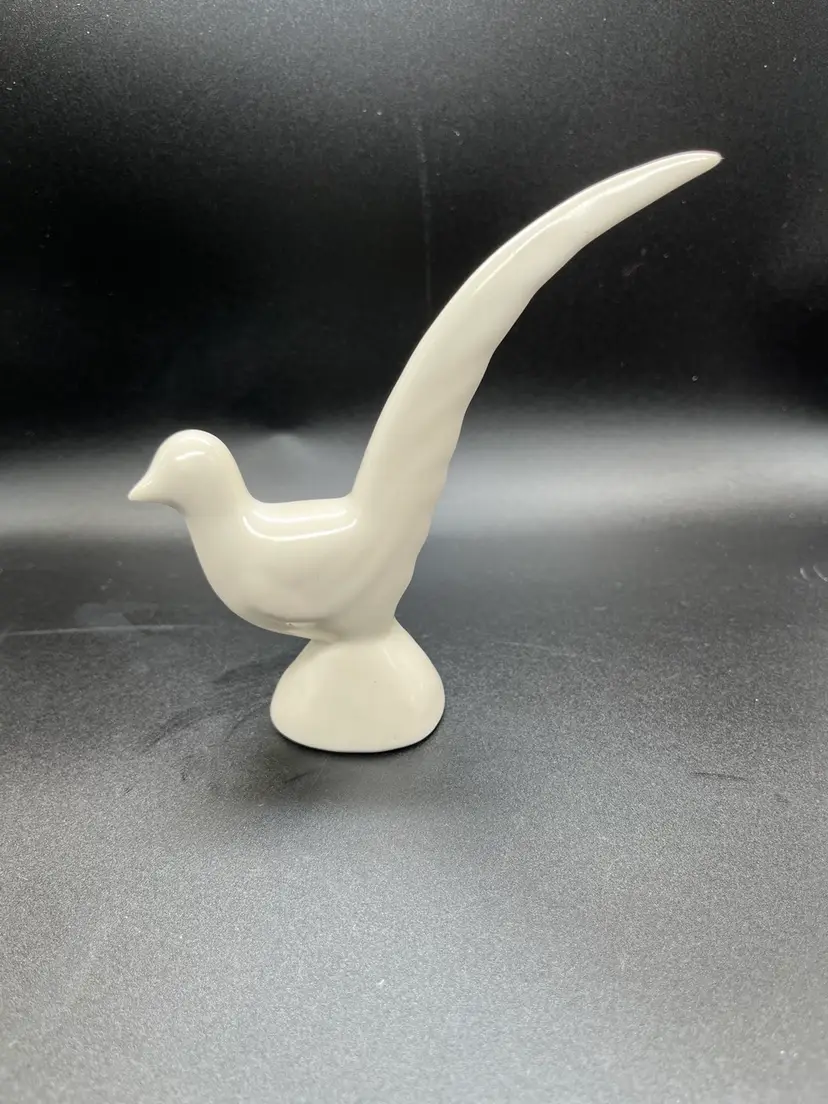 Ivory colored ceramic bird with long tail. Not marked. Approximately 4 1/2 inches long and 5 inches tall.