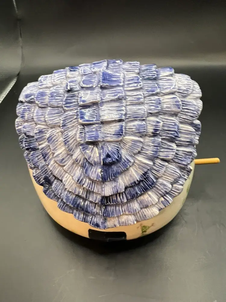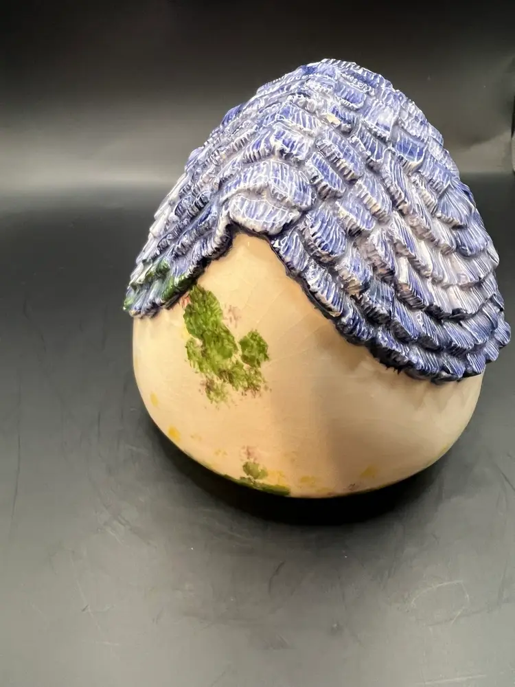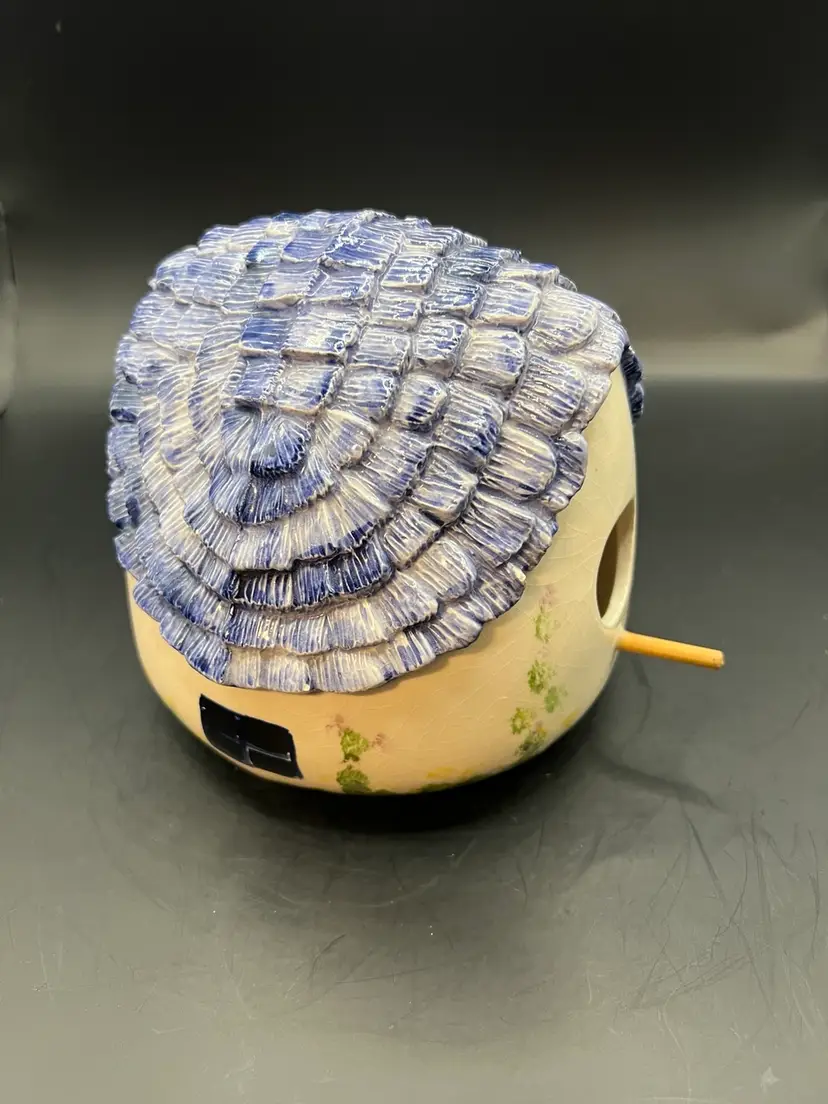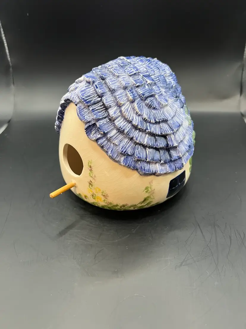 Ceramic birdhouse, off-white, and the blue roof preowned. No tips or cracks about a pound. 6 inches tall 6 1/2 inches in diameter.