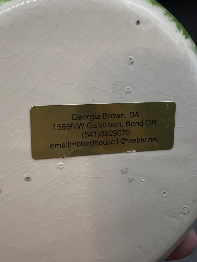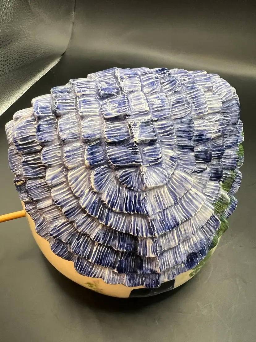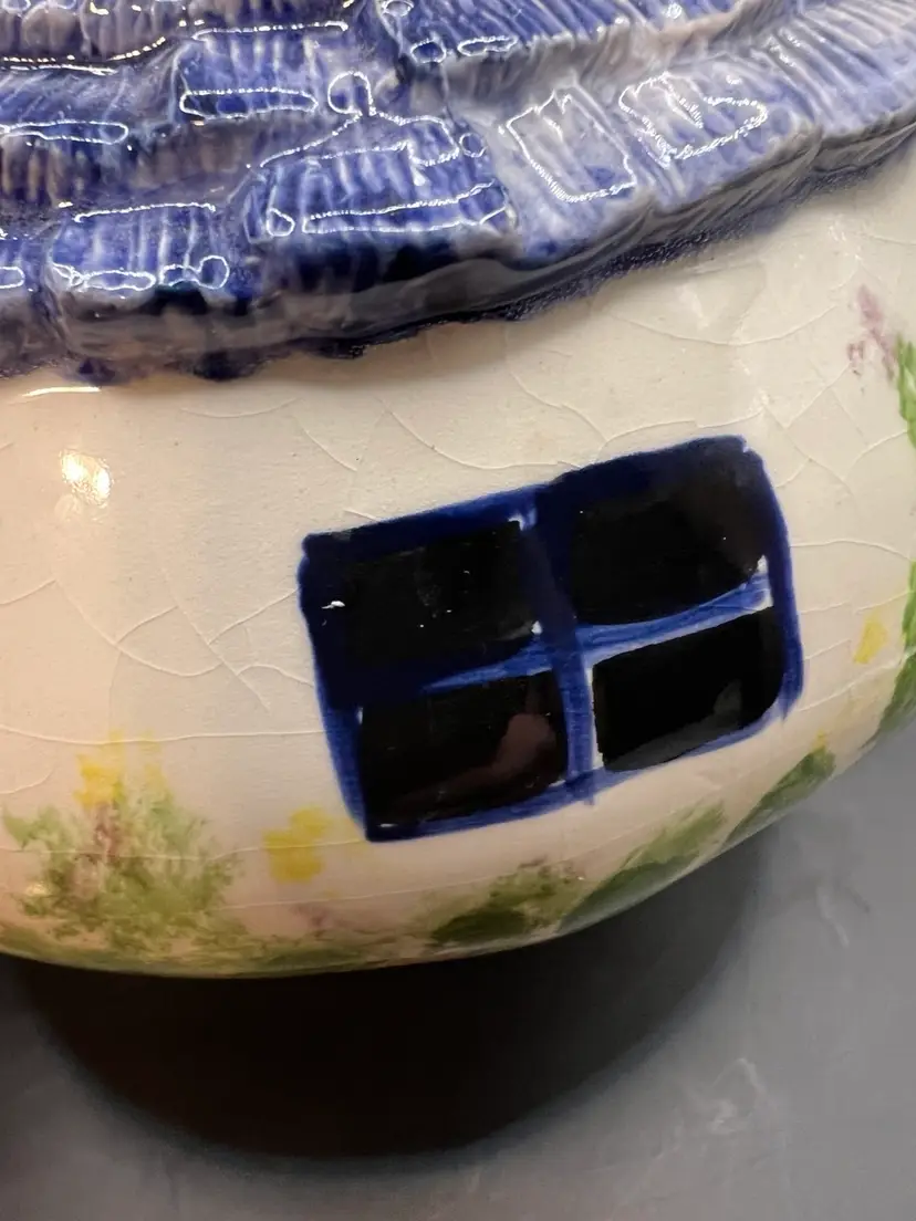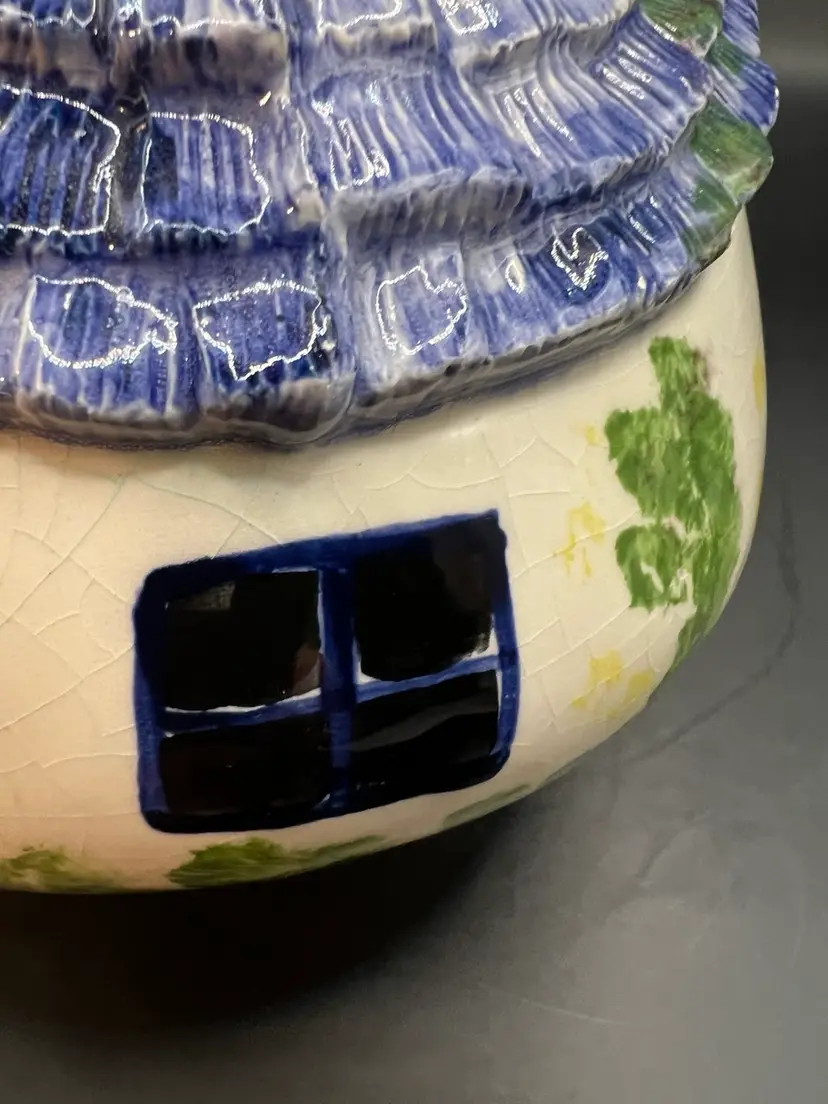 Ceramic birdhouse, off-white, and the blue roof preowned. No tips or cracks about a pound. 6 inches tall 6 1/2 inches in diameter.