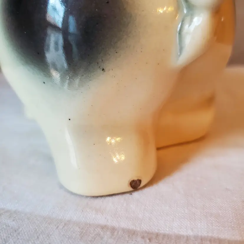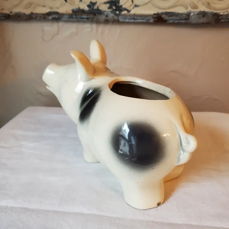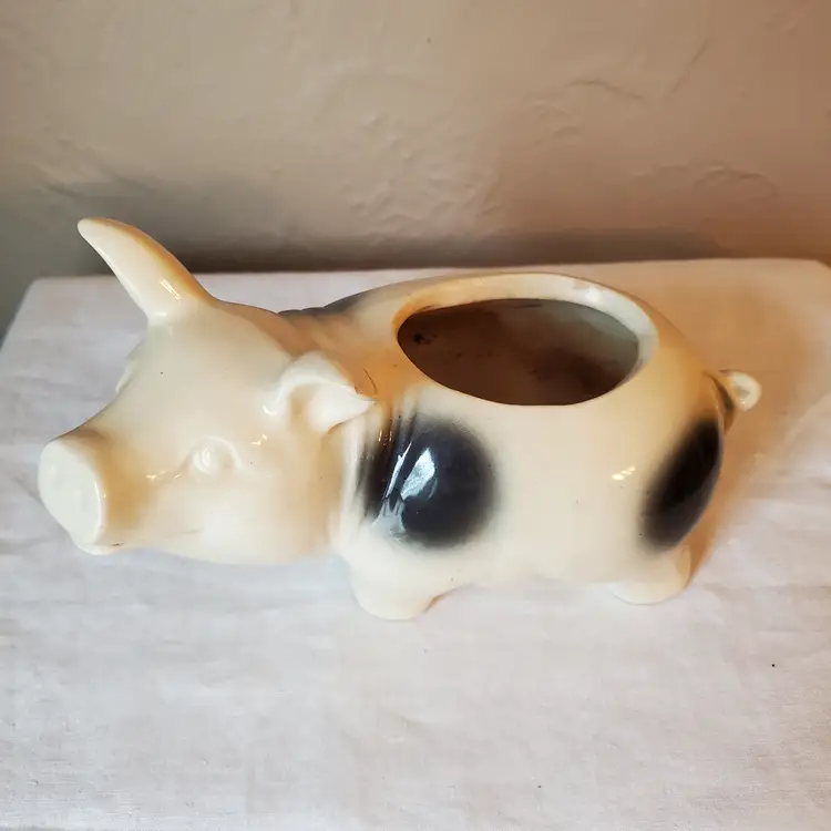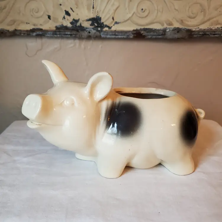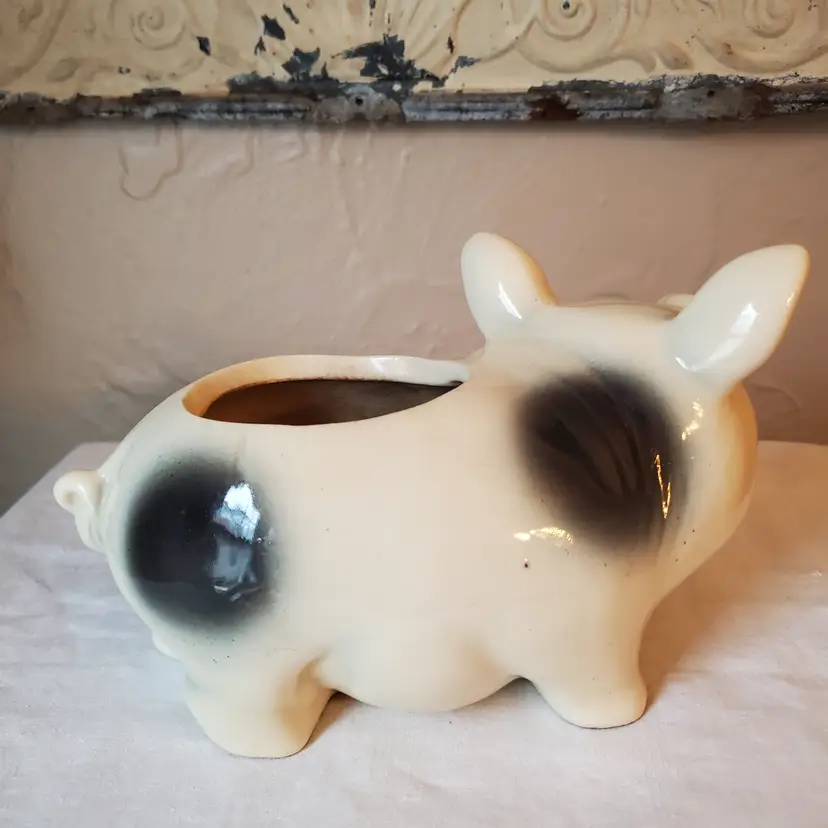 A cute and unique pig planter. In good condition with one small chip. 4.5" tall. 7 3/4 x 4".