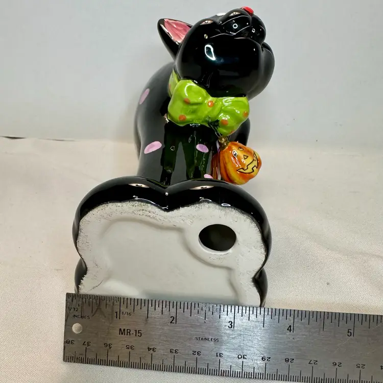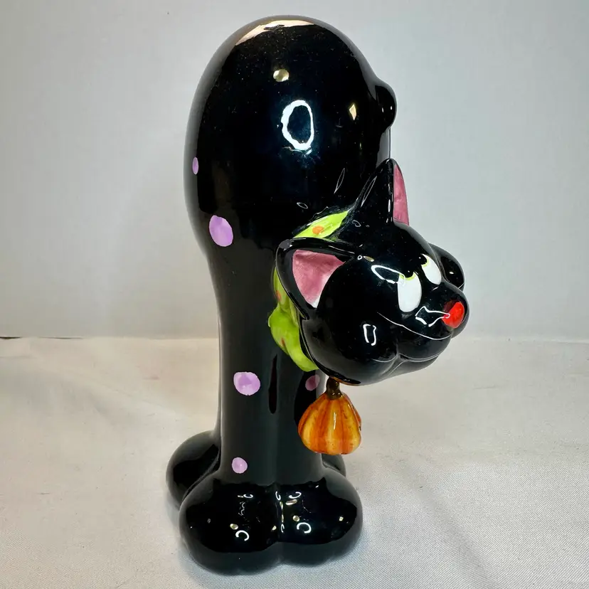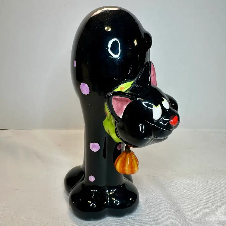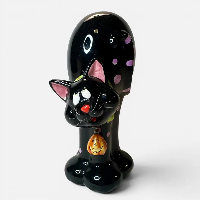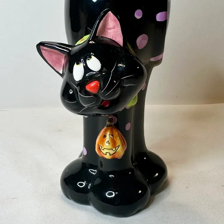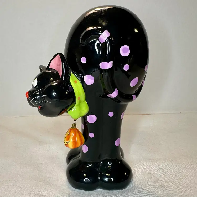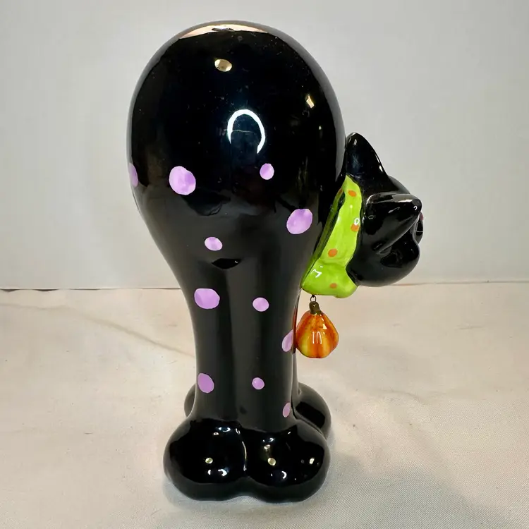 This listing is for this charming vintage Halloween ceramic figurine of a cat with pink polka dots, and a hanging pumpkin charm. This fun and whimsical Halloween decor is Perfect for cat lovers or vintage Halloween decor collectors. It is in excellent vintage condition, with one minor repair on his ear. What seems to have been a small chip was repainted to cover the surface to match the black paint. He measures approximately 8.5” high by 5.5” wide.