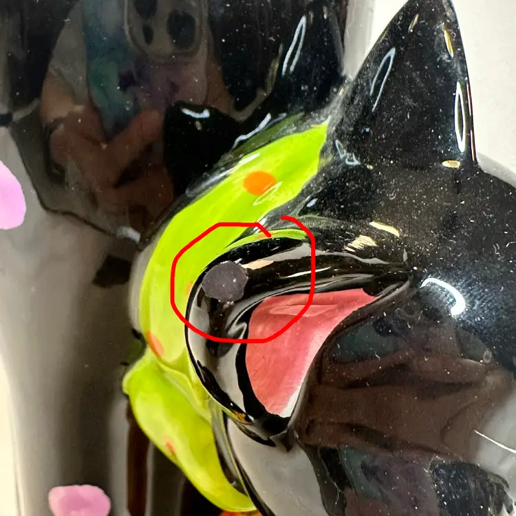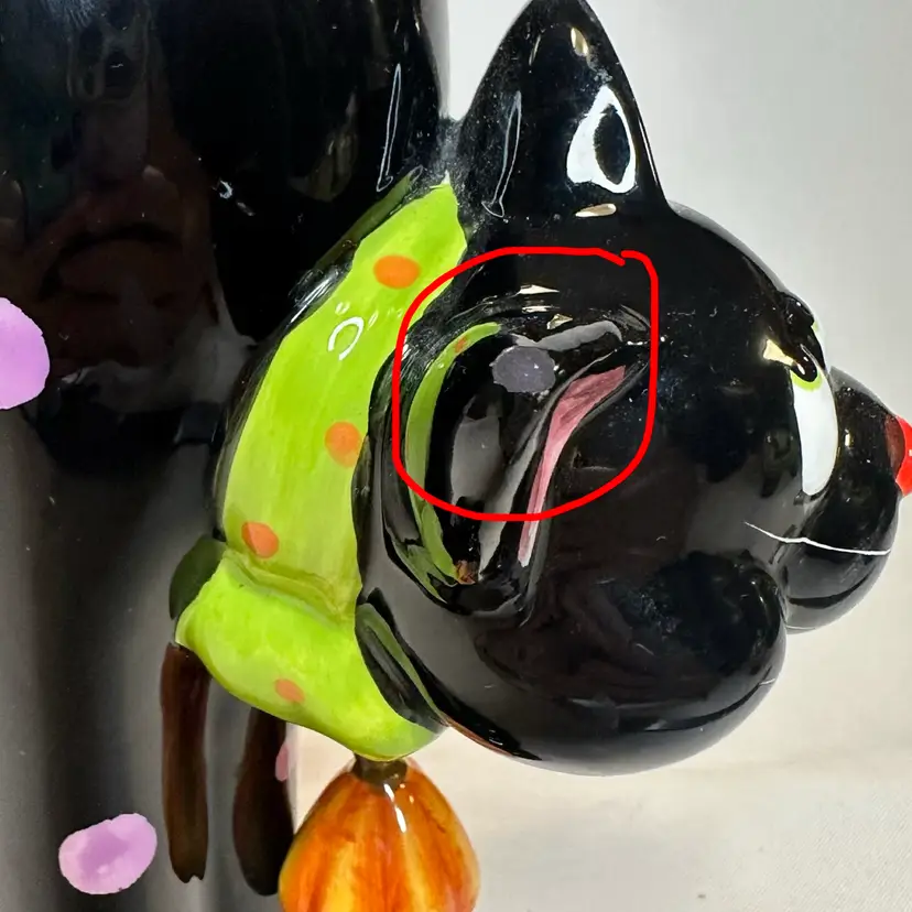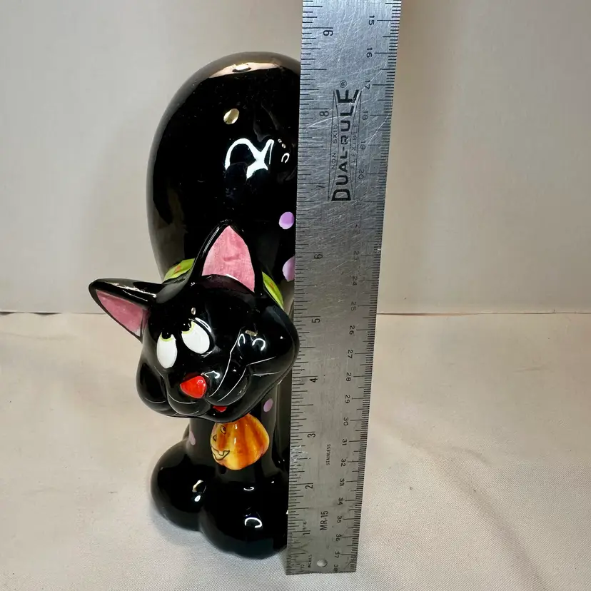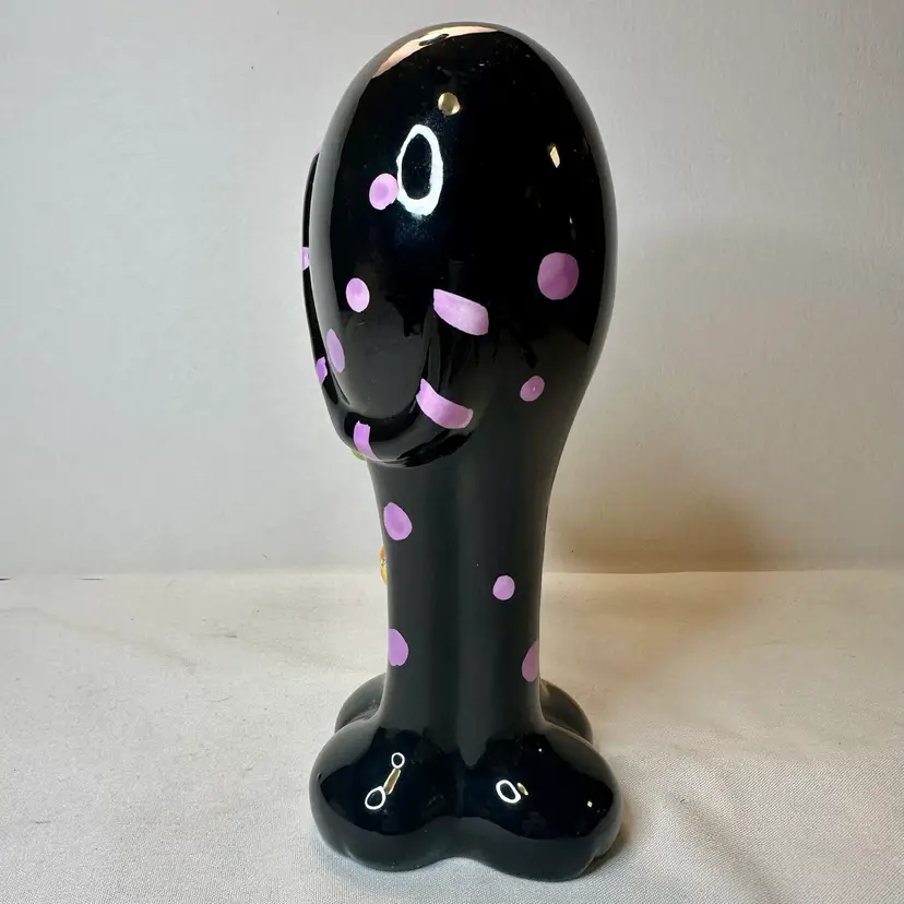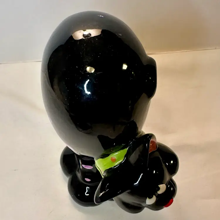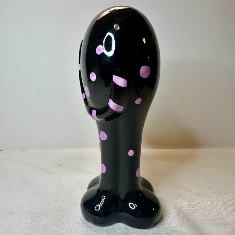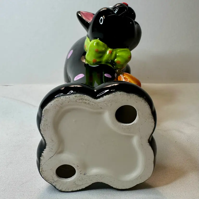 This listing is for this charming vintage Halloween ceramic figurine of a cat with pink polka dots, and a hanging pumpkin charm. This fun and whimsical Halloween decor is Perfect for cat lovers or vintage Halloween decor collectors. It is in excellent vintage condition, with one minor repair on his ear. What seems to have been a small chip was repainted to cover the surface to match the black paint. He measures approximately 8.5” high by 5.5” wide.