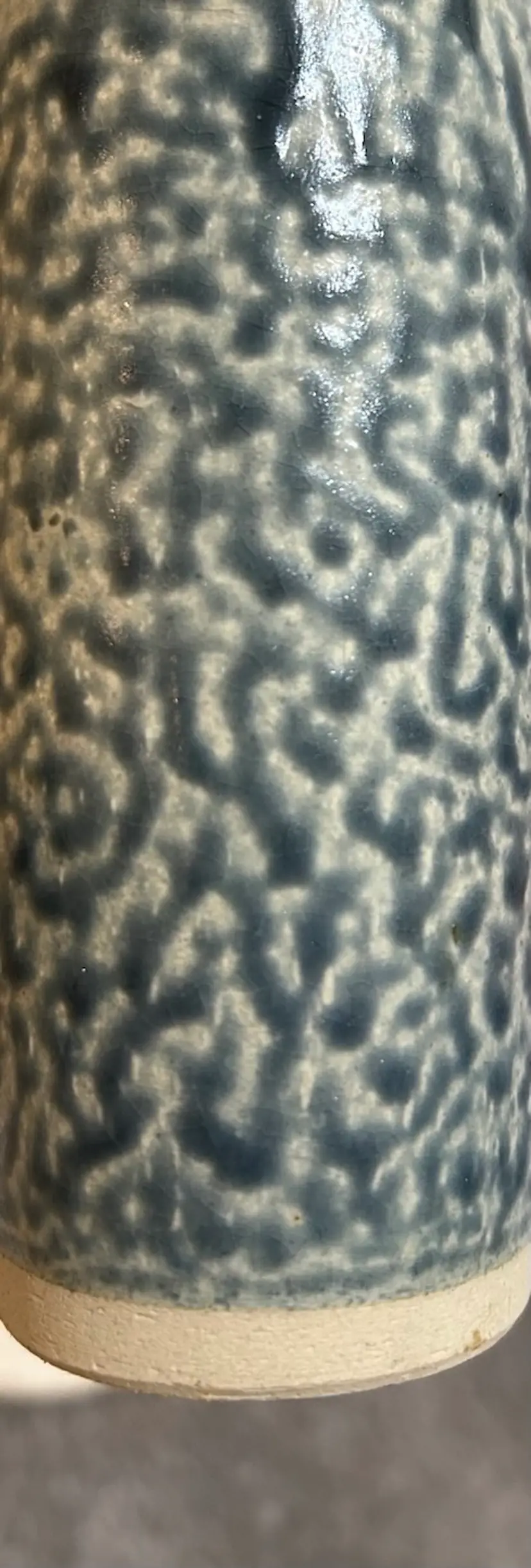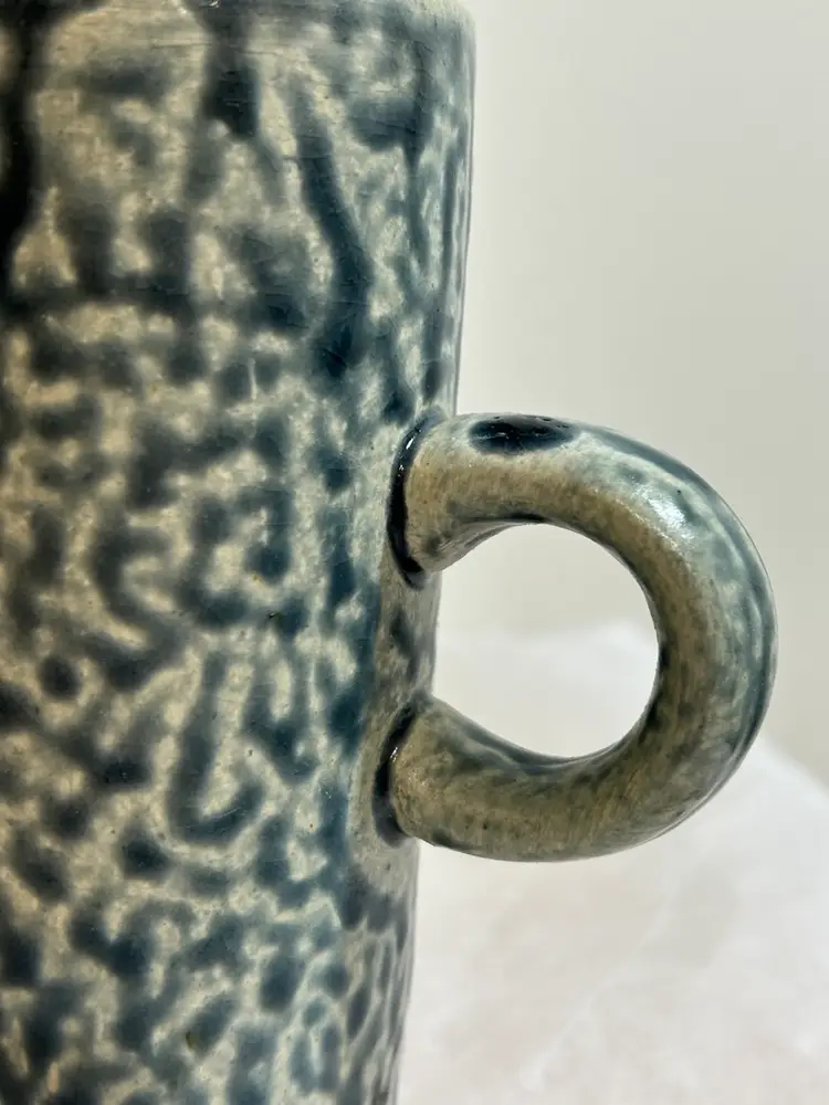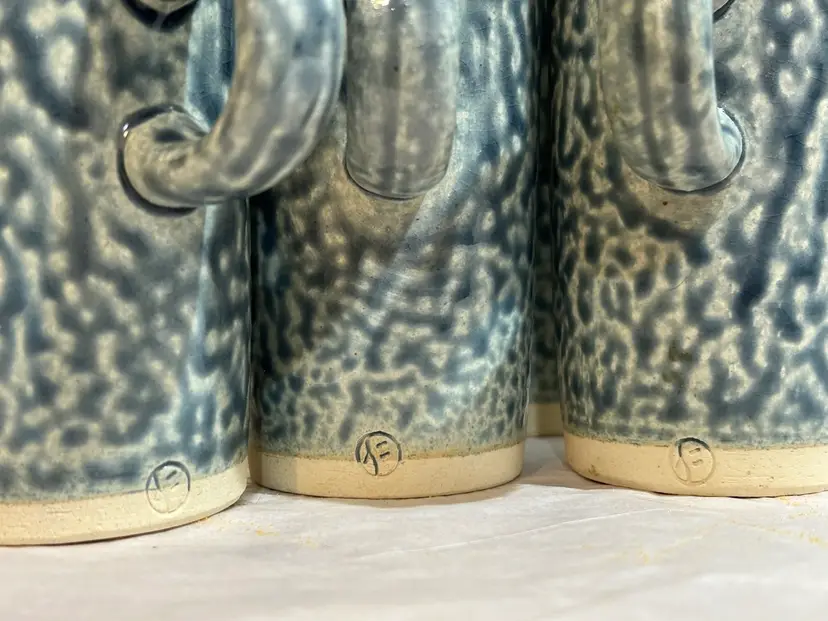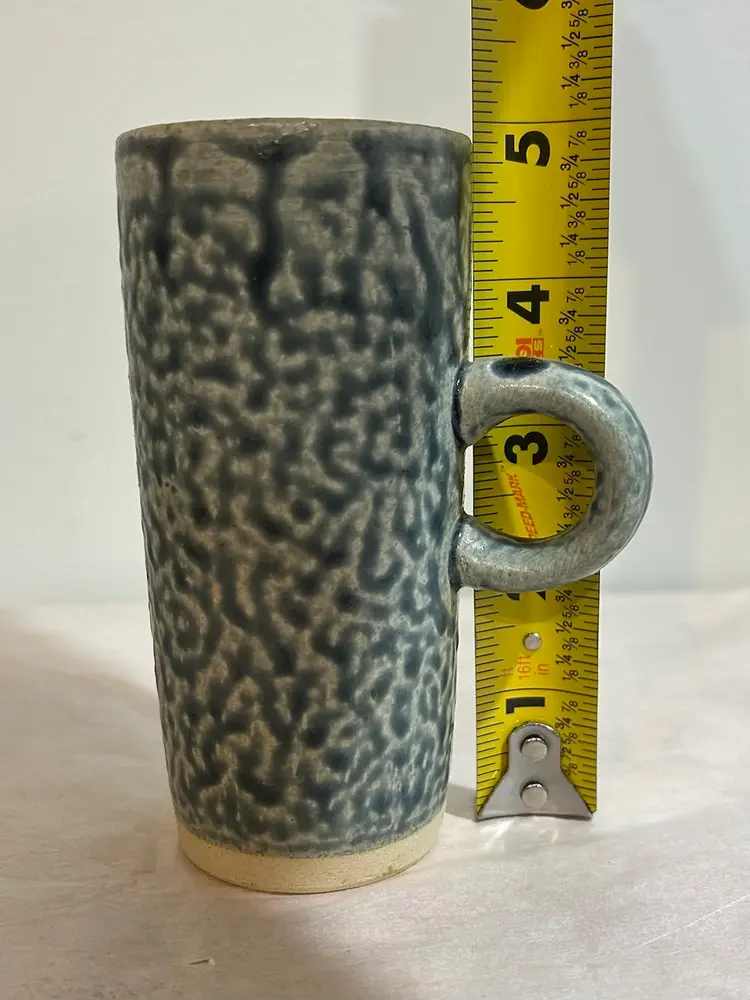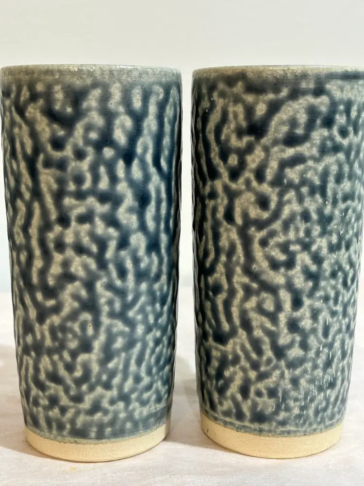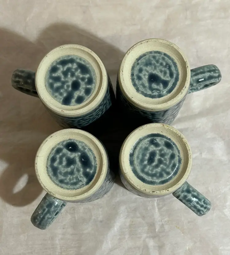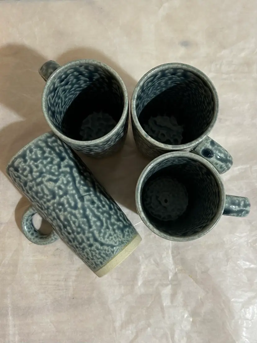Set of 4 tall studio pottery mugs featuring a rich blue salt glaze and an abstract, Brutalist-style coral design. The mugs are stamped and showcases the beautiful texture and character created by the salt-glazing process. The mugs show an excellent strength of blue salt glaze all over the mugs. Each mug holds approximately 5 oz—perfect for espresso, tea, or a small coffee. In excellent condition with no chips or cracks. A striking handmade set for collectors of studio pottery or lovers of unique, artistic drinkware. *browse my collection of artisan pottery including vintage. You may find the perfect gift or personal treasure.
