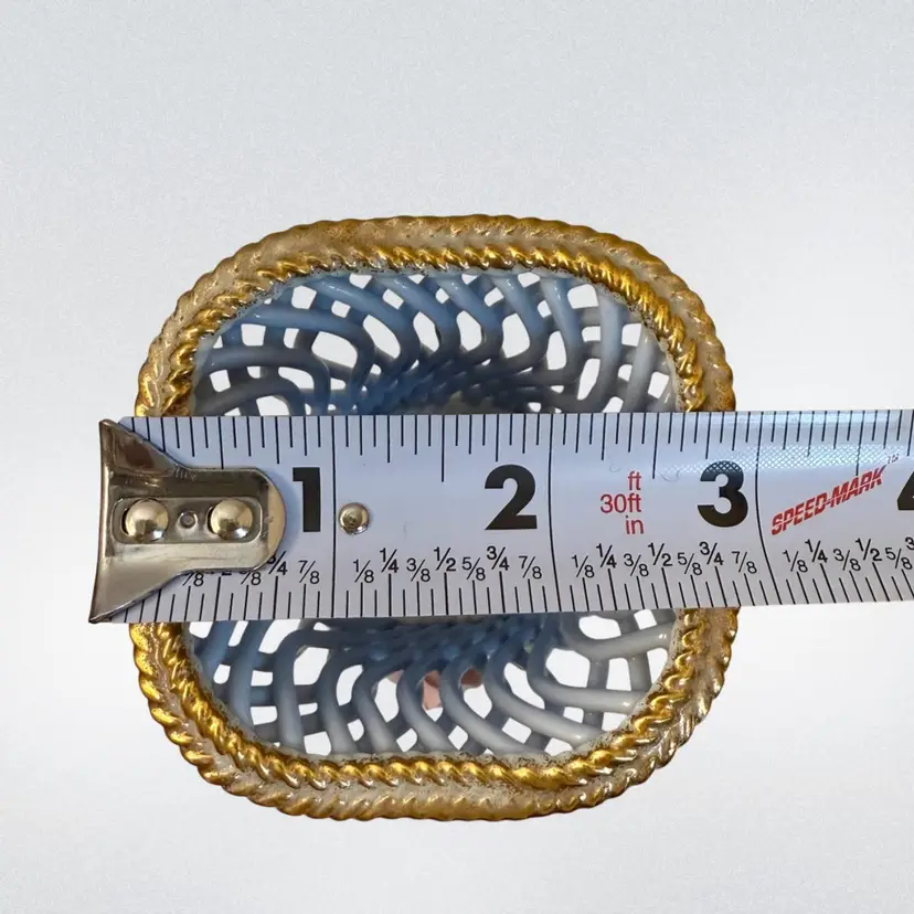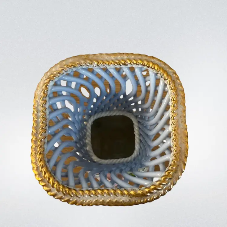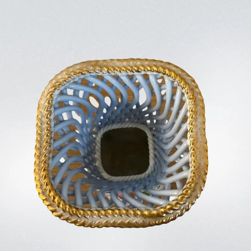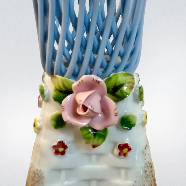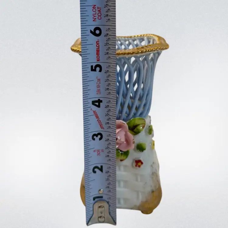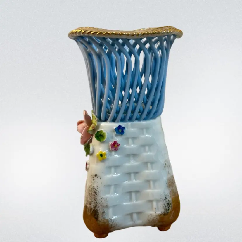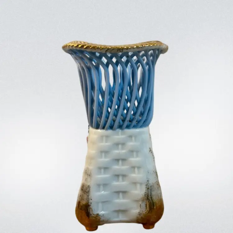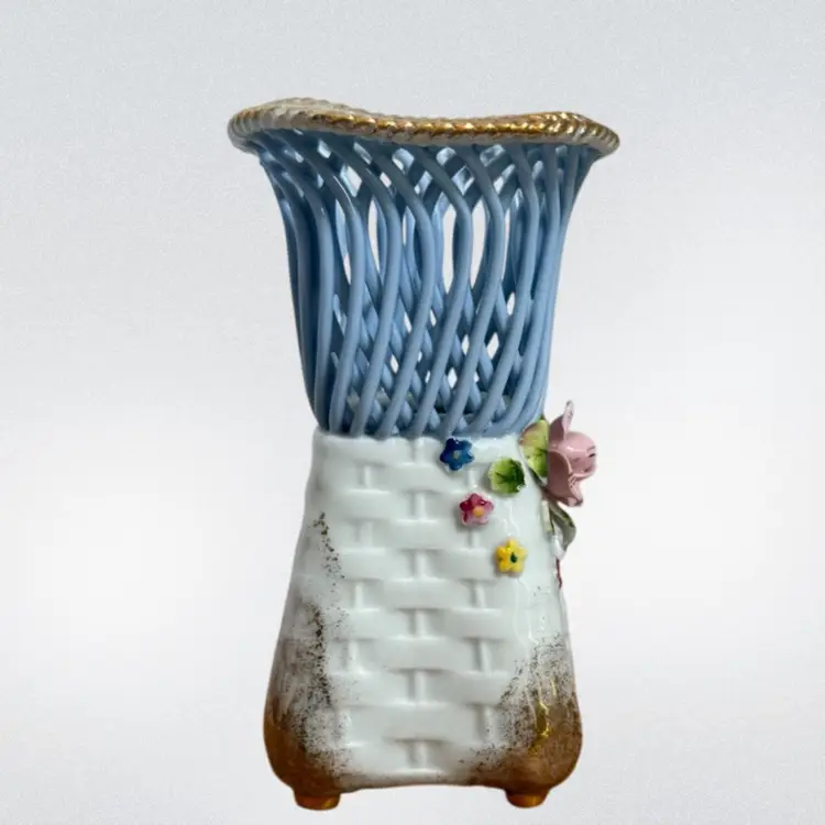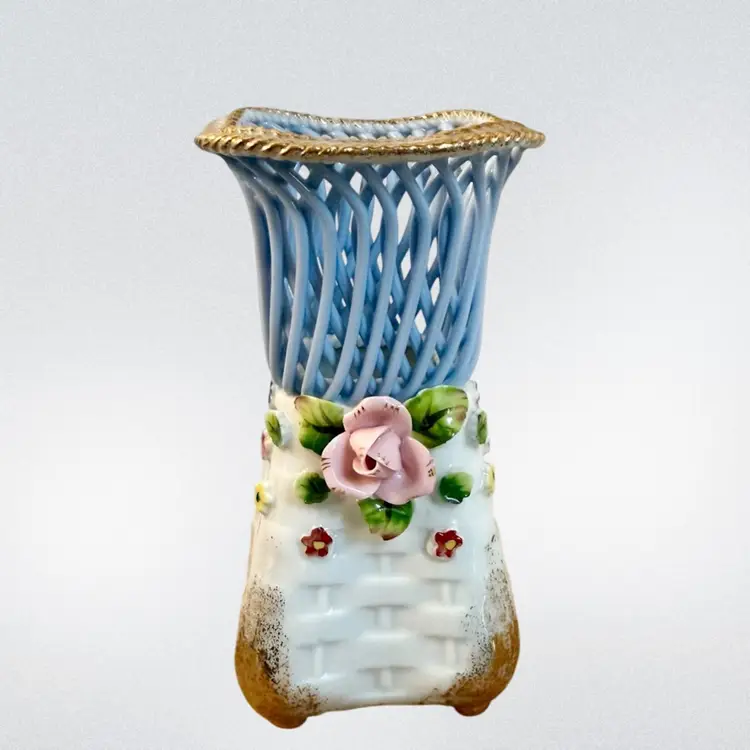 Beautiful lattice vase with applied flowers worn label. Condition: No condition issues noted. Measurements: Approximately 5.25” T x 3”W. Please see pictures for condition and measurements as they are a part of the condition. N8-17 5 Thank you for looking!
