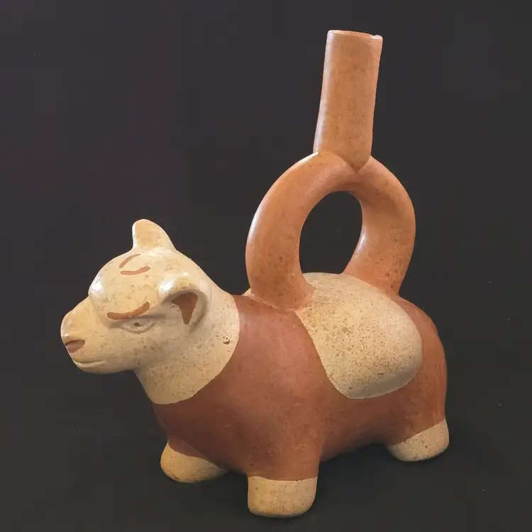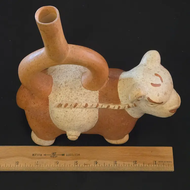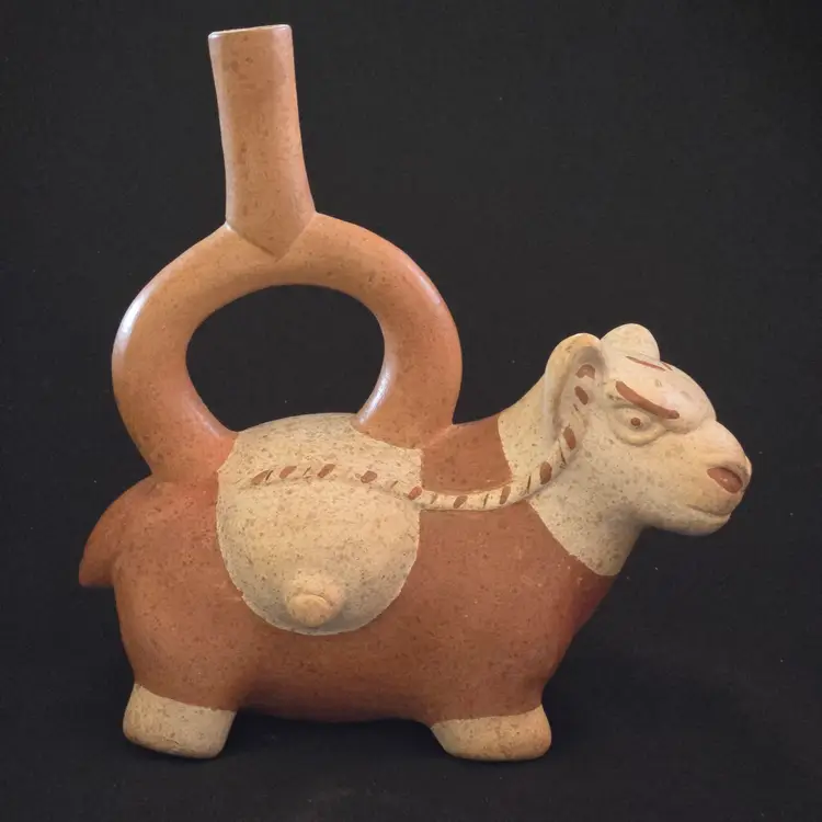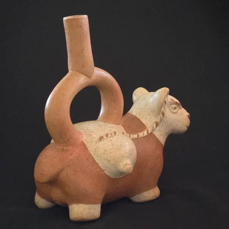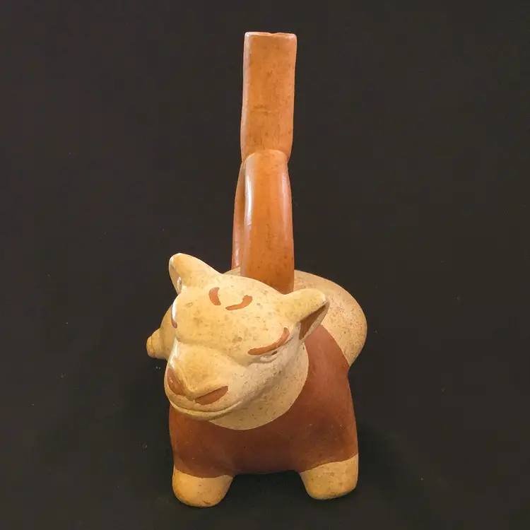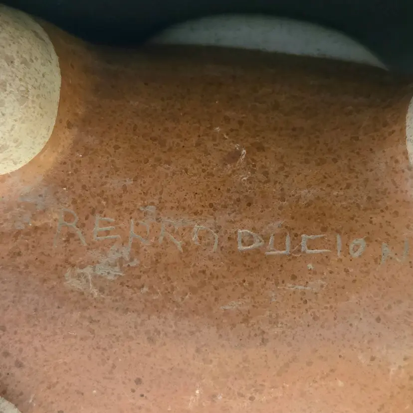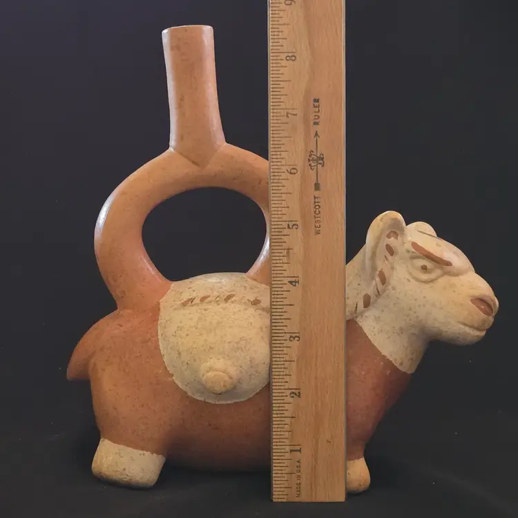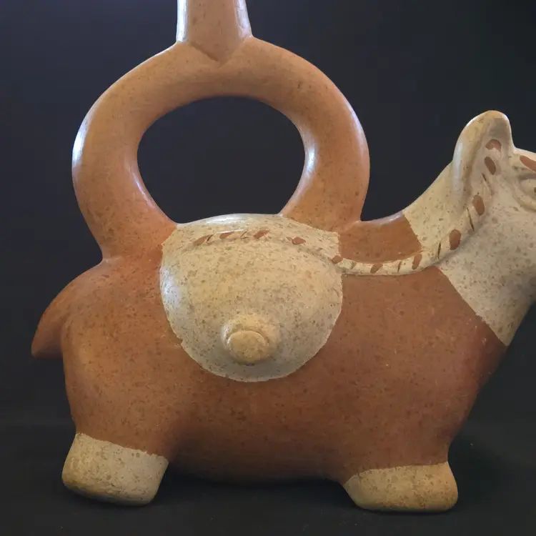 Ceramic Bull Stirrup Moche Peruvian Huaco Hand Made Signed Rerro Ducio Replica with interesting color pattern. Used condition with manufacturer flaws including dirt, spots of missing color, etc. Please view all the photos and please ask any questions prior to purchase when possible.
