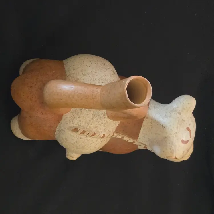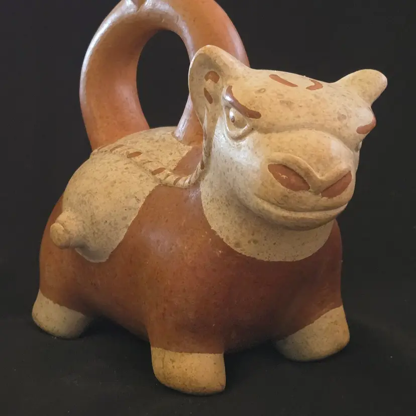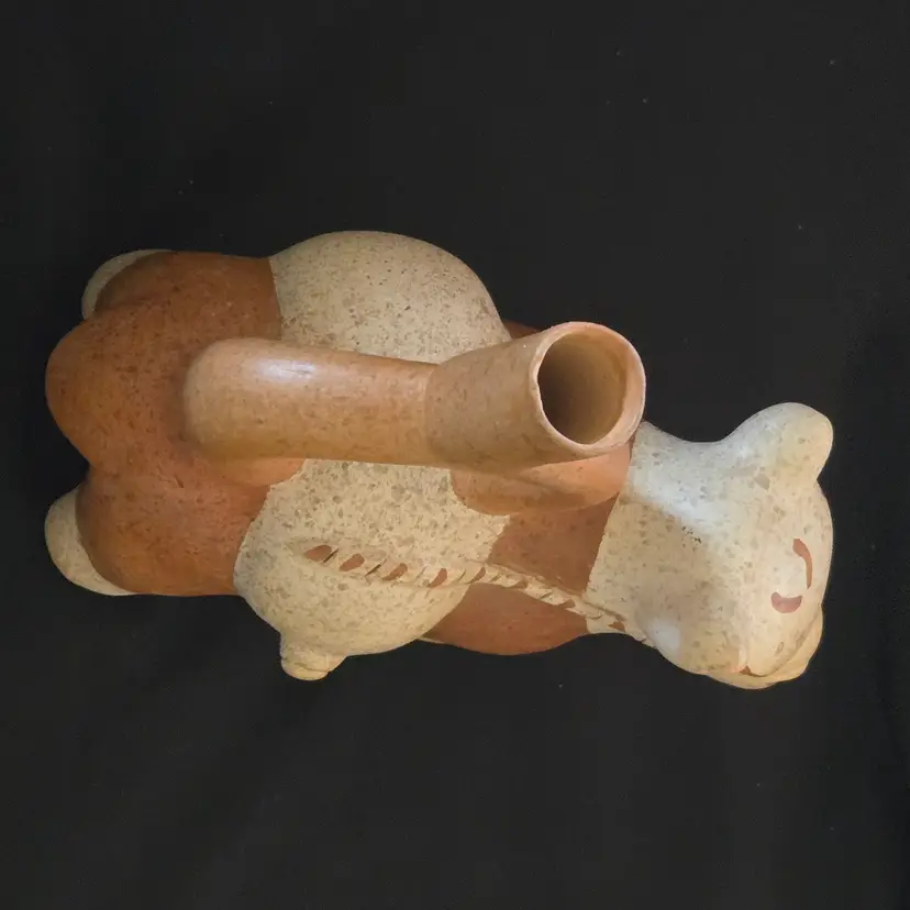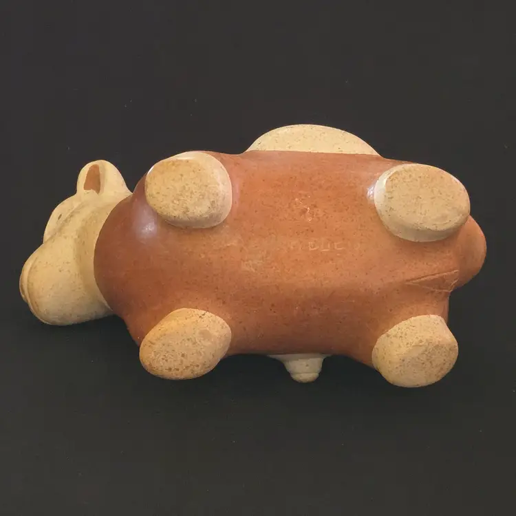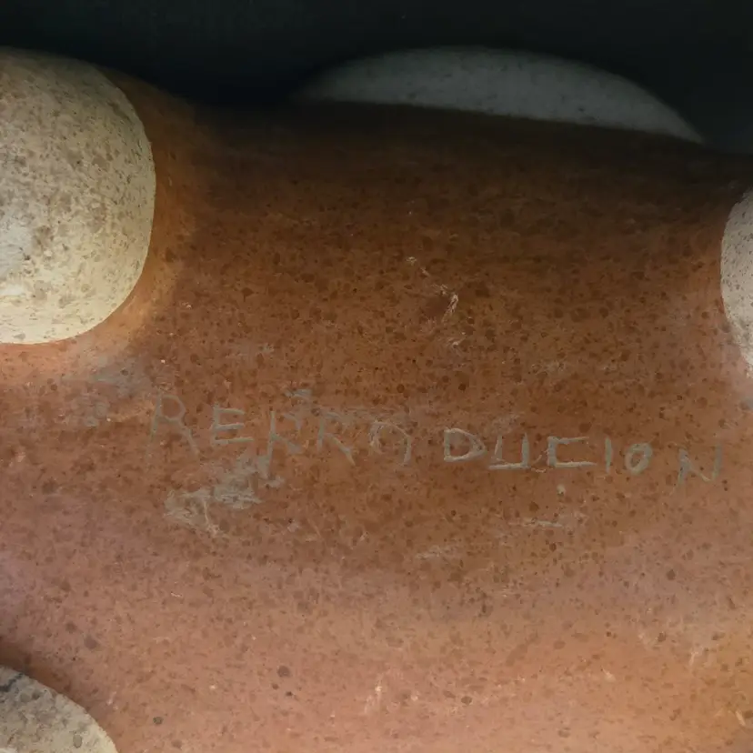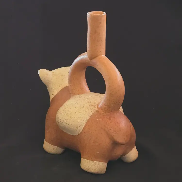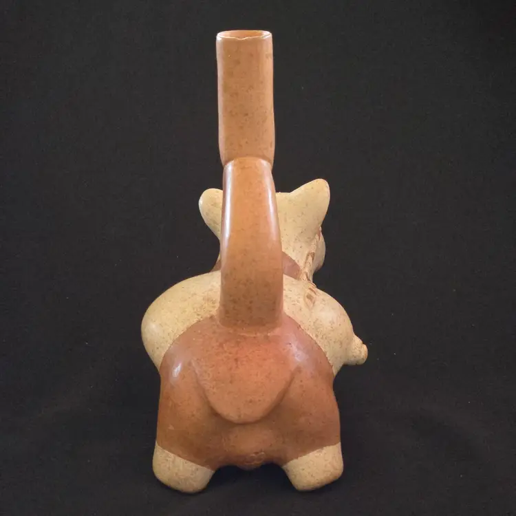 Ceramic Bull Stirrup Moche Peruvian Huaco Hand Made Signed Rerro Ducio Replica with interesting color pattern. Used condition with manufacturer flaws including dirt, spots of missing color, etc. Please view all the photos and please ask any questions prior to purchase when possible.