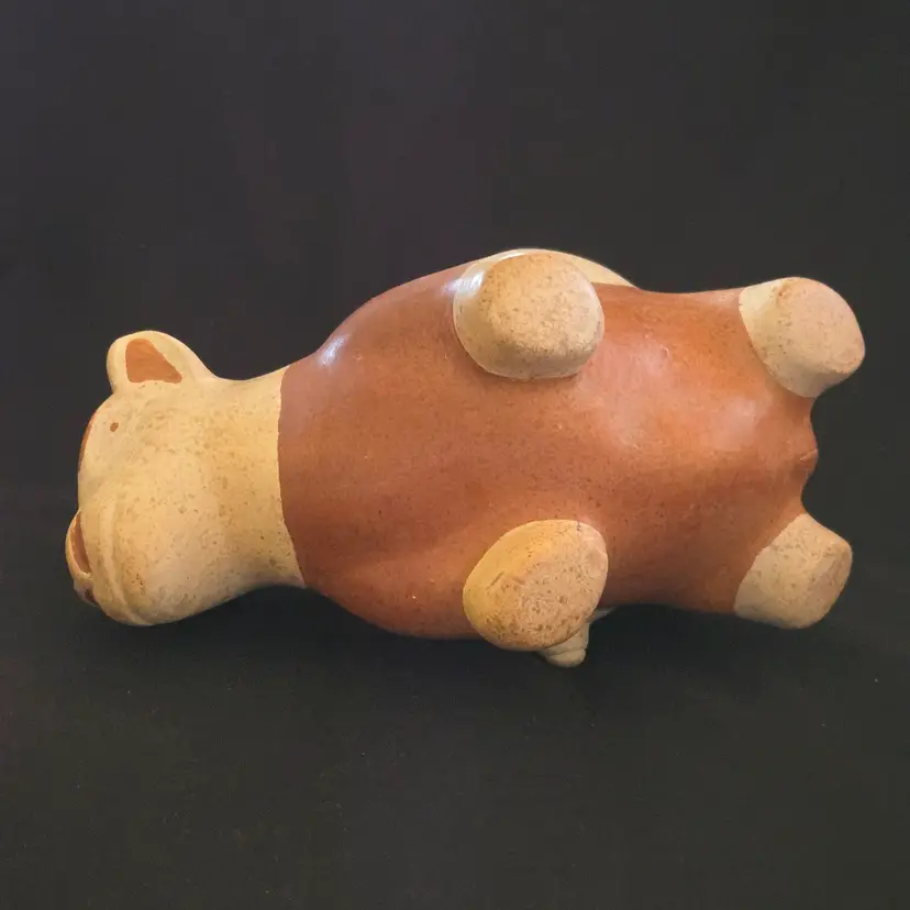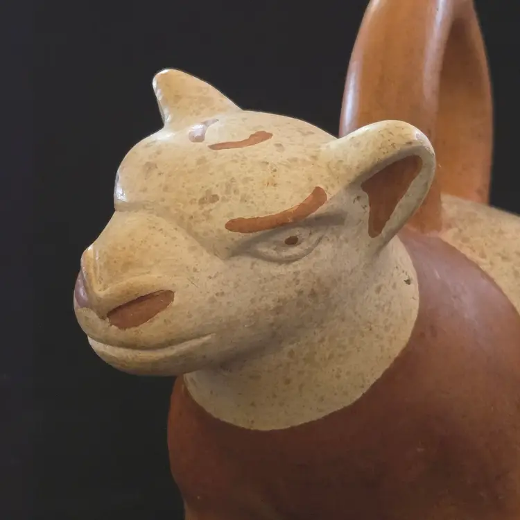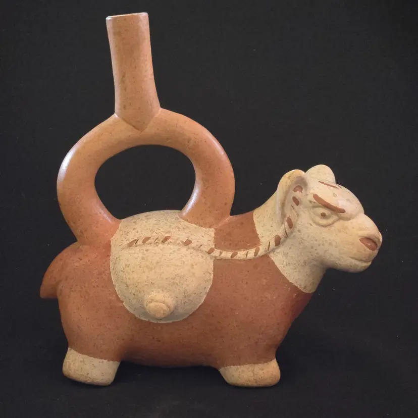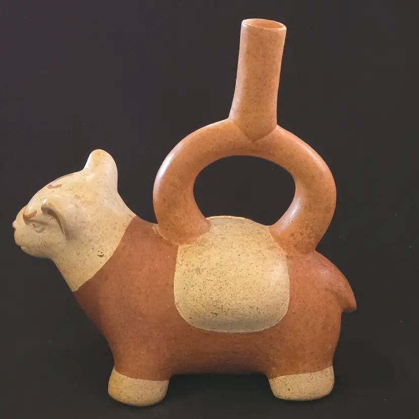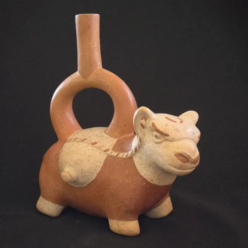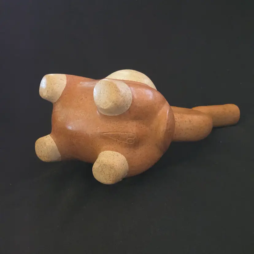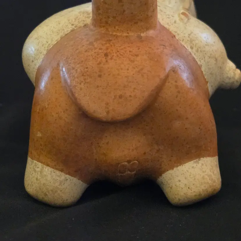 Ceramic Bull Stirrup Moche Peruvian Huaco Hand Made Signed Rerro Ducio Replica with interesting color pattern. Used condition with manufacturer flaws including dirt, spots of missing color, etc. Please view all the photos and please ask any questions prior to purchase when possible.