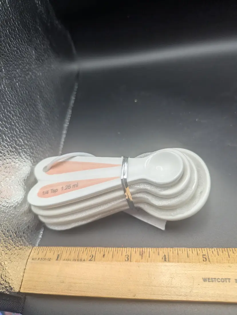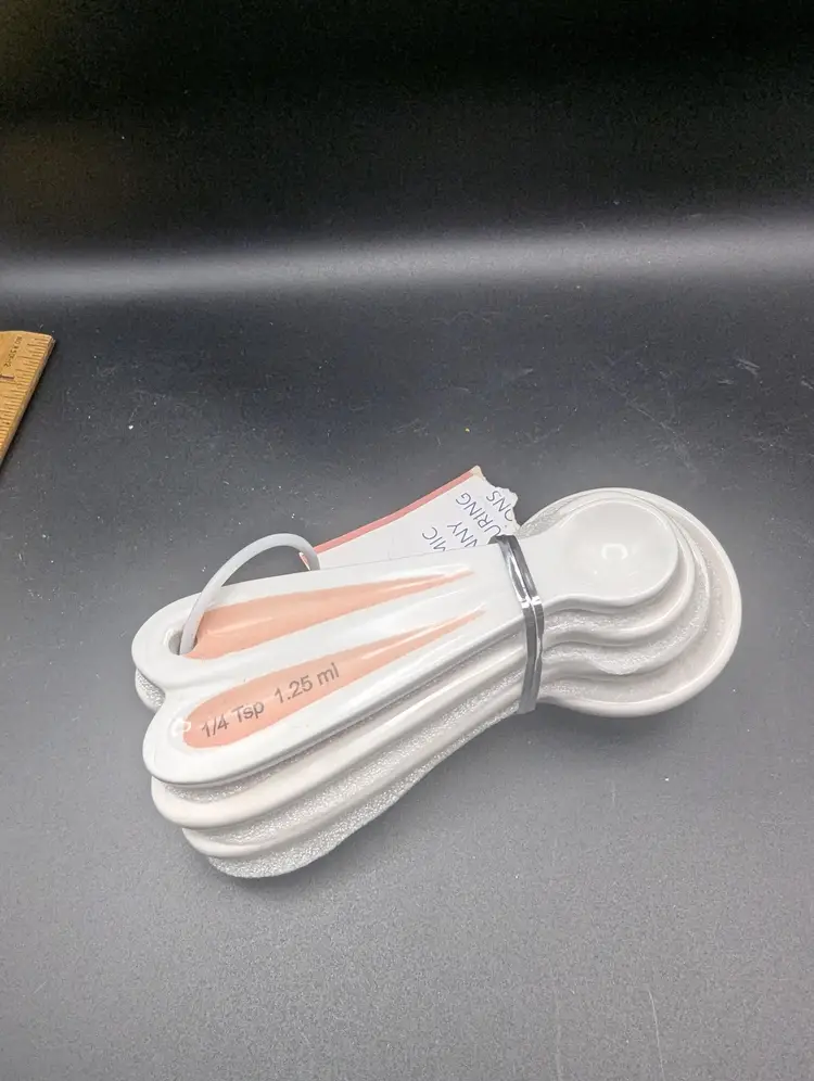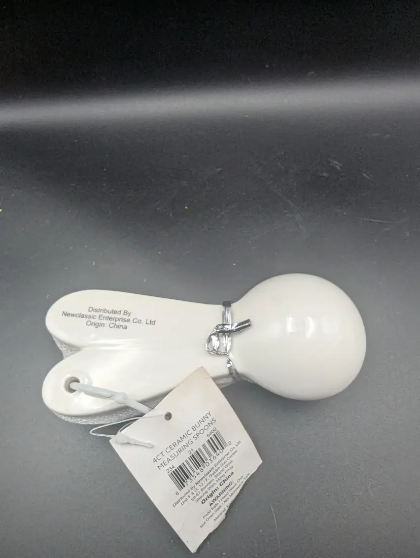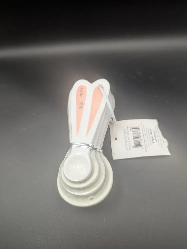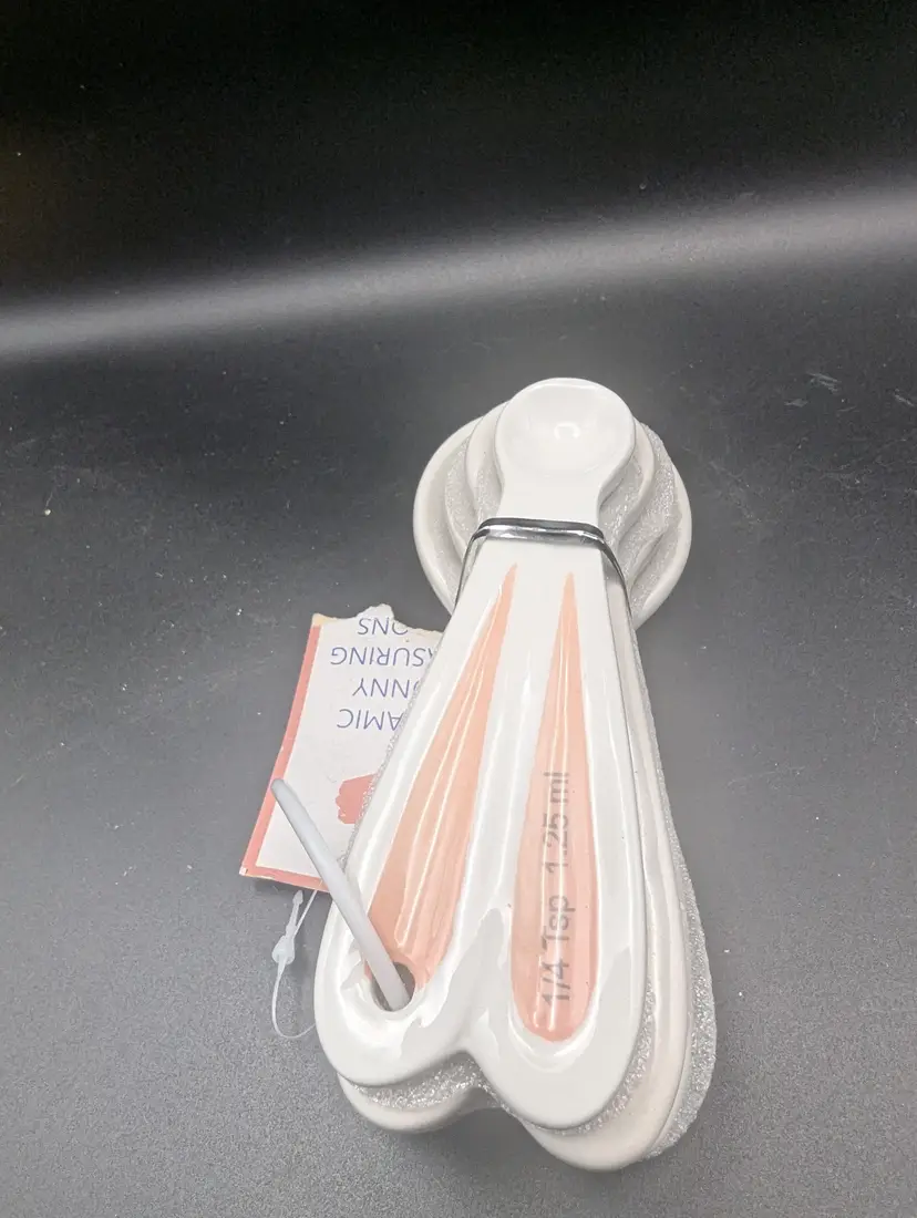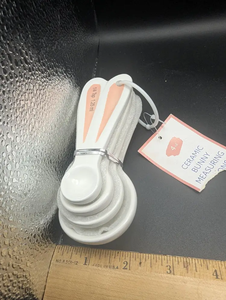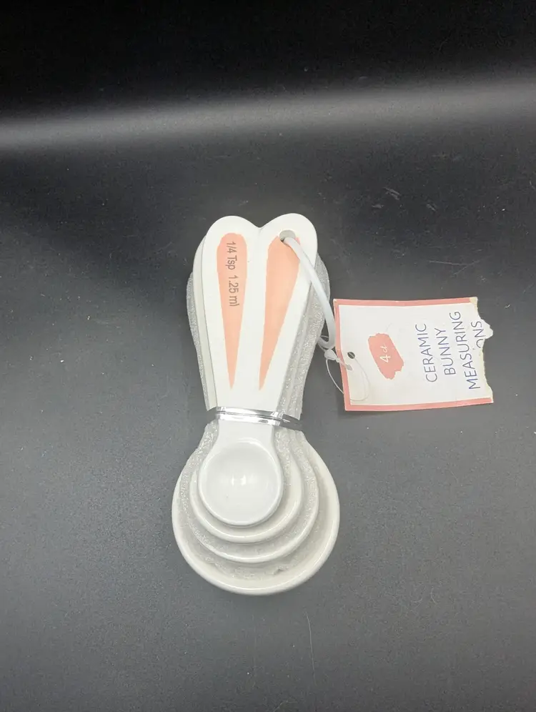 Add a dash of whimsy to your kitchen with these adorable ceramic bunny measuring spoons. Perfect for baking enthusiasts and collectors alike. Please see all pictures for condition and measurements.