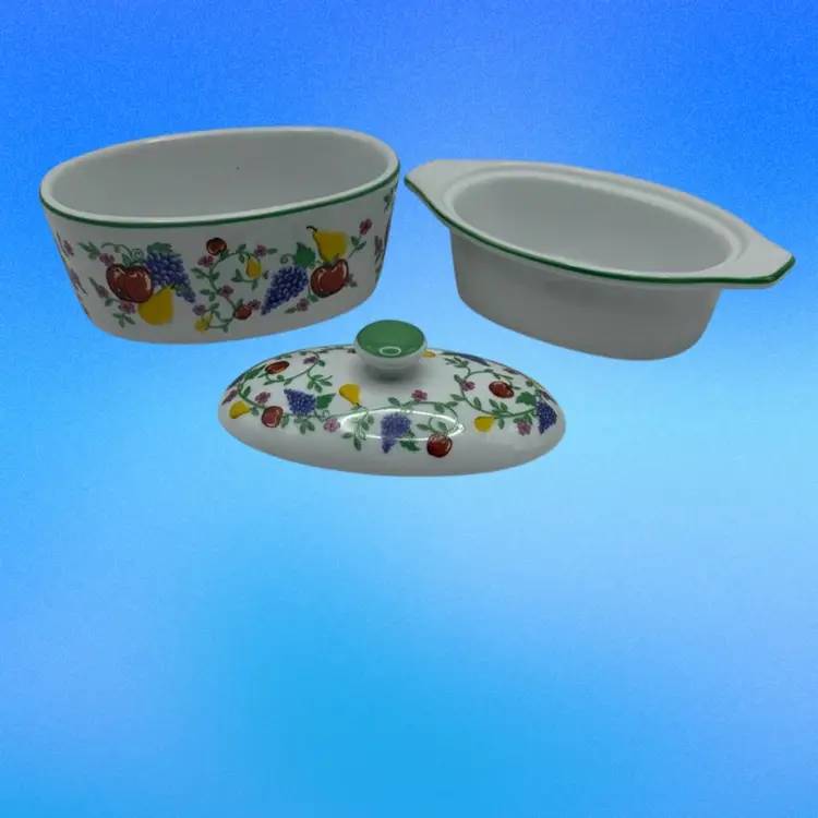 Featuring a whimsical fruit and floral pattern with a green accent on the lid knob and rim. This is a 3 piece set including a base, insert liner and a lid. Mint condition!