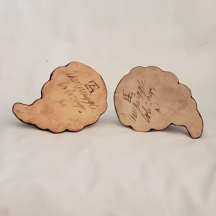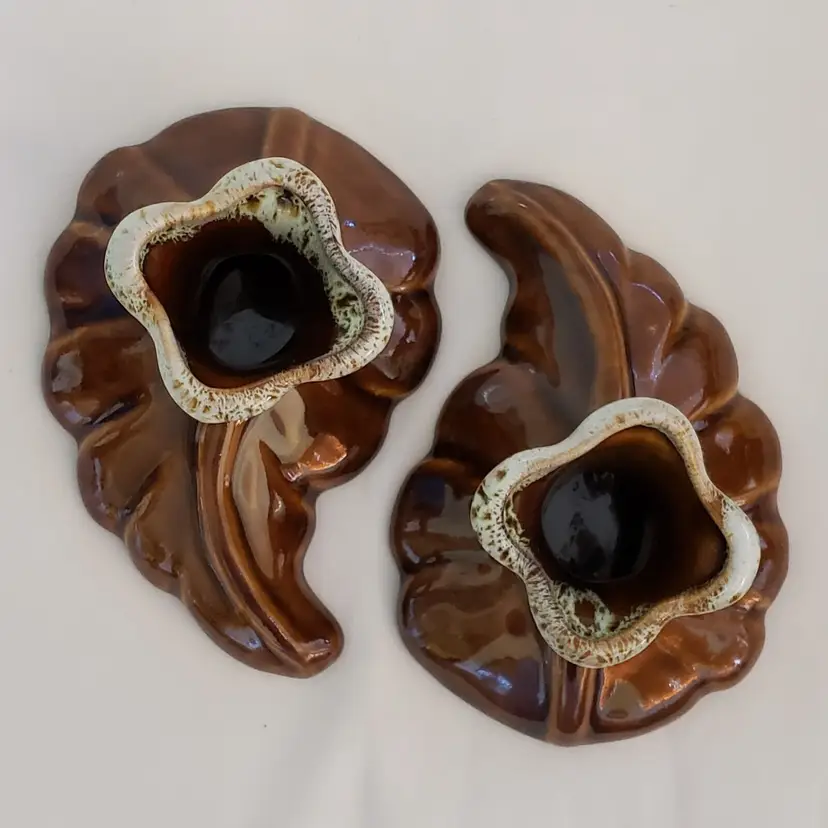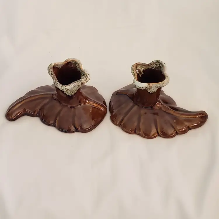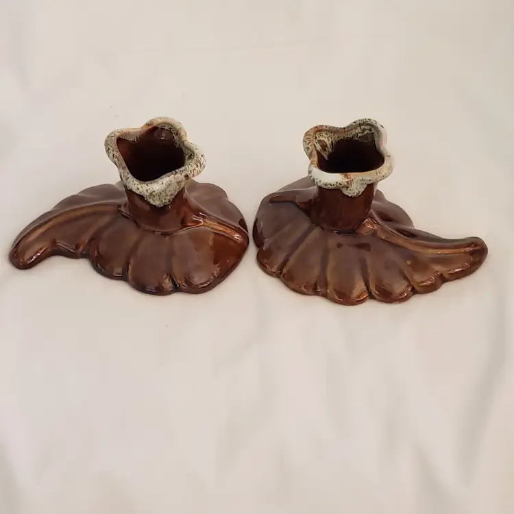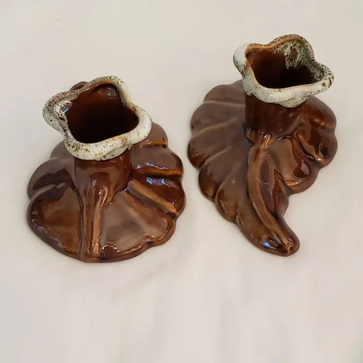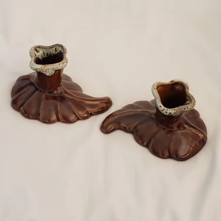 Brand: Anna Van Briggle Antique: No Type: Candle Holder Number in Pack: 2 Color: Brown Original/Reproduction: Original Material: Ceramic, Clay Country/Region of Manufacture: United States Finish: Glazed Subject: Leaf Handmade: Yes