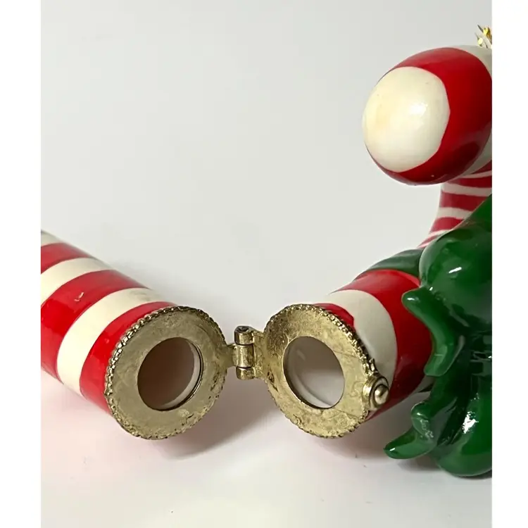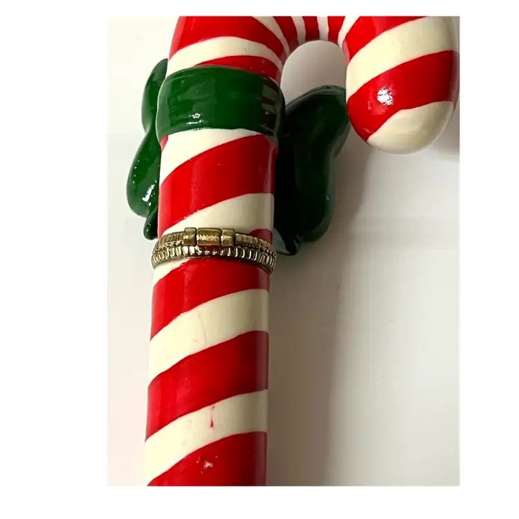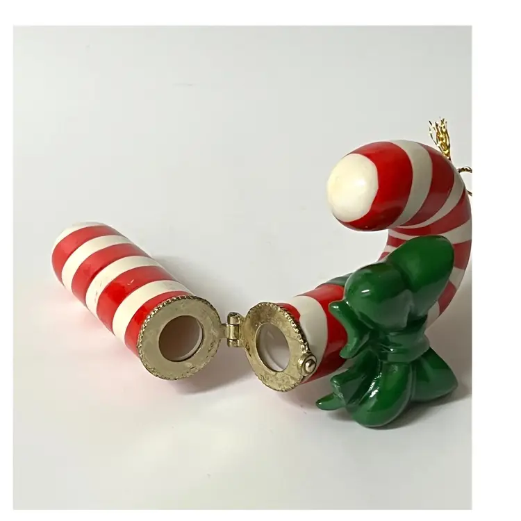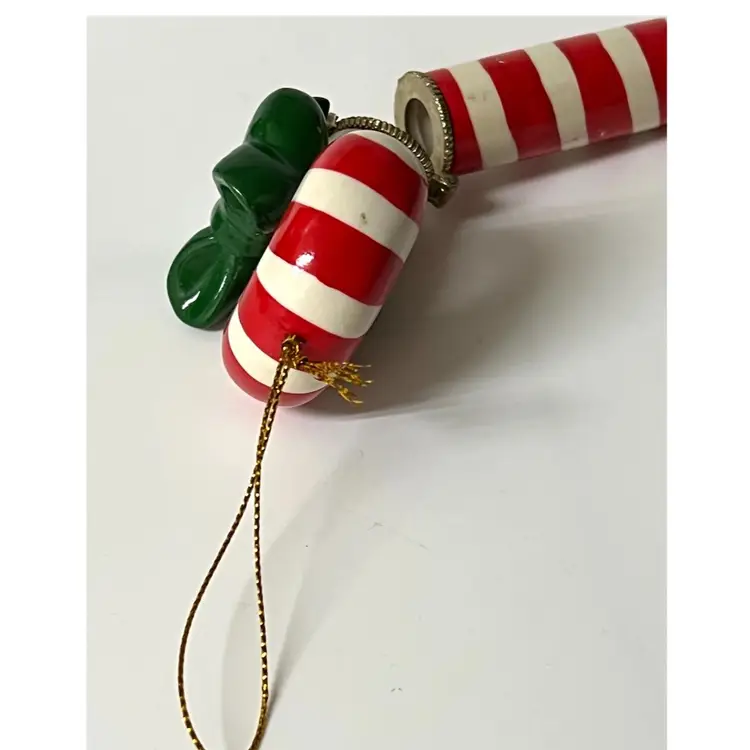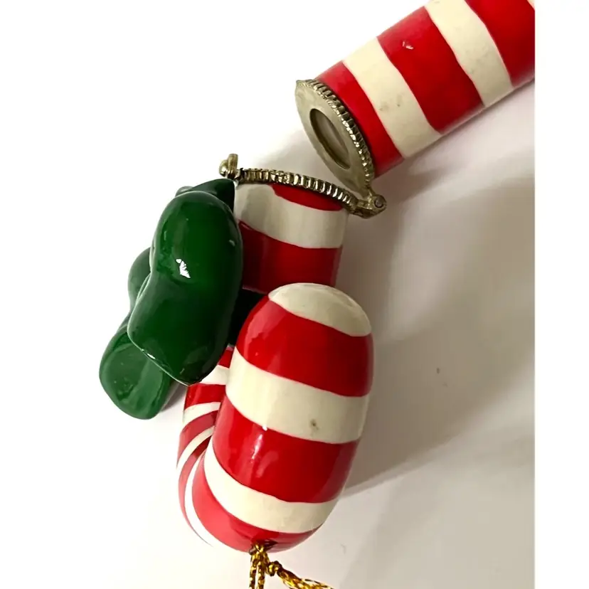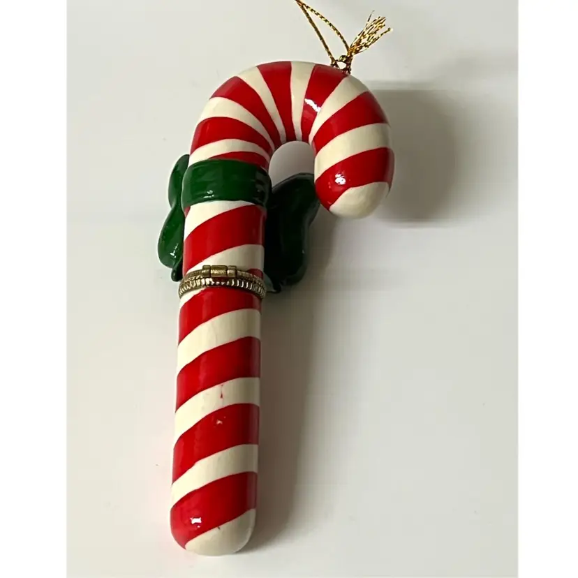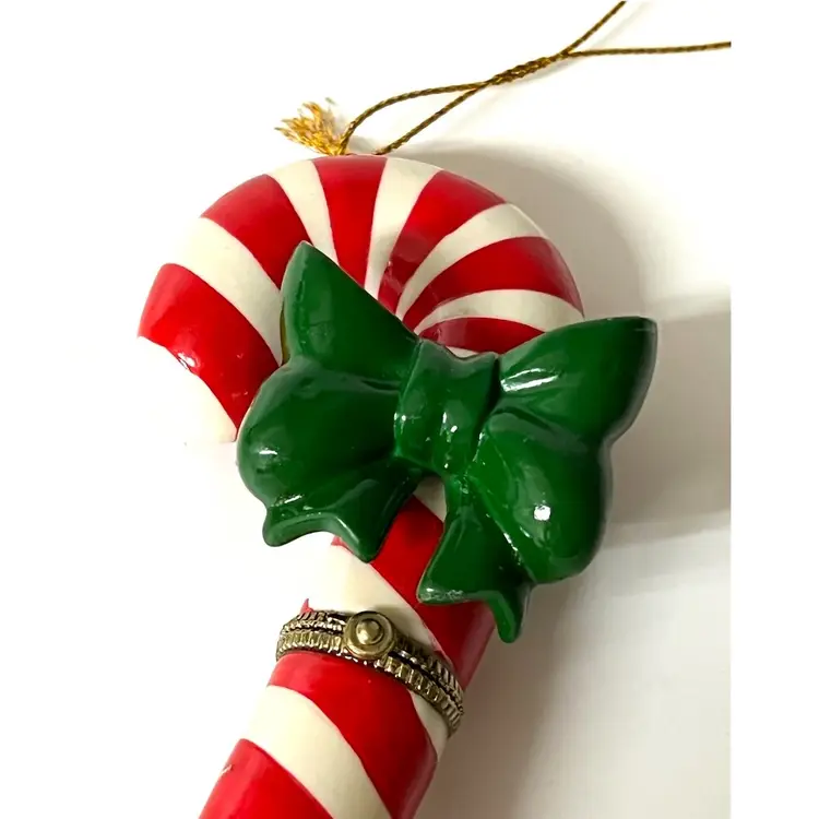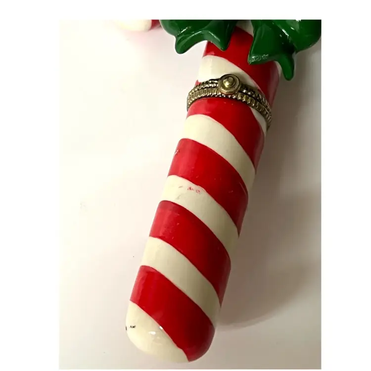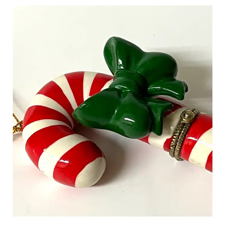 Ceramic Candy Cane Red & White Christmas Ornament Trinket Box Green Bow 5.2 in height. No chips/cracks