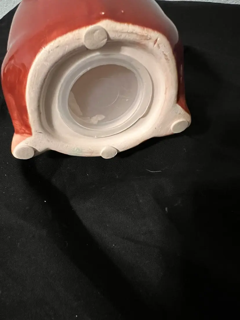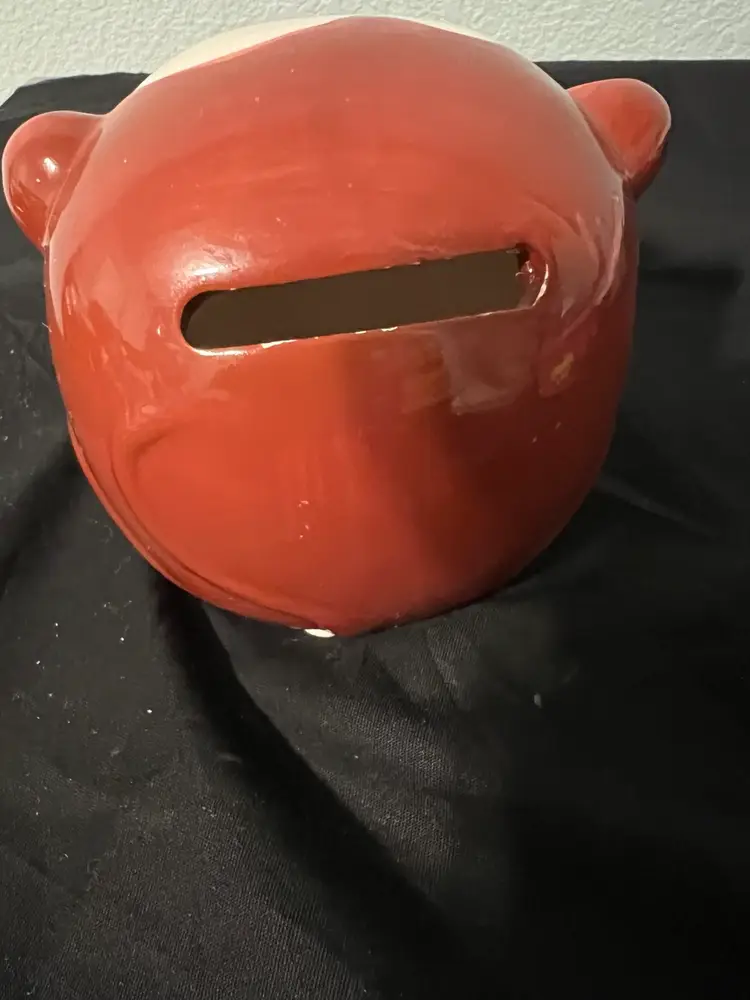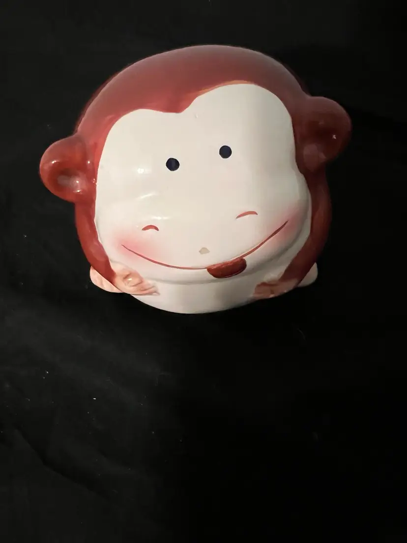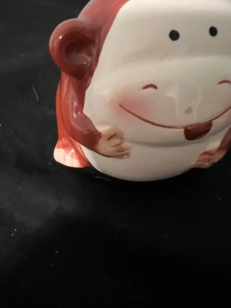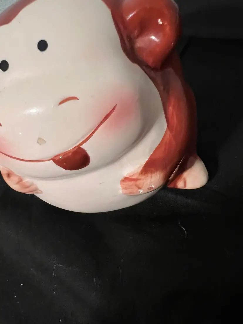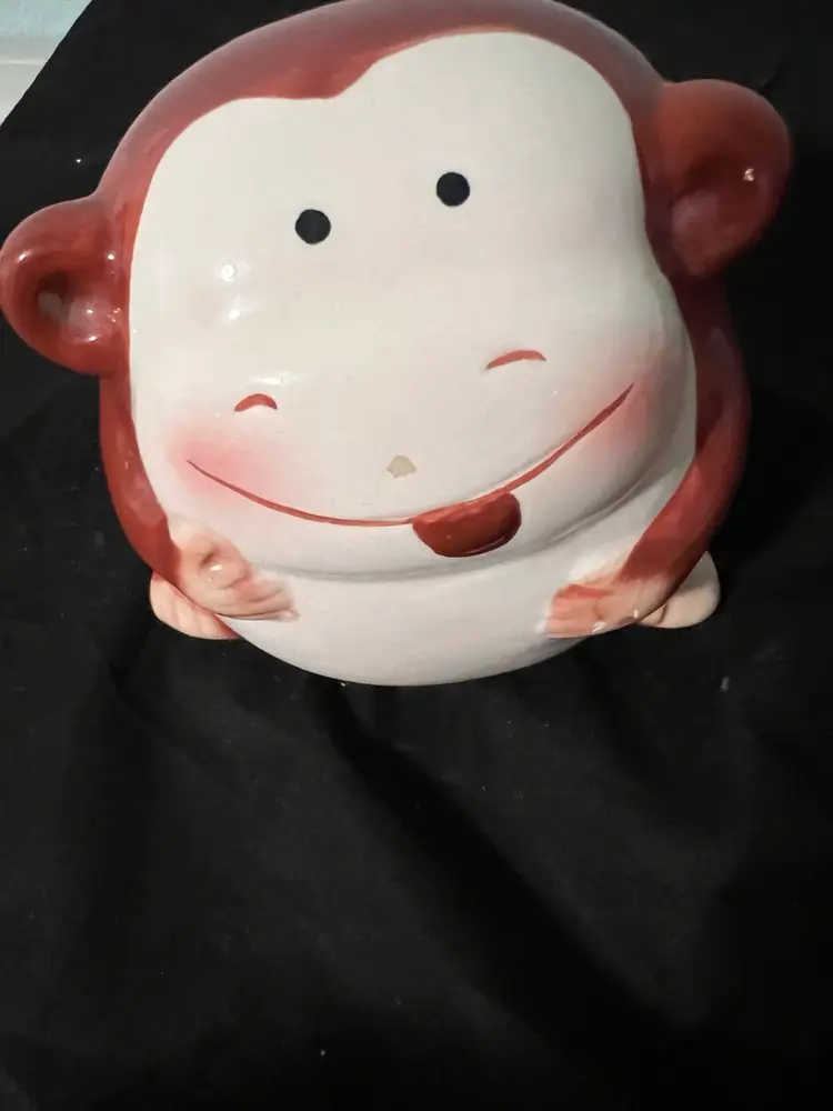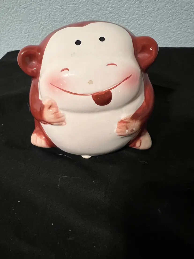 Ceramic pottery, chubby monkey, piggy, bank hand painted with plug. Preowned.