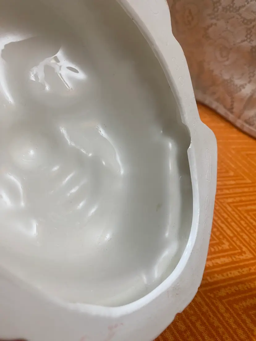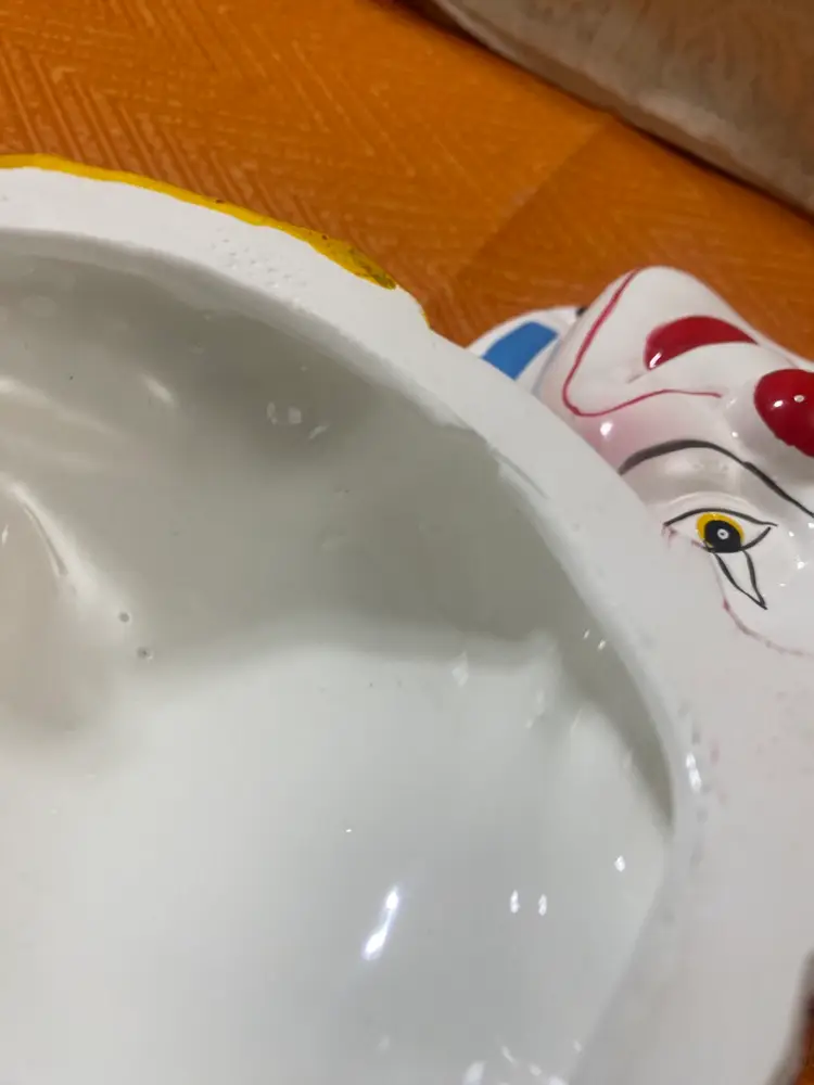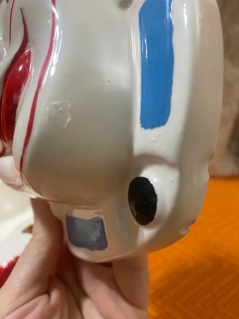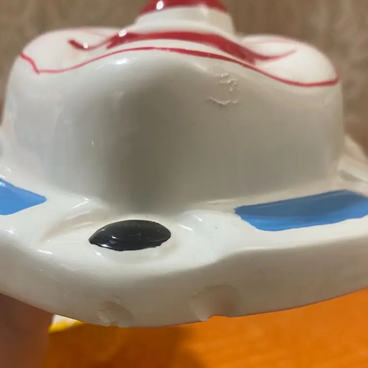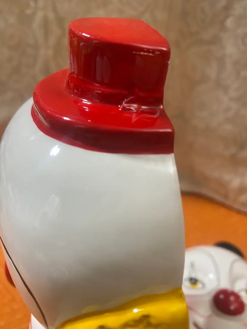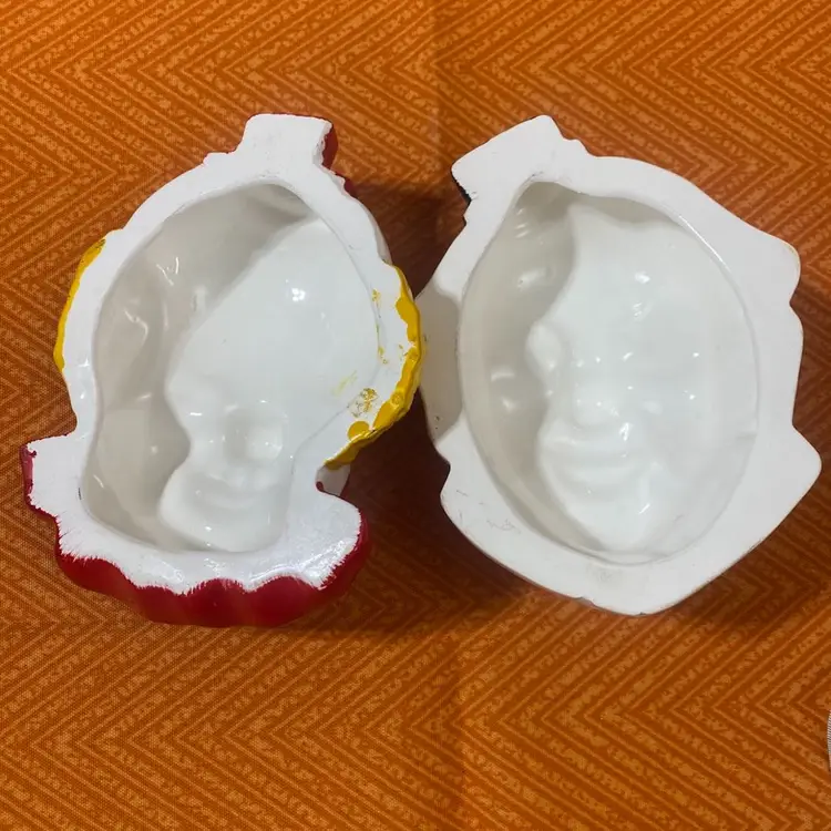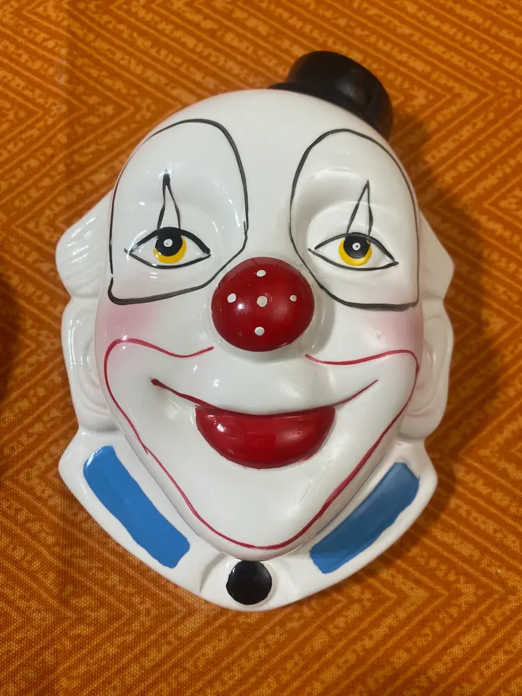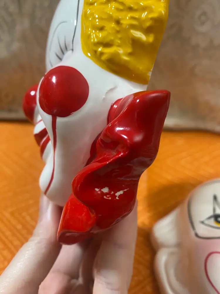 Measures approximately 7” x 5” The Red clown has a little cold paint loss at his collar, as well as the side of his hat, also has one small chip under the lip of the back where it hangs up. Blue clown has a rough spot under chin, and two chips around the peak of the bottom, also on the backside has a chip under the lip where it hangs up (bottom side). Please see photos as it is part of my description.