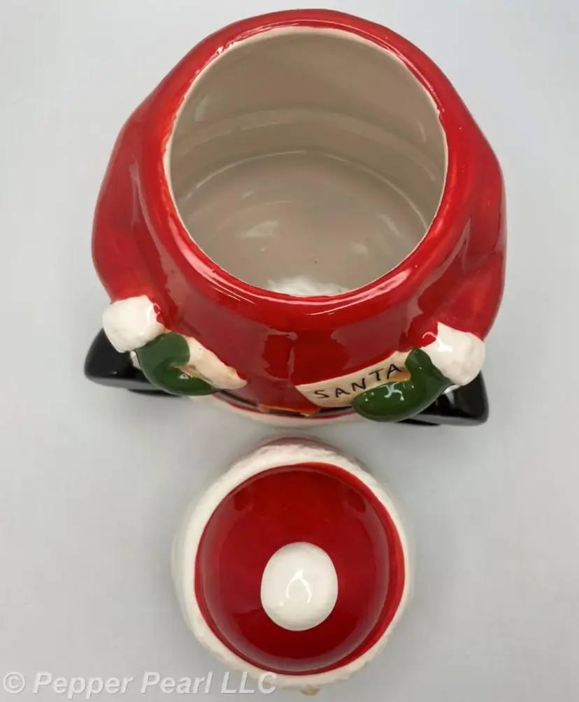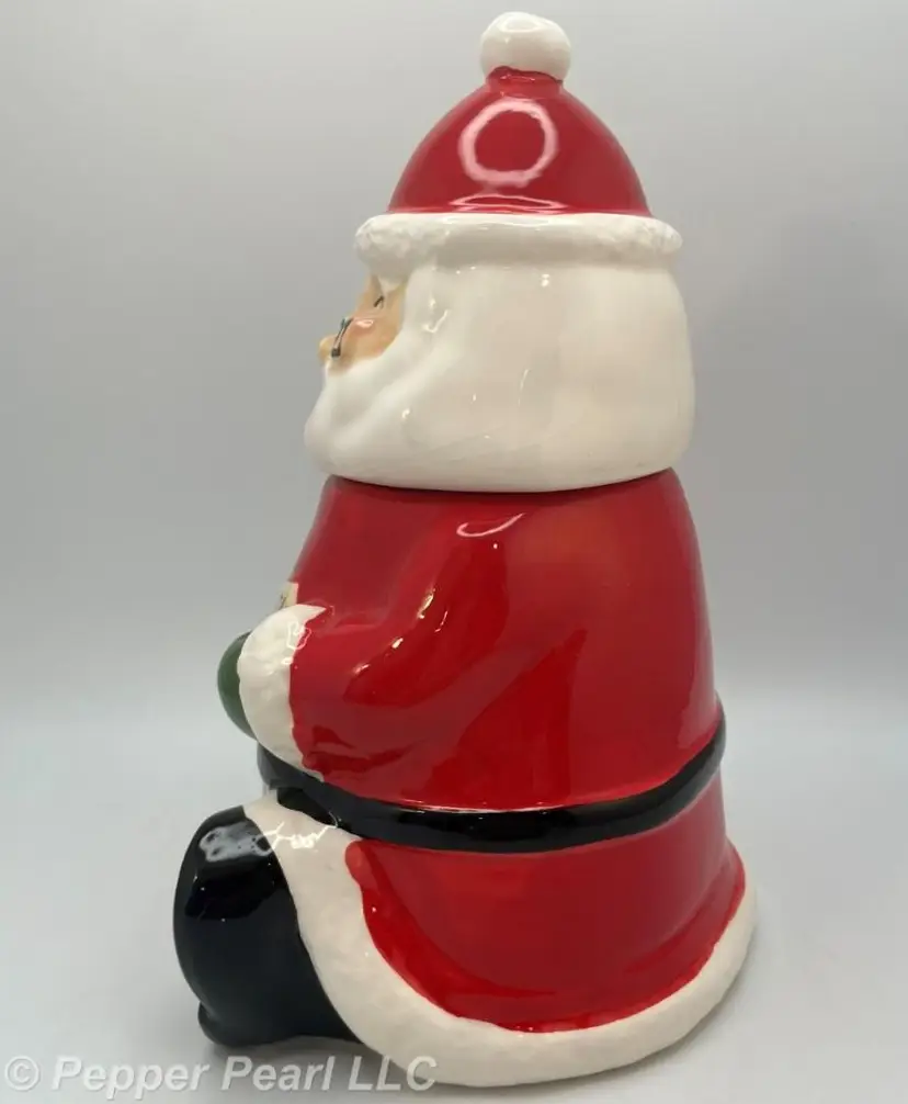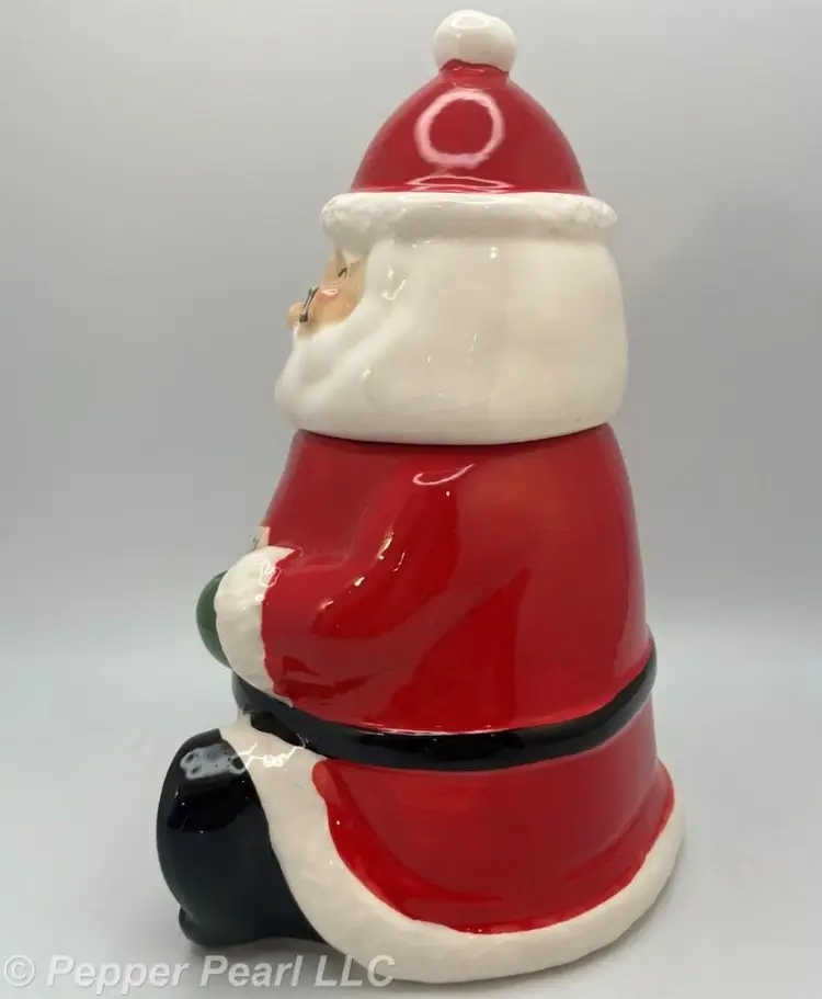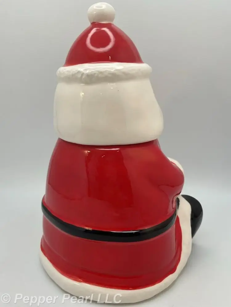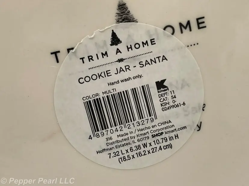 Trim A Home Santa Ceramic Cookie Jar, never used. Kmart Old Stock Measures 7.32" Long X 6.38" Wide X 10.79" High. Jar is 5.5" deep. Hand wash, Made in China Crazing present, no chips or cracks, shelf wear on bottom