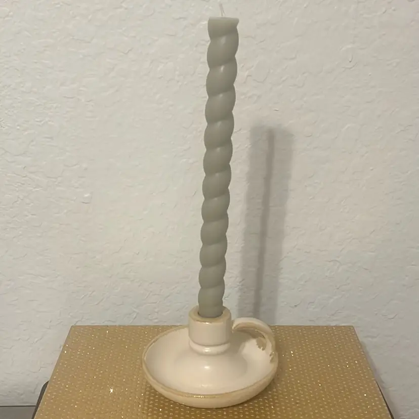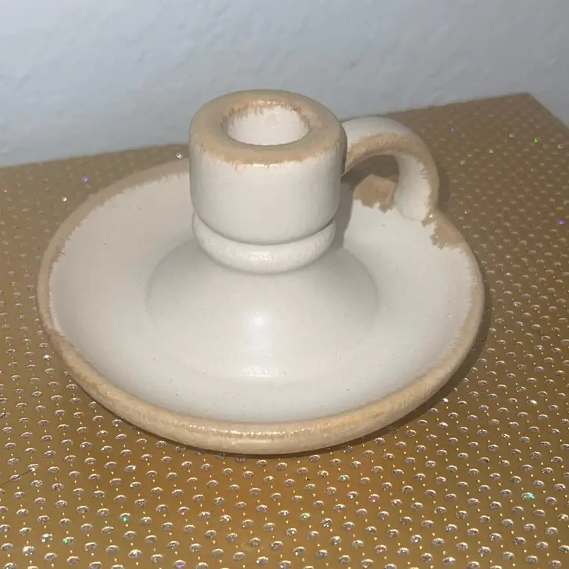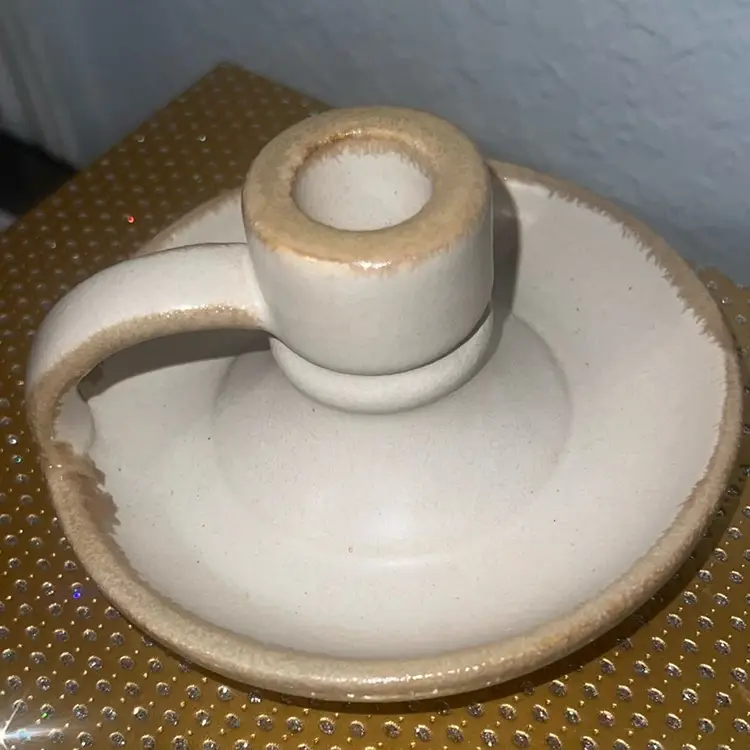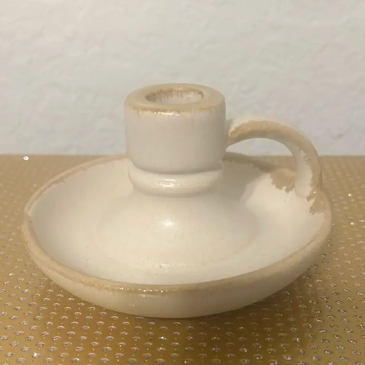 This cream candle holder features rustic hues for a touch of antique style you'll love gracing your space with. Designed with a saucer-like base with a cup-like handle, this ceramic candle holder fits a taper candle, and can be placed on any tabletop. Dimensions: 2.68 Inches (H) x .79 Inches (W) x 4.84 Inches (D)