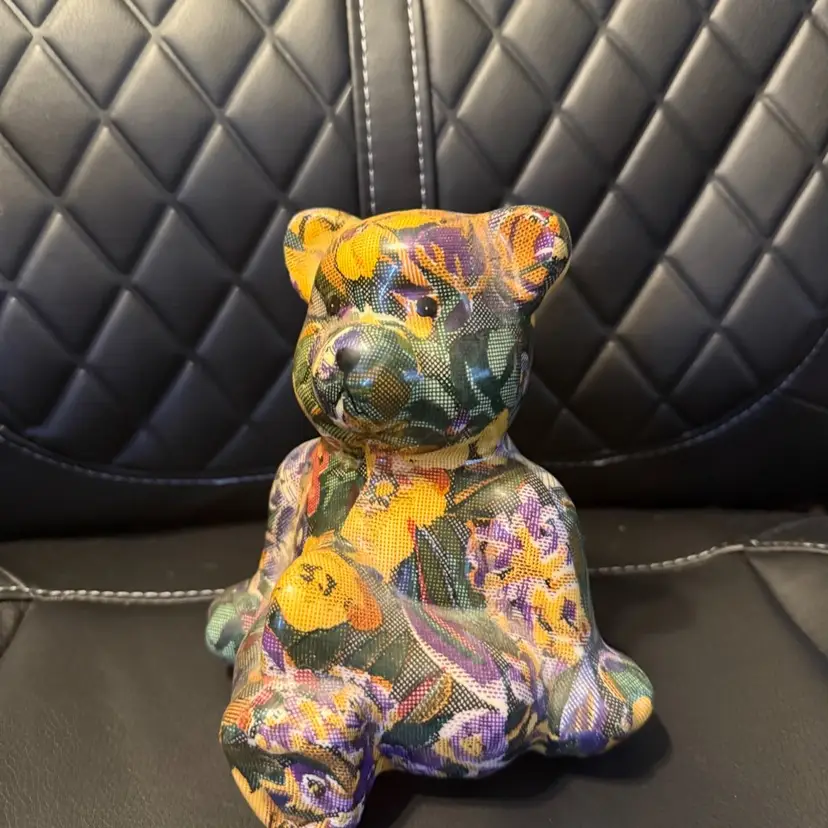 This adorable bear may be Joan Baker as well. Beautiful yellow, purple,and pink flowers with green base. 7in tall