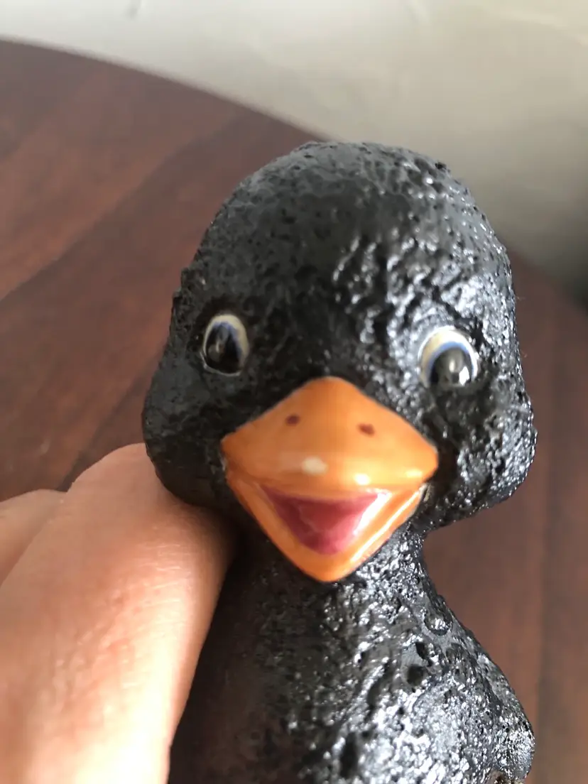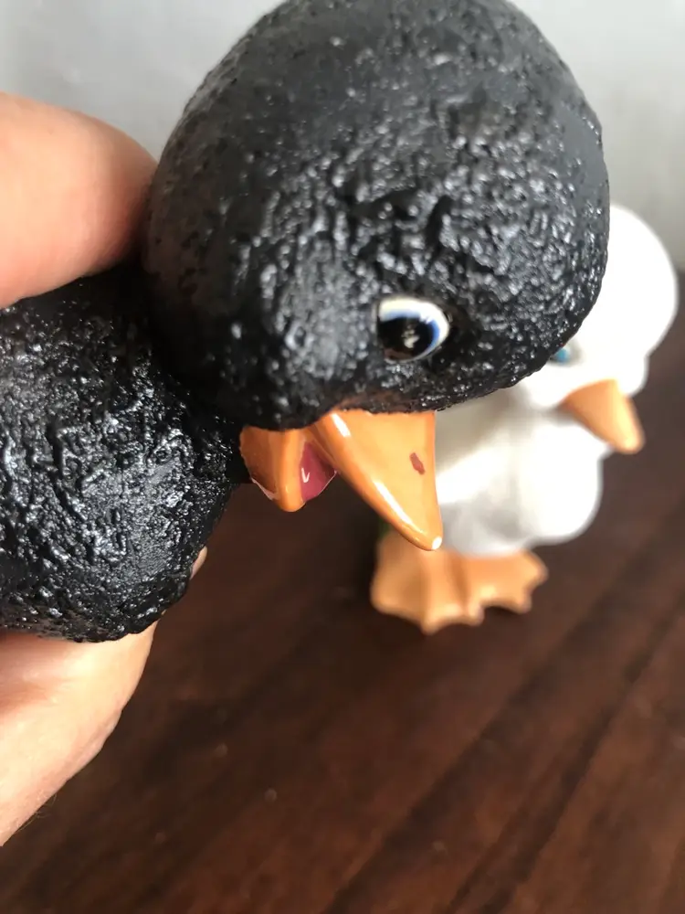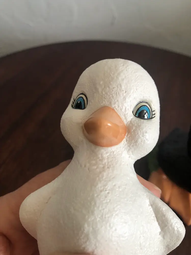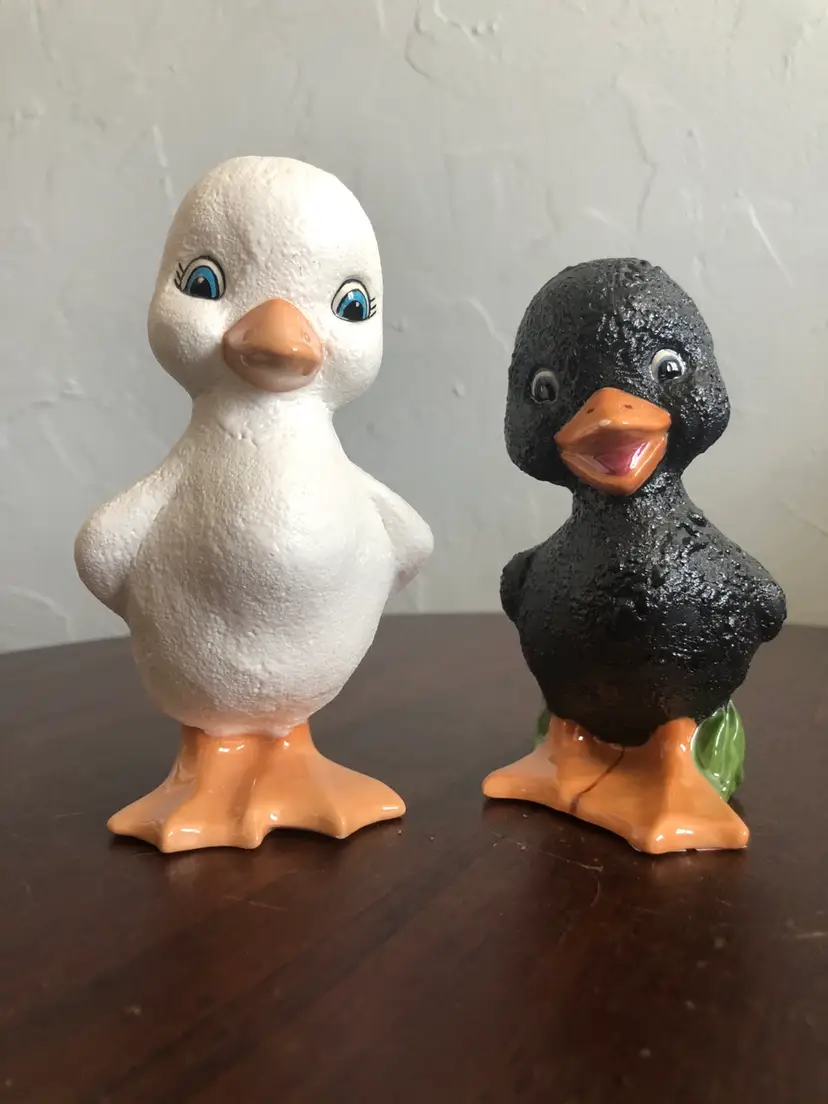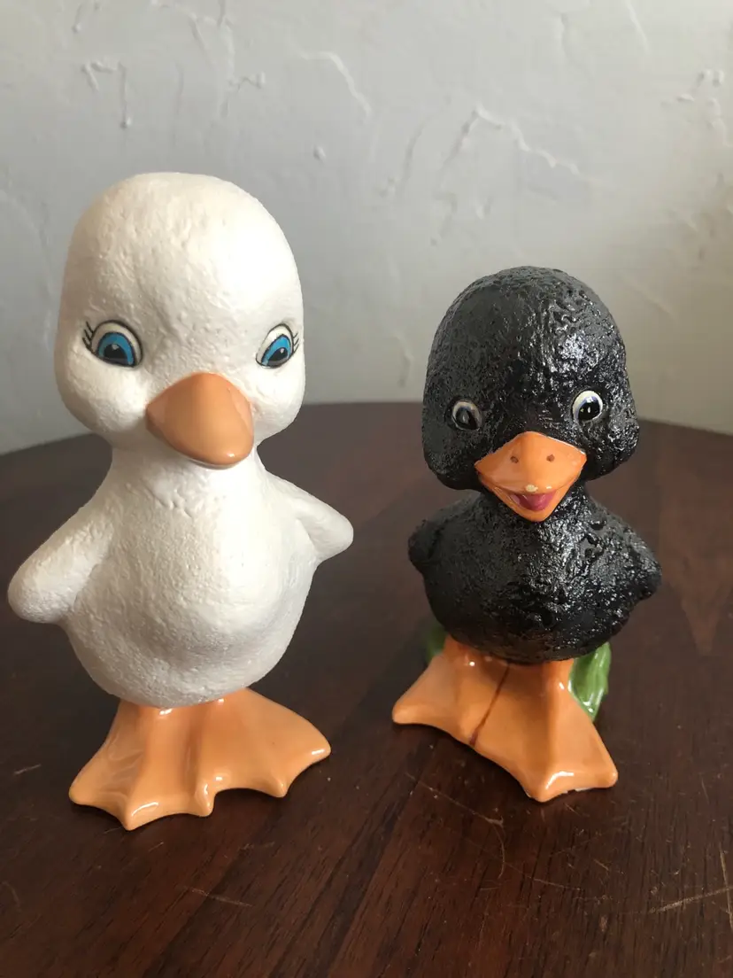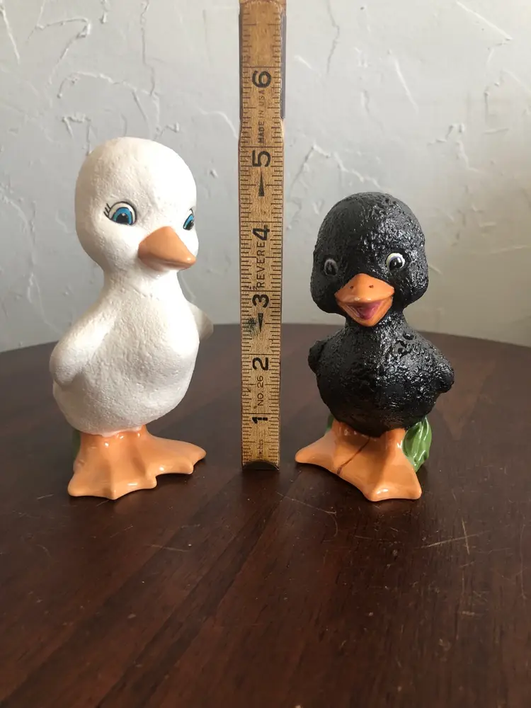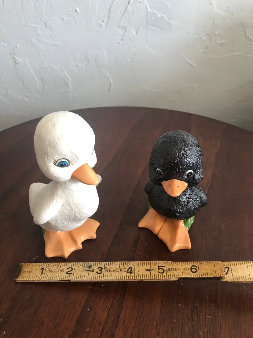 This pair of hand made duckling figurines are nicely made. Appears they are made from a mold and hand painted. One grimy paint loss chip on beak, see pictures. One is about 5” tall and the other about 4.25” tall. Super cute and nicely textured and painted.