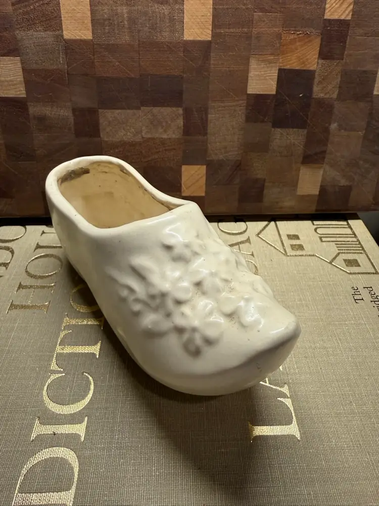 Vintage Ceramic Dutch Clog Shoe Planter, Cream Ivory Glaze — Decorative Trinket Dish. This charming vintage piece features a classic Dutch wooden shoe silhouette crafted in ceramic with a floral relief pattern on the toe. Finished in a versatile cream-colored glaze. Perfect as a small planter for succulents, a vanity trinket holder, or a bookshelf accent. Shows some signs of age and previous use consistent with its vintage nature, including some light interior surface marks as shown in photos. No major chips or cracks visible.