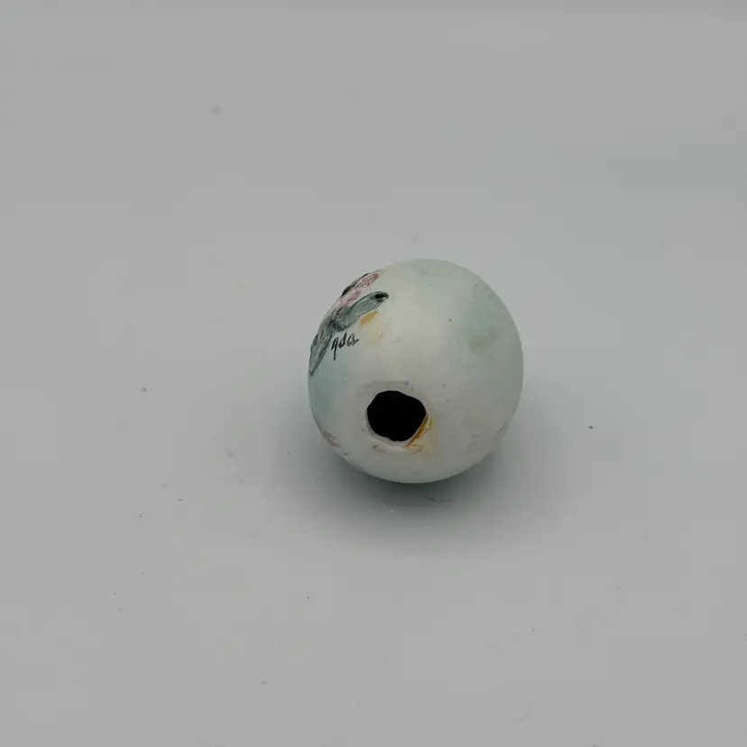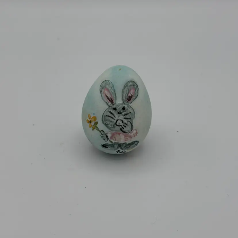 Ceramic Easter egg with Bunny Rabbit wearing a hat sitting on an egg surrounded by flowers. 2" Tall. No chips/cracks.