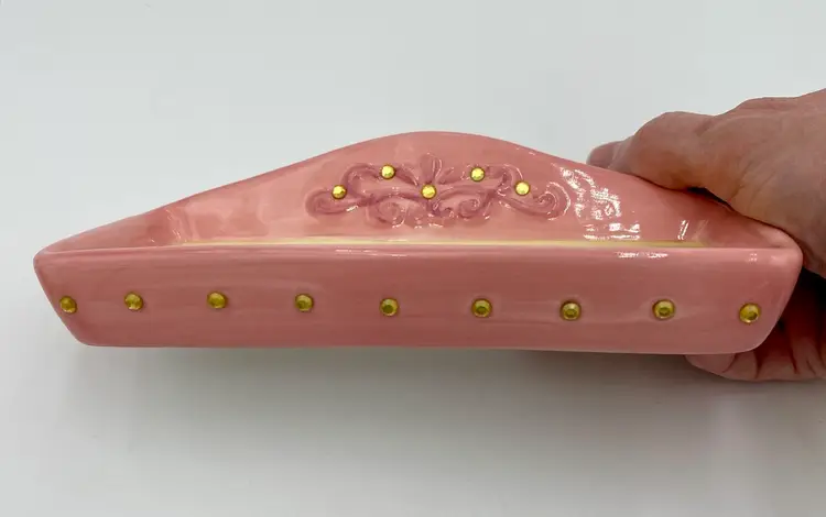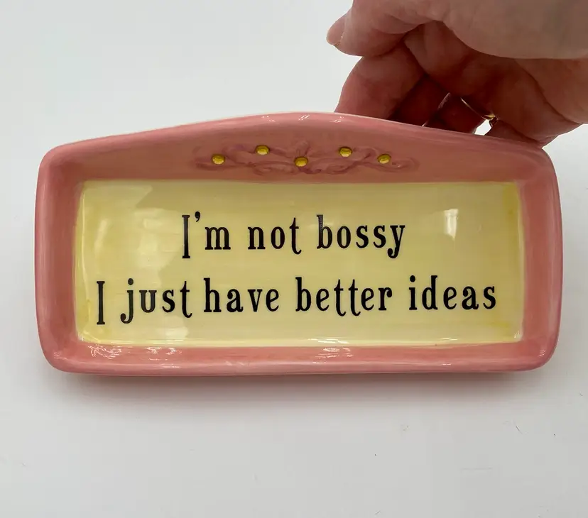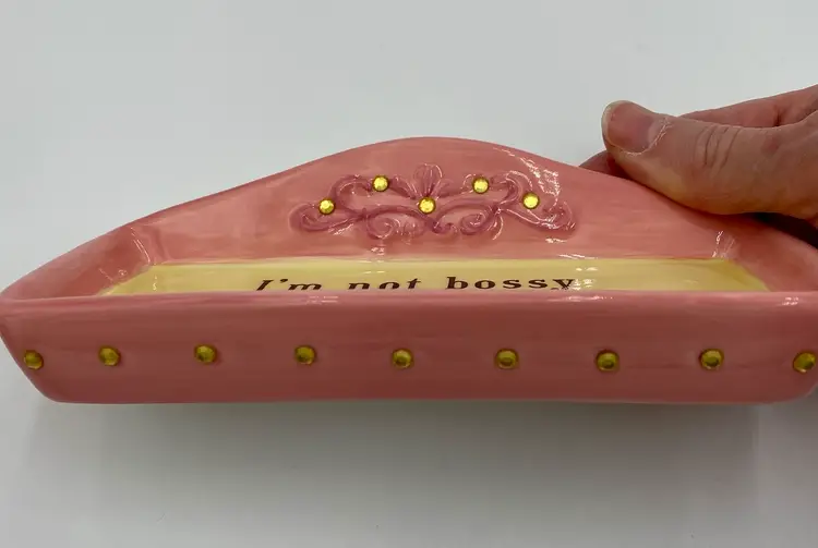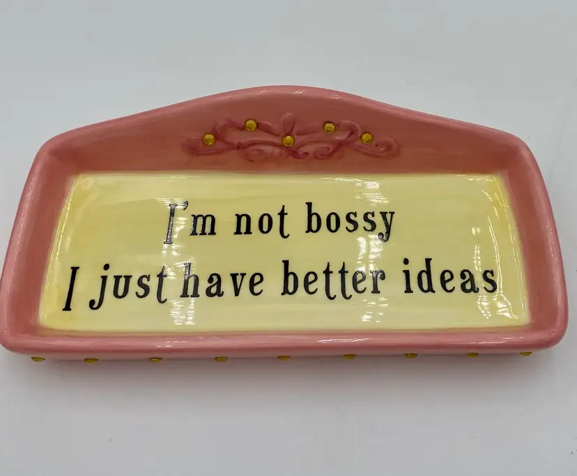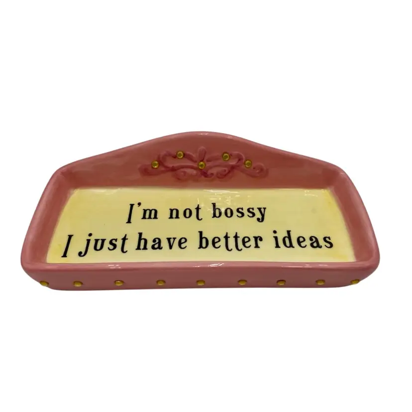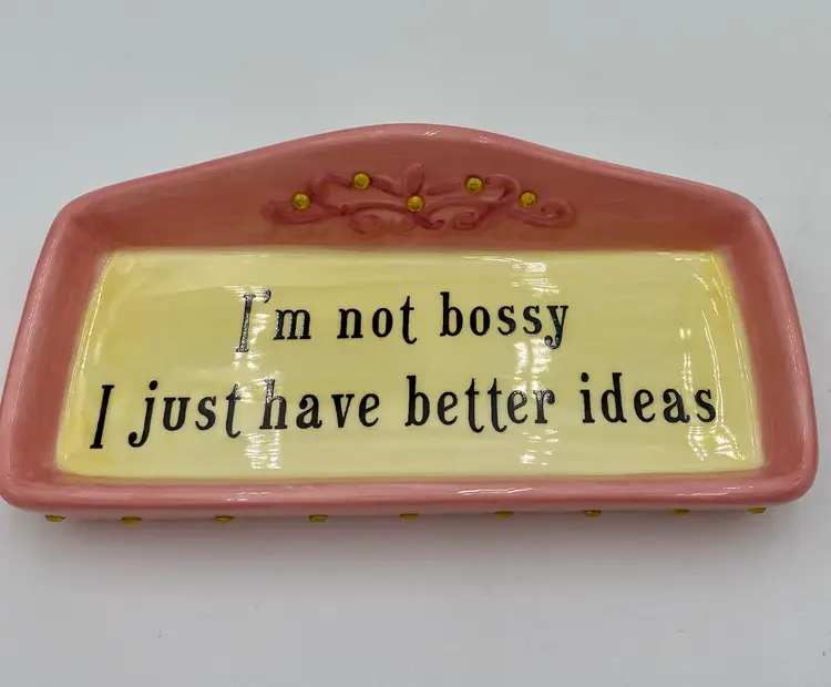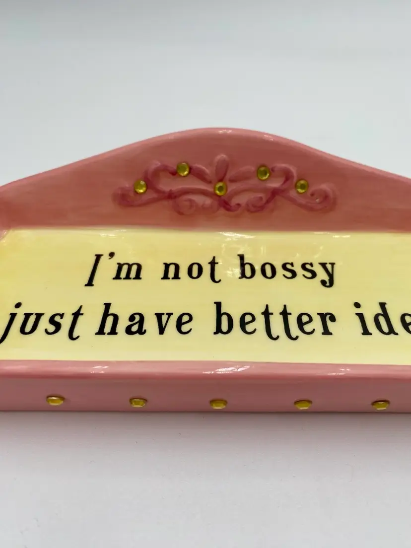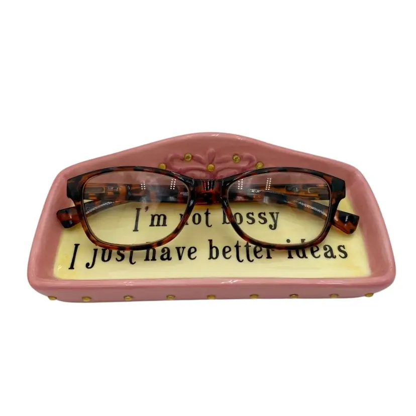 This cute glasses tray/holder says, "I'm not bossy I just have better ideas" on the base of the holder. There is an embossed pink scroll on the back portion that contains 5 yellow rhinestones. The front side has an additional 9 yellow rhinestones, tying together the overall pink and yellow color palette. It's a cute way to keep track of your glasses!