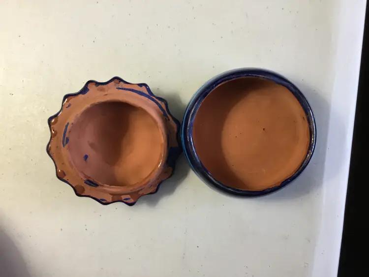 Colorful, cheerful flower trinket dish. 3" wide, 2" high, sunny African sunflower dish. Terra cotta ceramic with 3 shades of blue glaze, red and yellow petals, smiling face. Some blue glaze is on the inside of the cover and on outside of the bottom.
