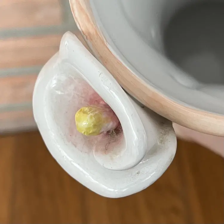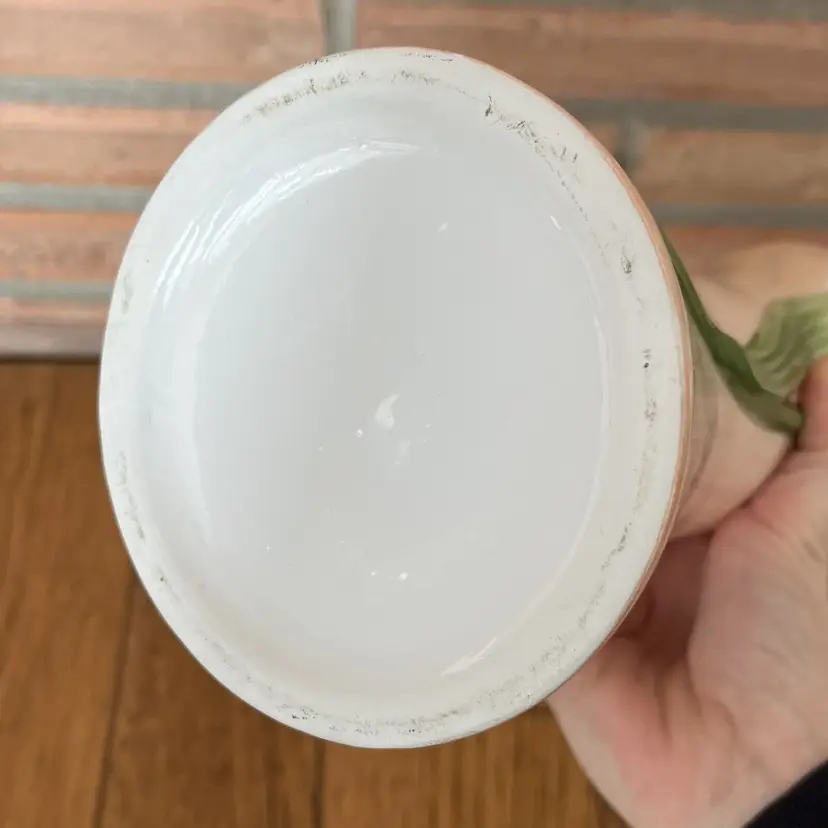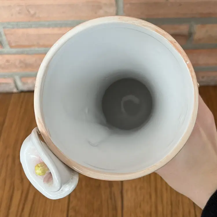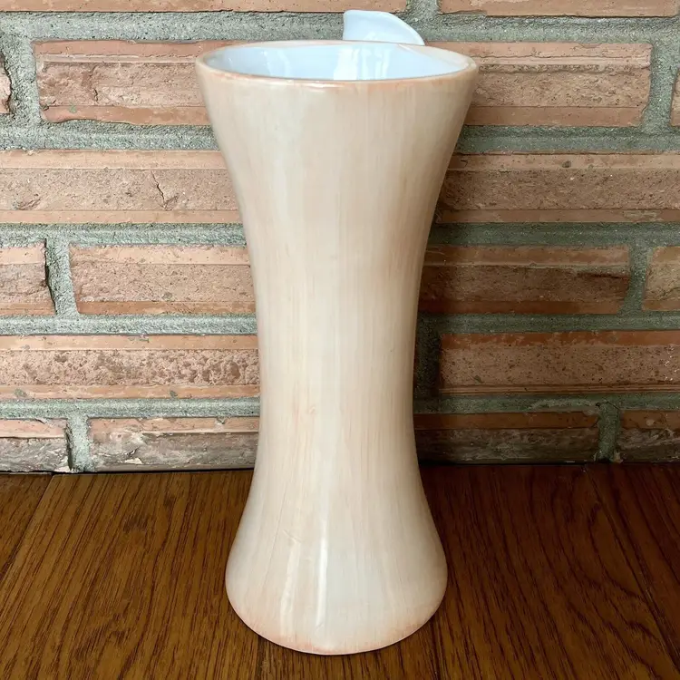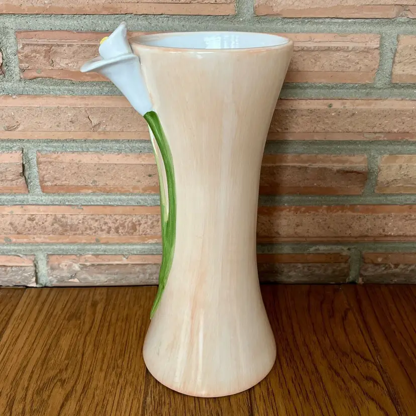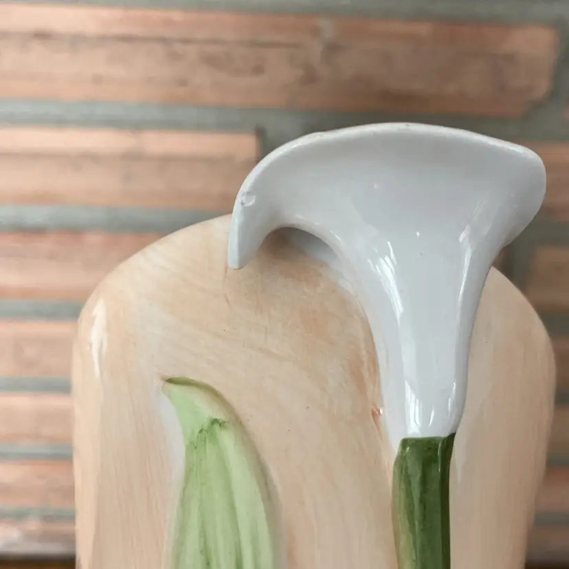 This listing is for a tall ceramic flower vase. Features a figural white Calla Lily along the front of an hourglass shaped pink vase. Not marked, does have what appears to be small paint chips on the flower as pictured. Measures 9.5" tall and 4" across the top.
