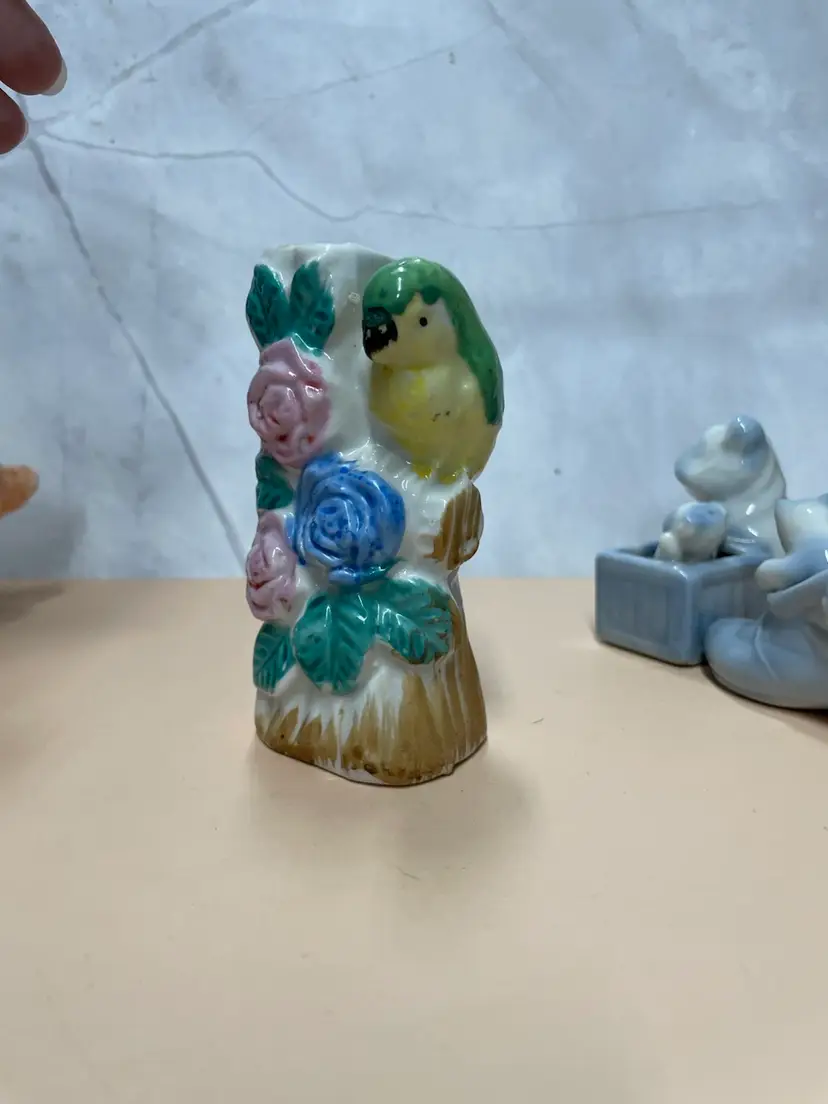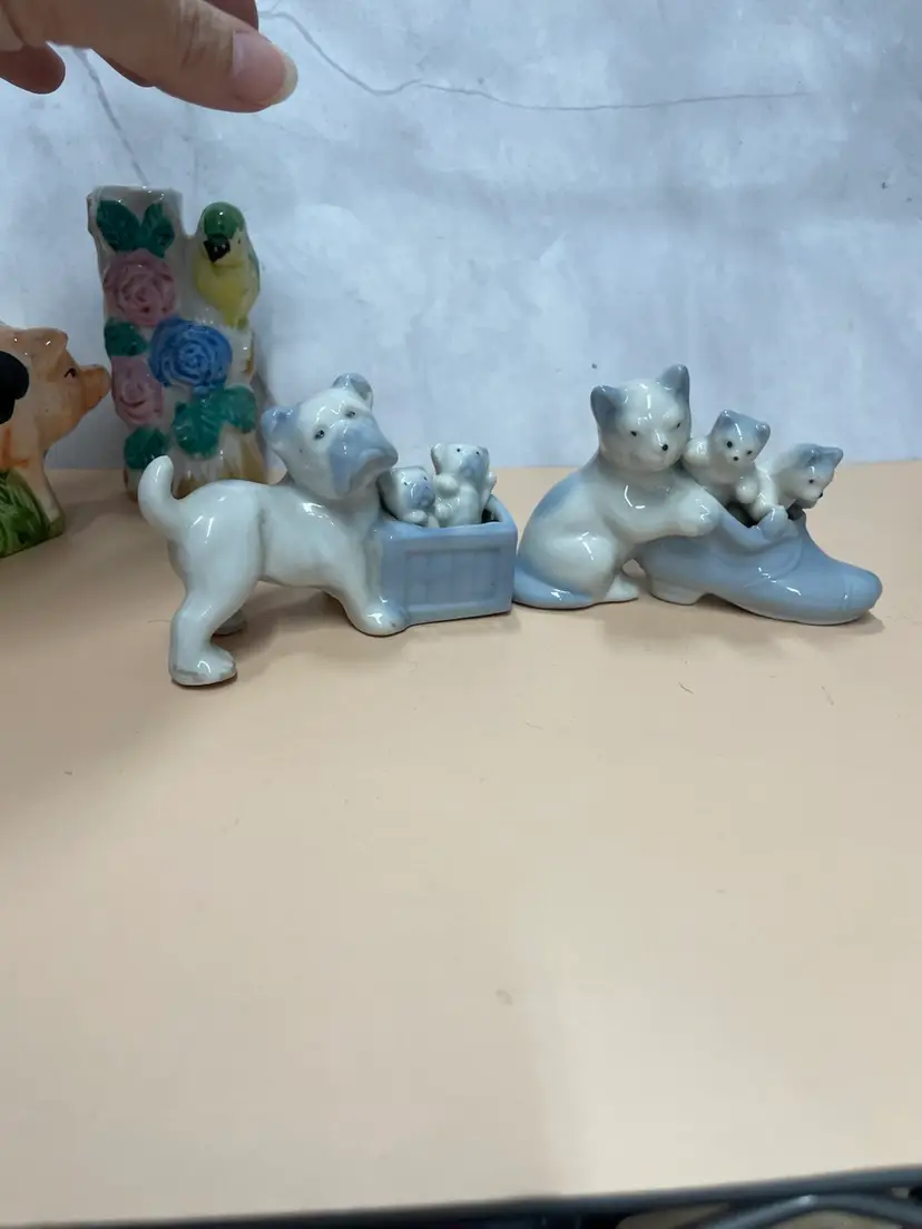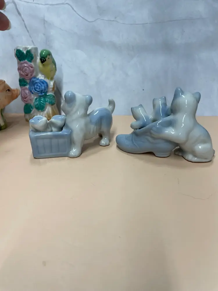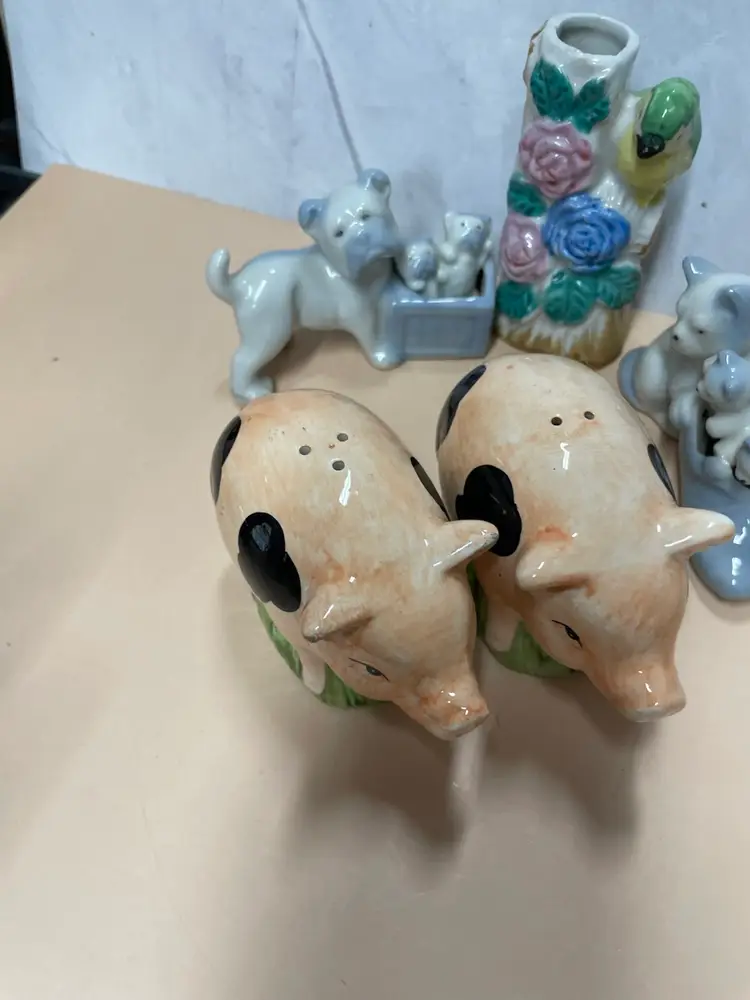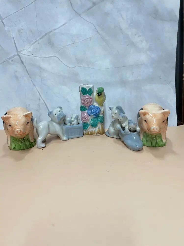 Pink and black, ceramic pig, salt and pepper shakers – one pig has flea bite, surround its ears and snout. Made in Japan, parrot and flow Bud vase with some minor cracks around the top. Made in Japan, blue and white, ceramic cat and kittens and dog and puppies.