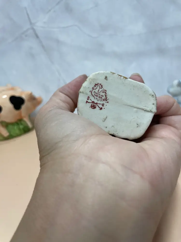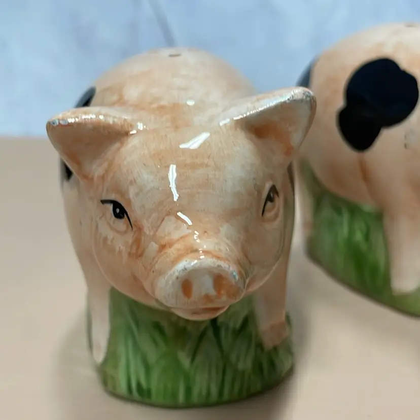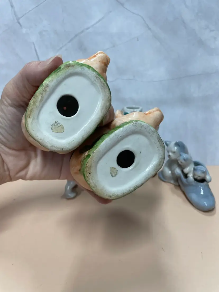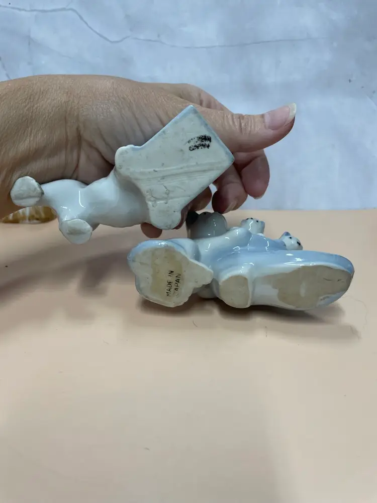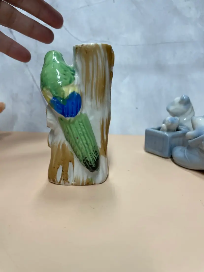Pink and black, ceramic pig, salt and pepper shakers – one pig has flea bite, surround its ears and snout. Made in Japan, parrot and flow Bud vase with some minor cracks around the top. Made in Japan, blue and white, ceramic cat and kittens and dog and puppies.