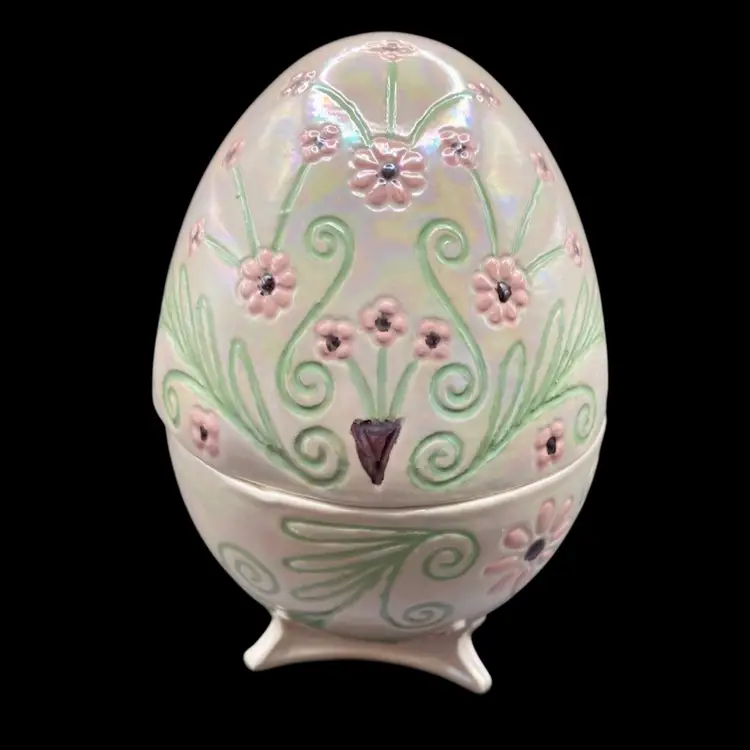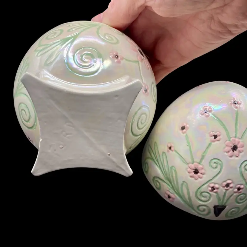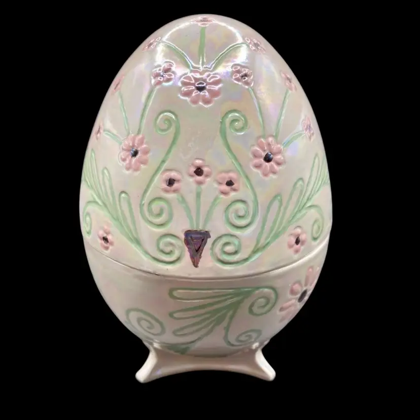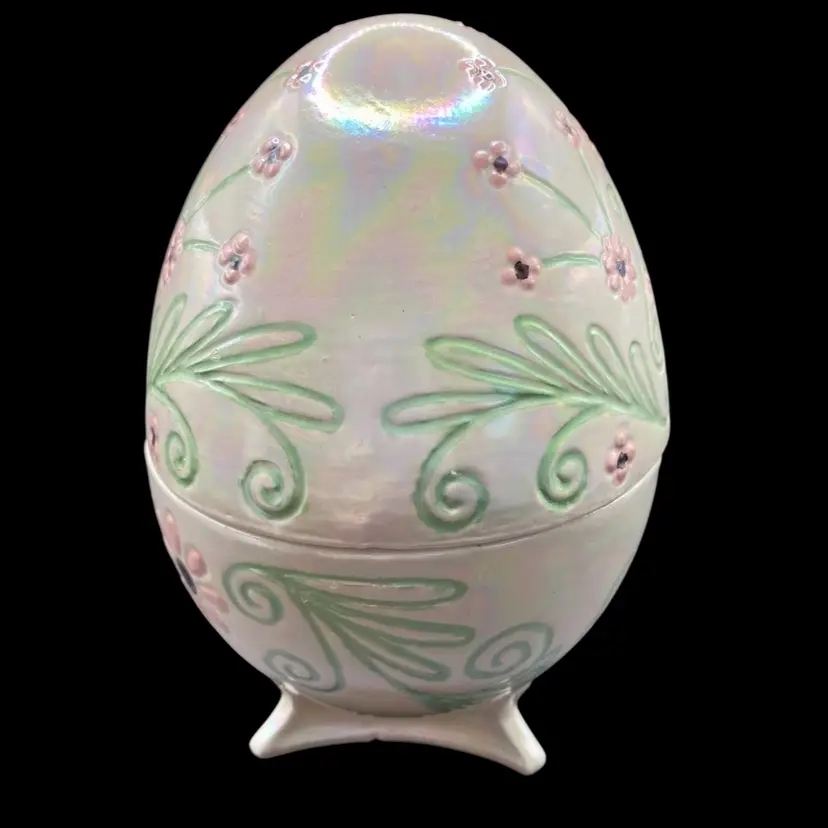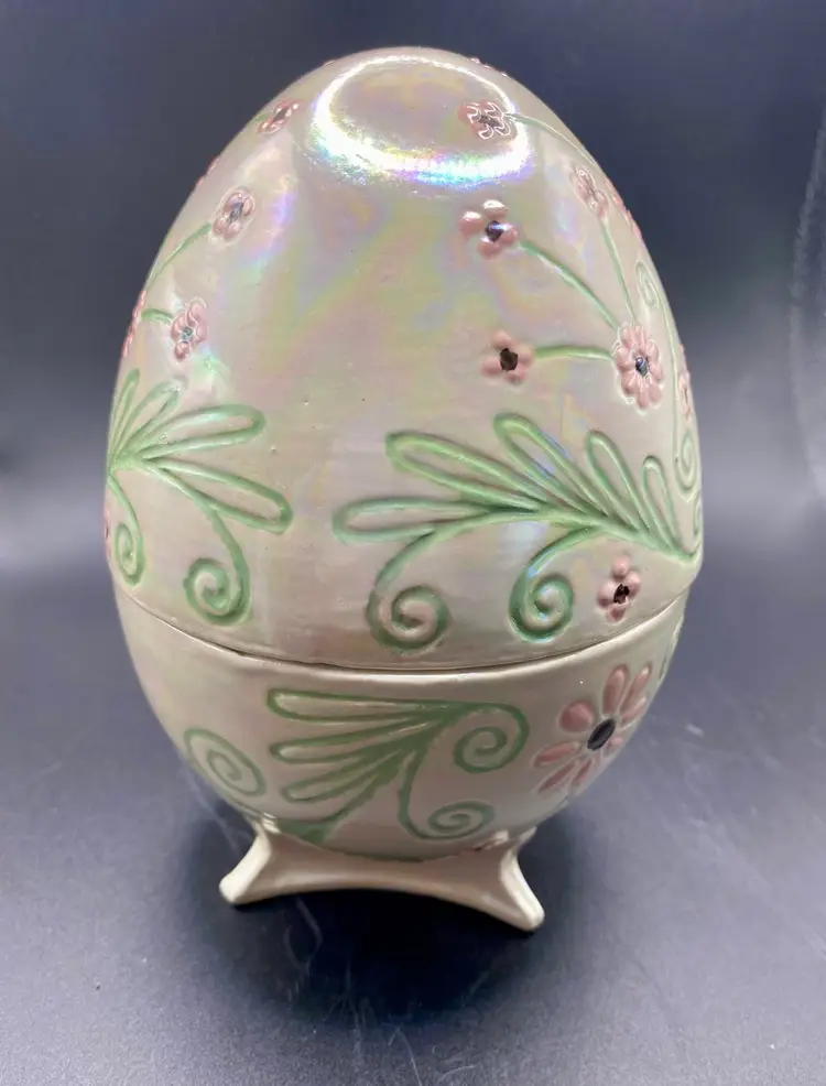This eye-catching Ceramic Footed Easter Egg has an iridescent shell that reflects light beautifully. It is hand-painted with pink flowers with soft black accents and curled green foliage. The piece is just over 6 inches tall and 13 inches in circumference. It can be used at Easter for candies and other treats as well as throughout the spring and summer as a decorative item. The decorator signed the piece on the bottom (see picture).