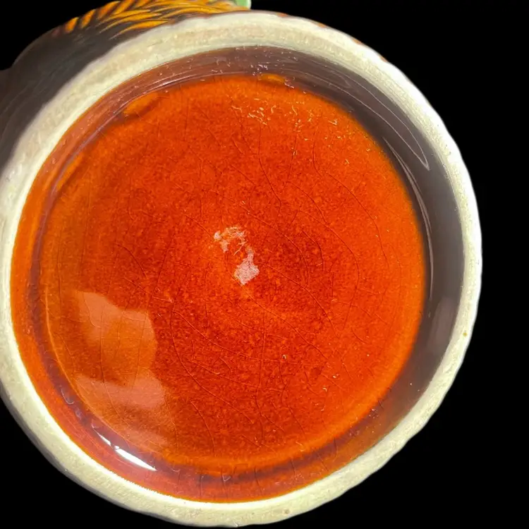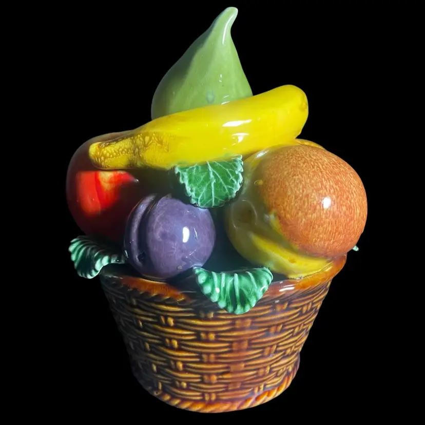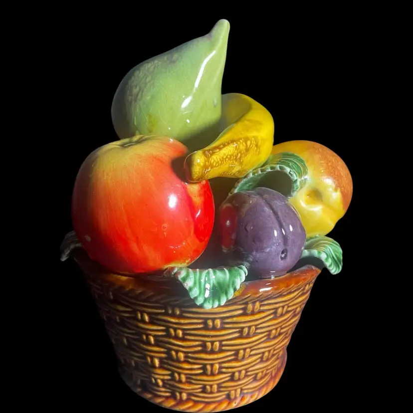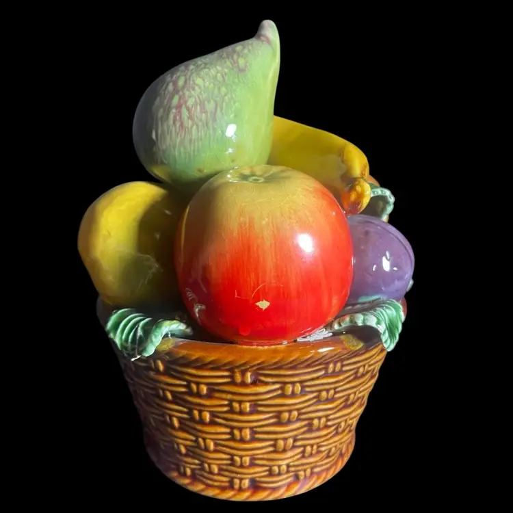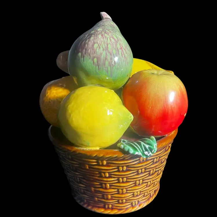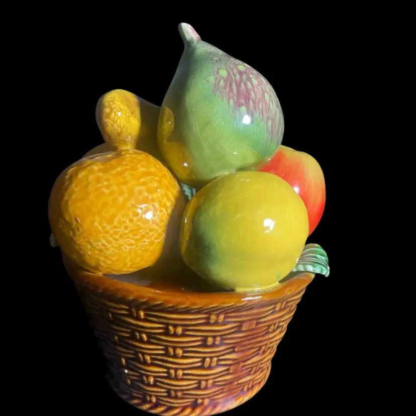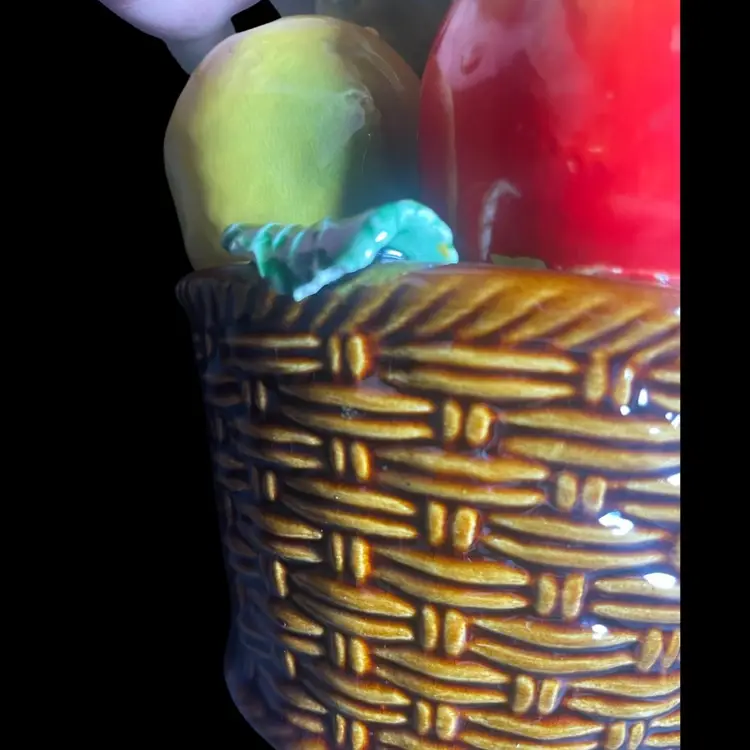 Ceramic Fruit In Ceramic Brown Woven Basket~ Made In Portugal ~7” x 4” Flea bite chips under leaf. Condition is Used. Shipped with USPS Mail