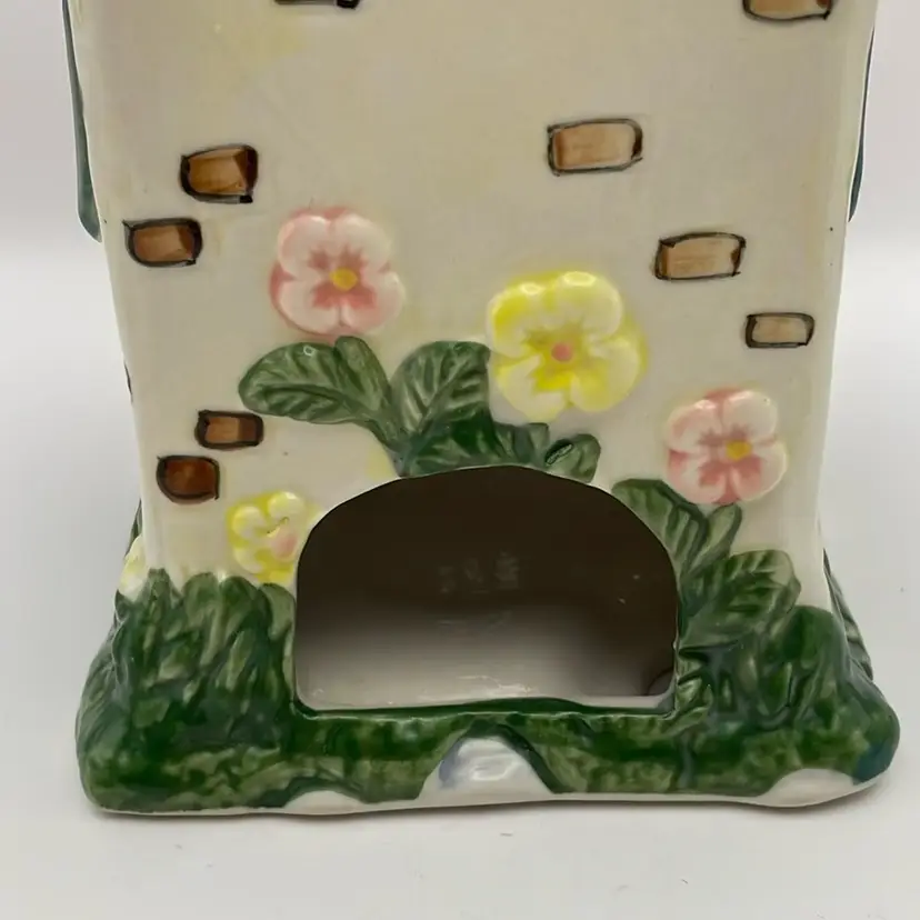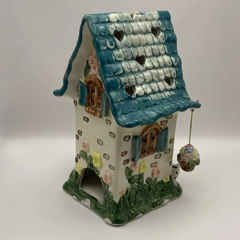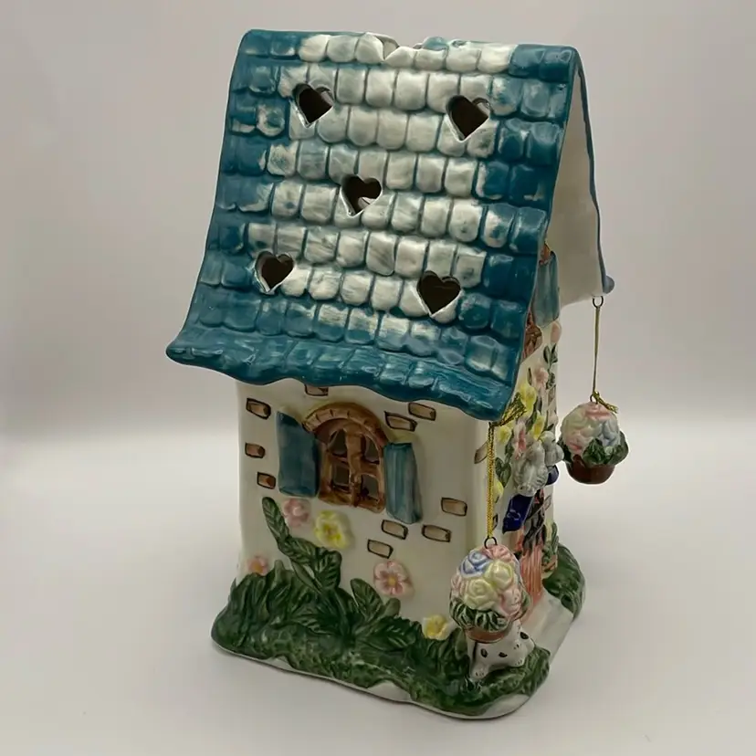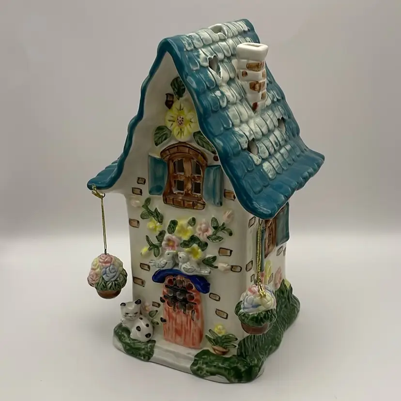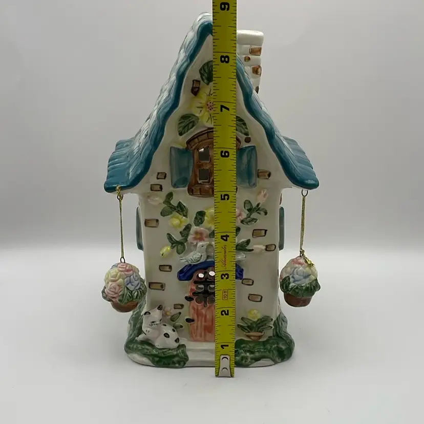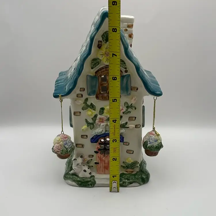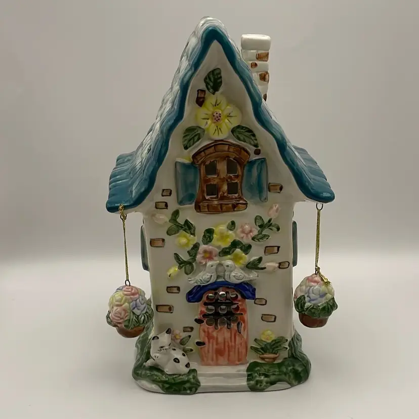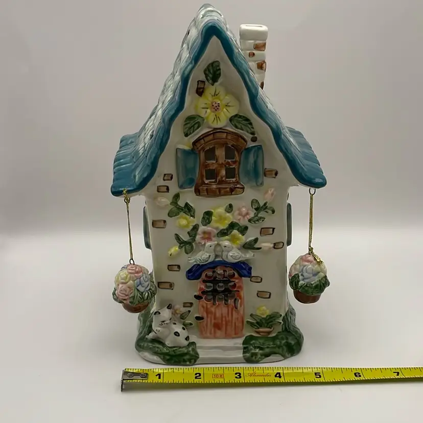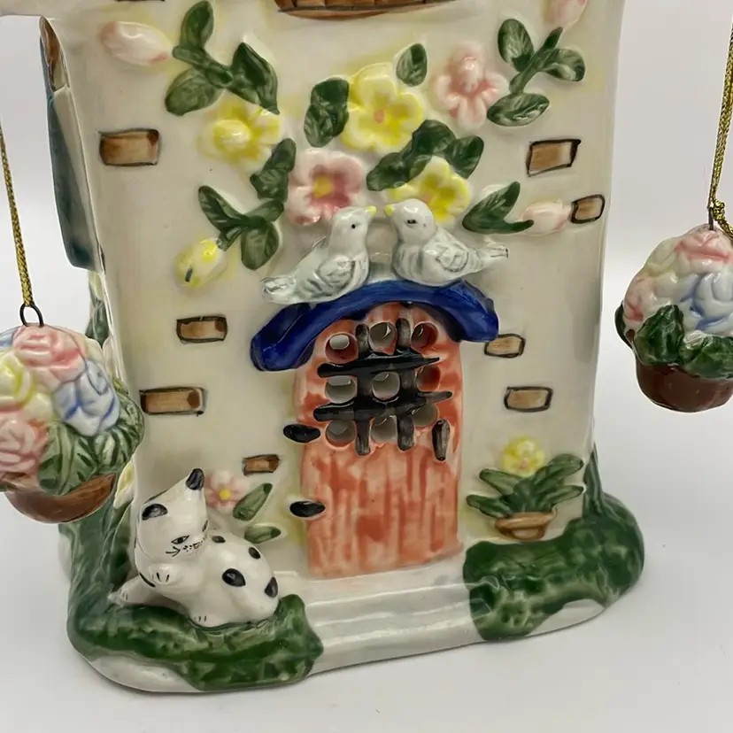 Ceramic, Hand Painted, Fairy/Tea Light House, Cat, Birds, Hanging Baskets! Adorable! ☺️