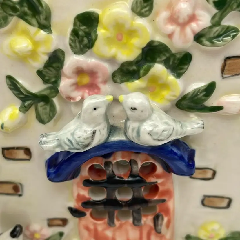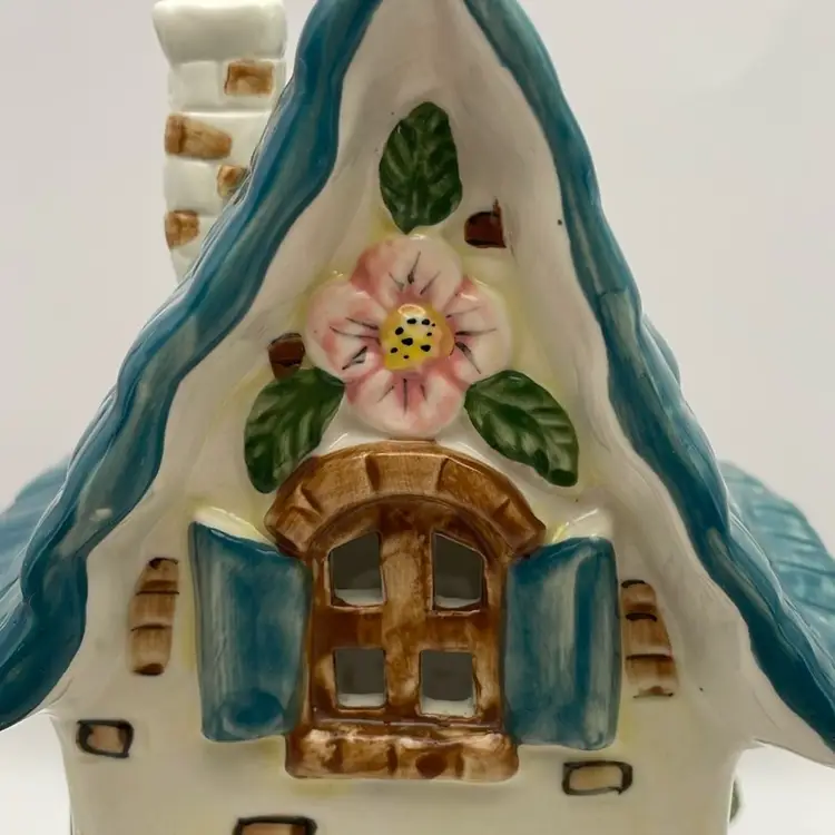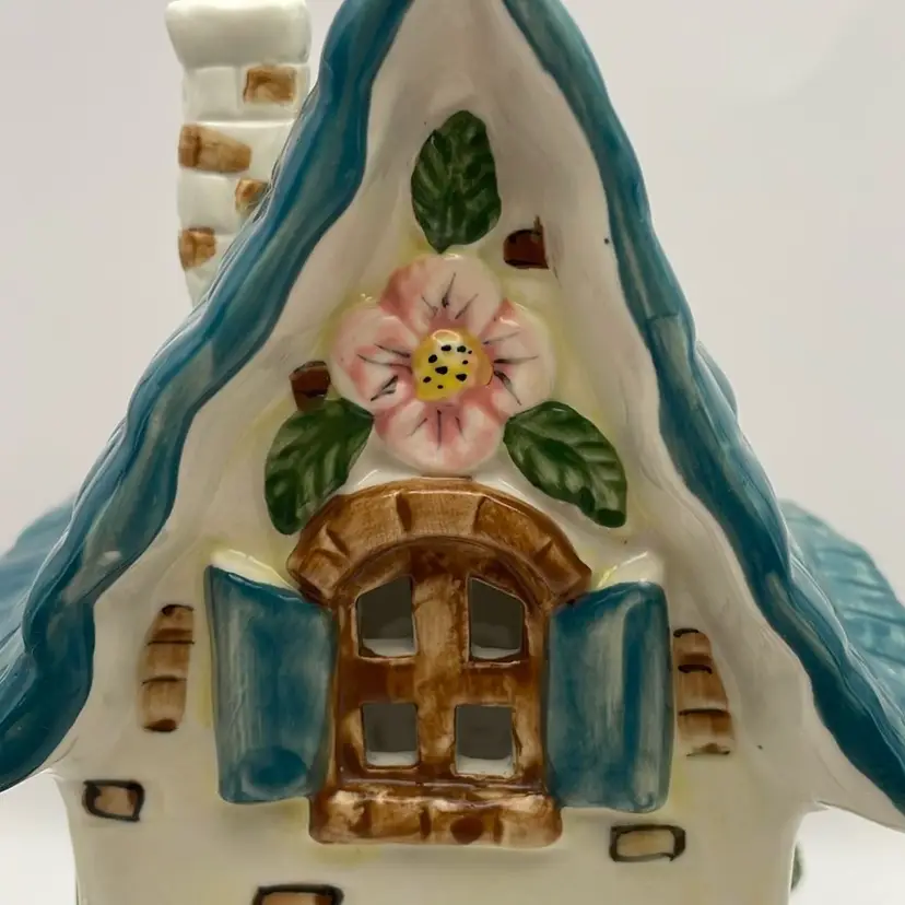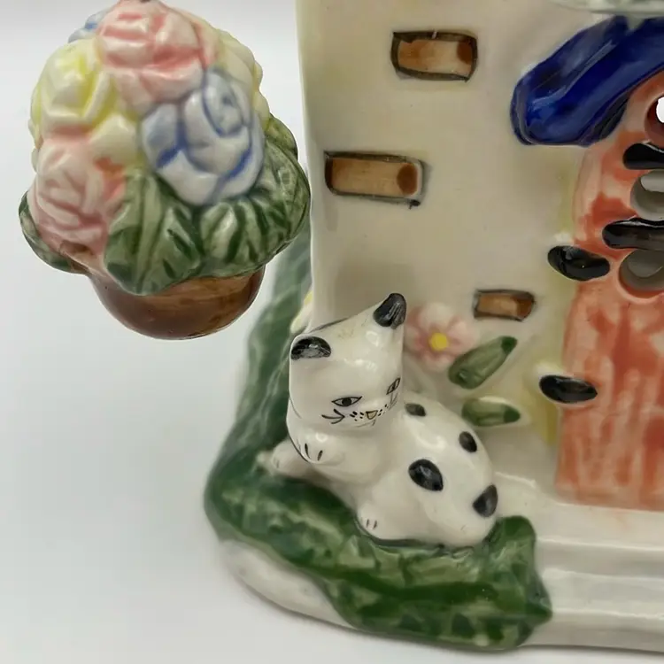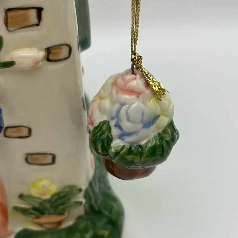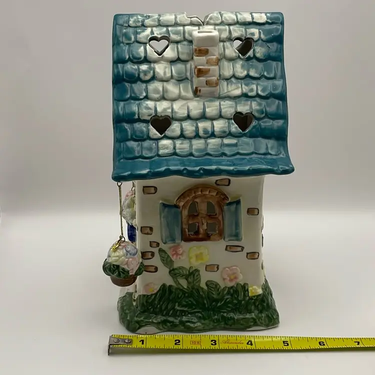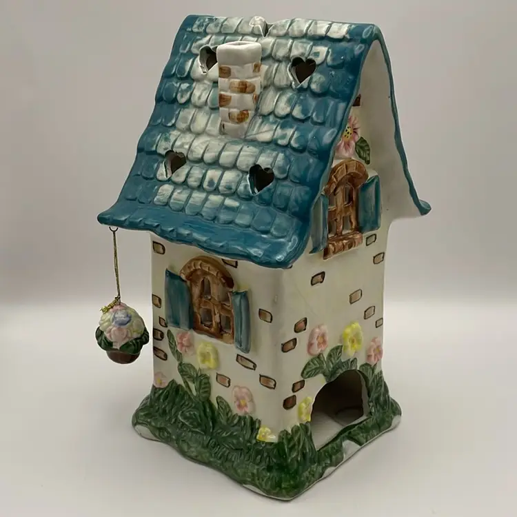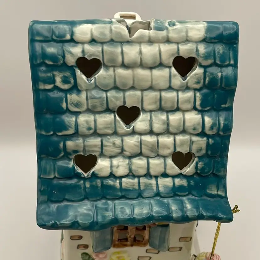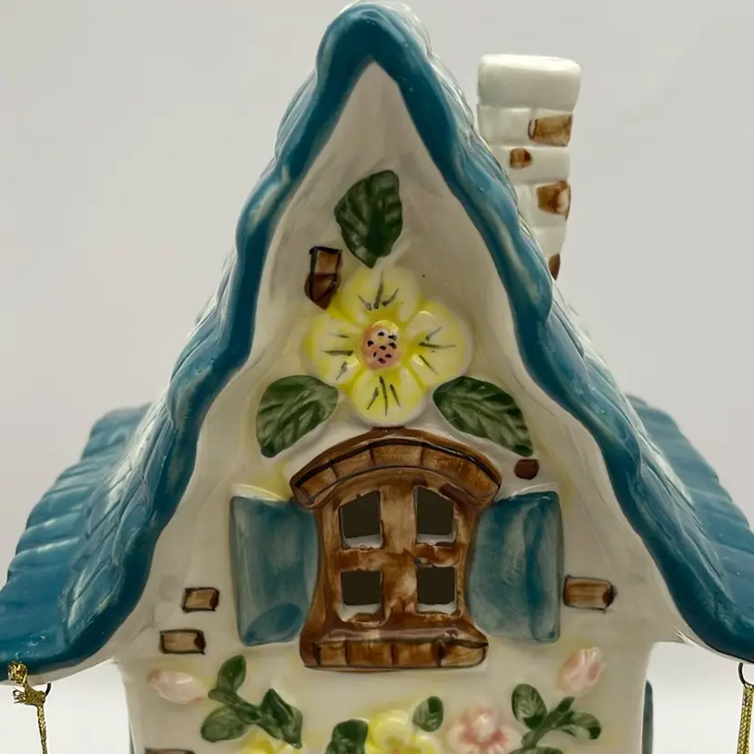 Ceramic, Hand Painted, Fairy/Tea Light House, Cat, Birds, Hanging Baskets! Adorable! ☺️