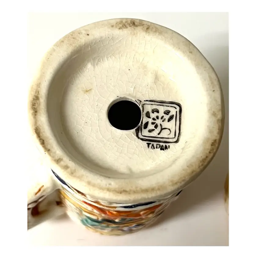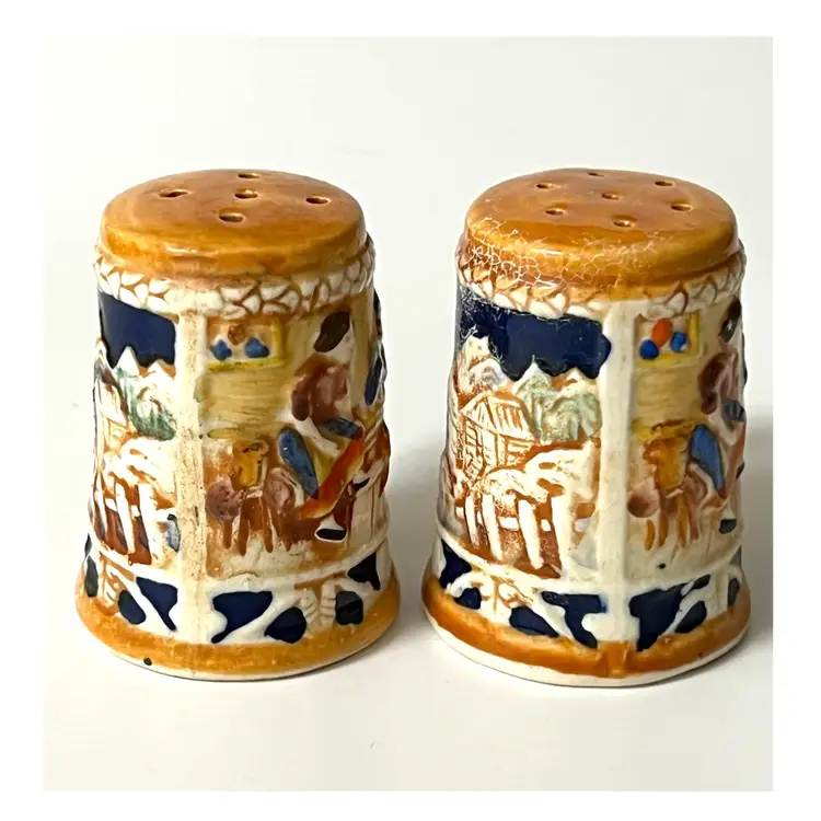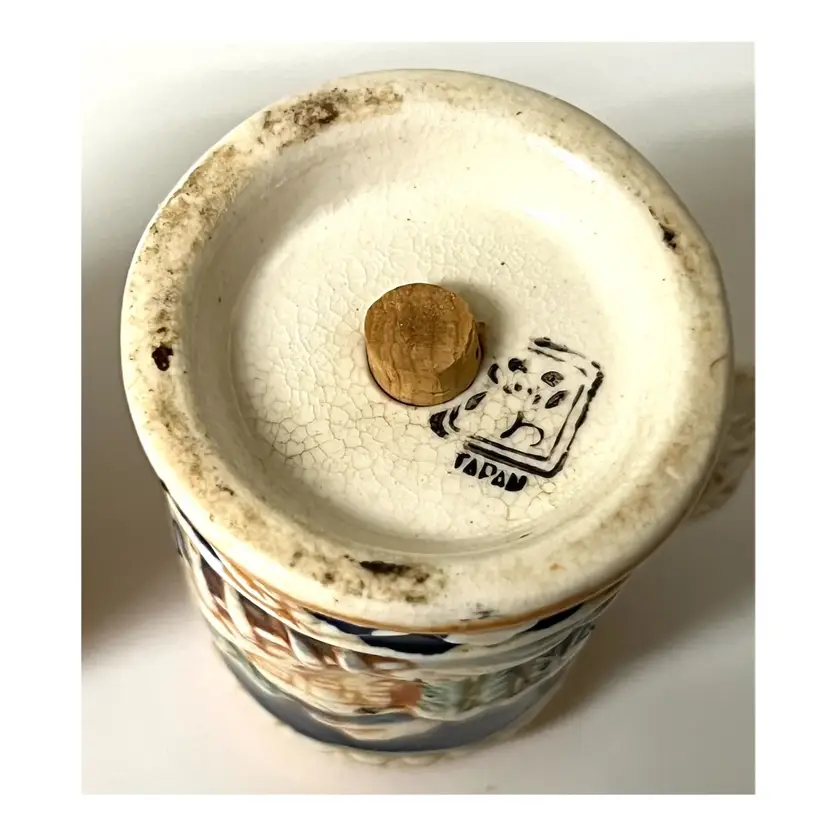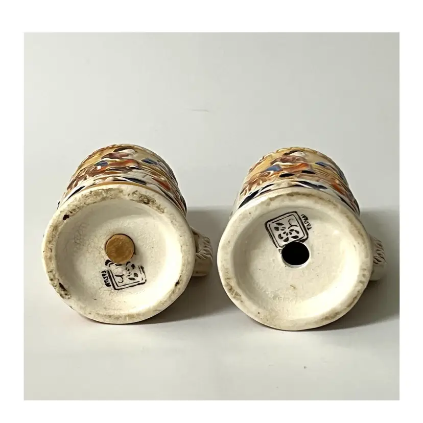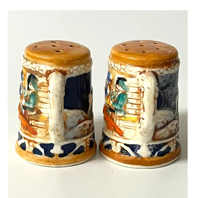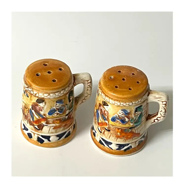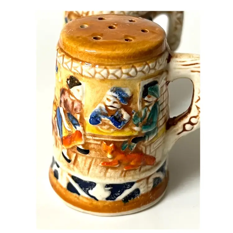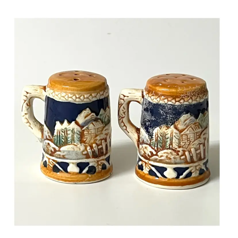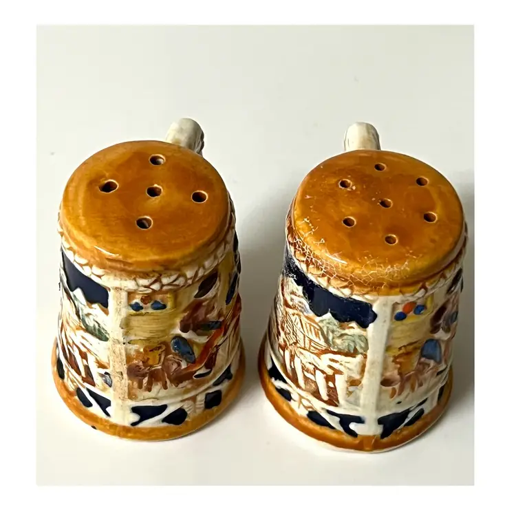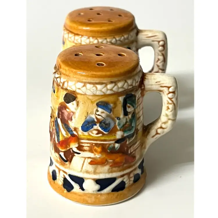 Ceramic Hand Painted Salt & Pepper Shakers German Beer Steins Shape Japan. 2 in height. One of the stoppers pushed inside. No chips/cracks