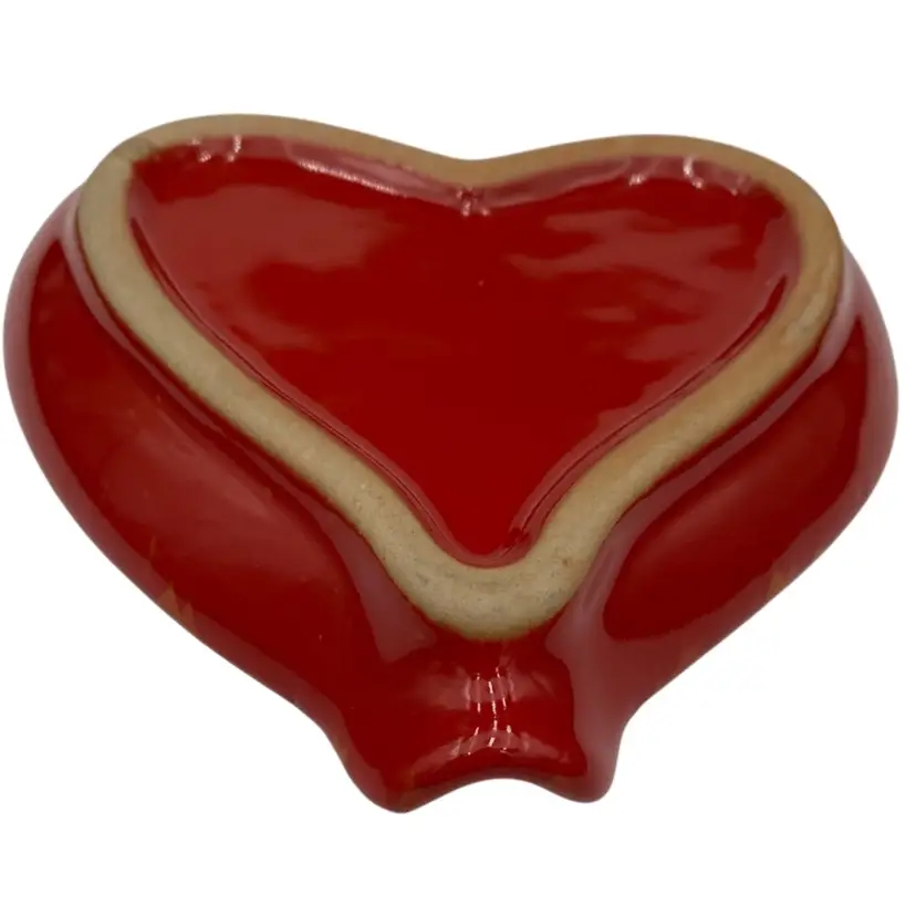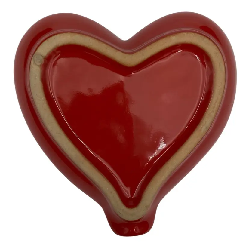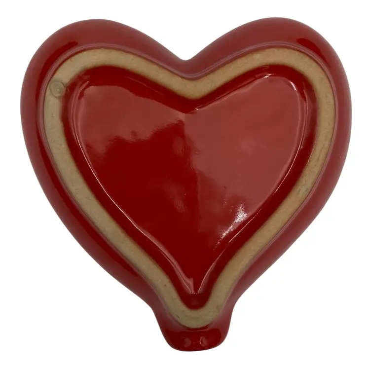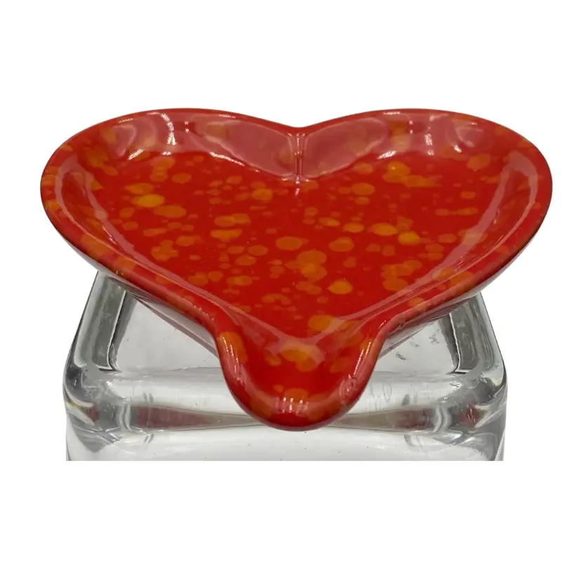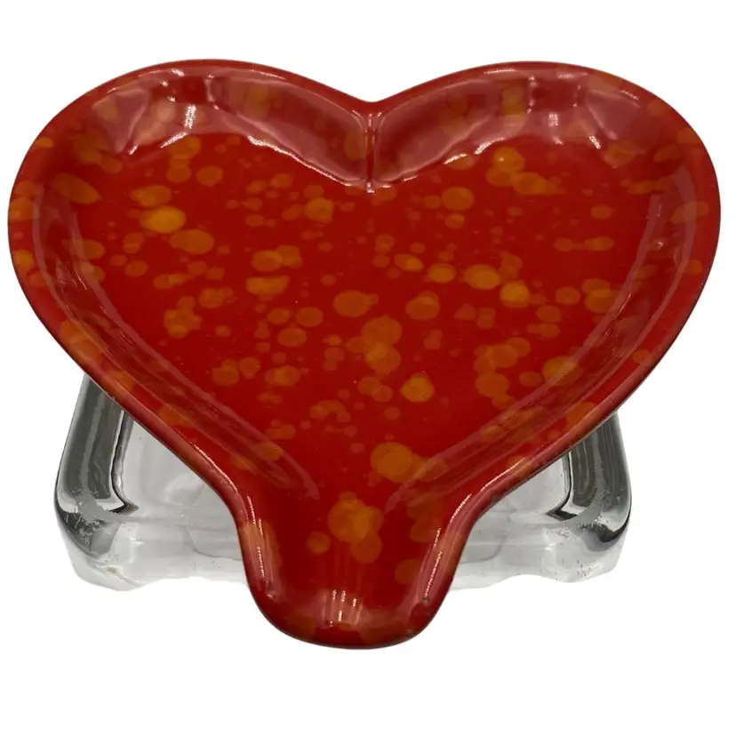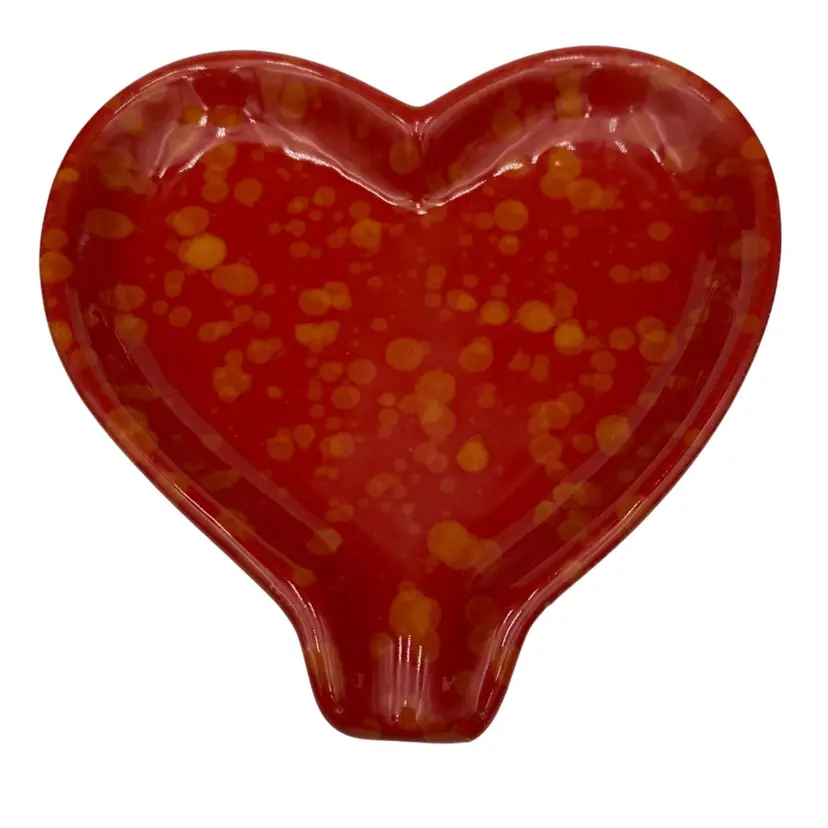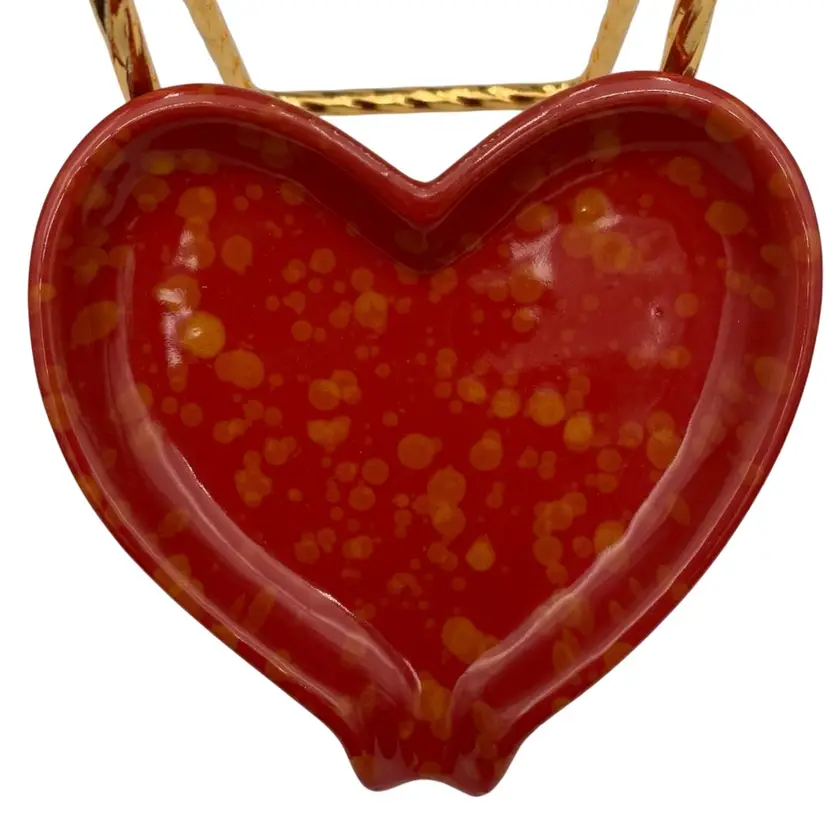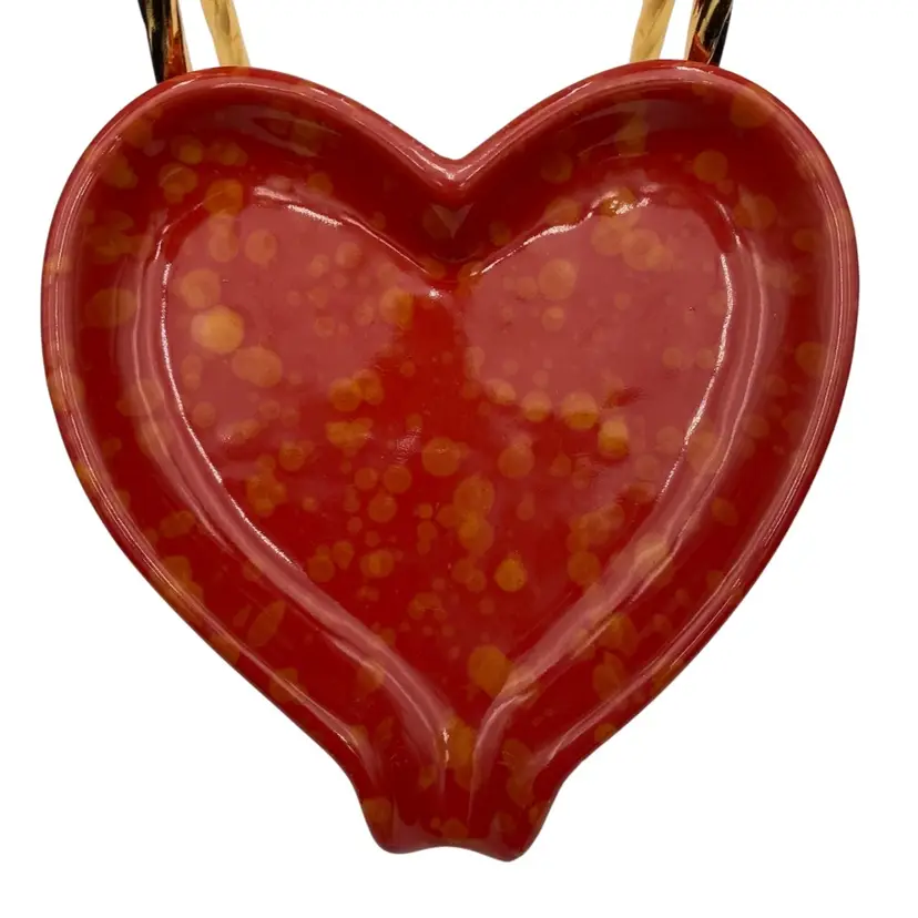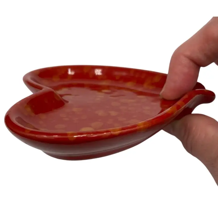 This ceramic Heart Dish in red with gold mottling is a stylish and contemporary decorative item. It features a curved and tilted tilted tip for easy use for resting a spoon or makeup brush. It's a lovely, curvy shape and would work well as a trinket dish, makeup dish, or a spoon rest. The dish is .3 inches tall, 4.2 inches wide, and 4.2 inches long, making it a versatile and practical addition to any collection of decorative items.