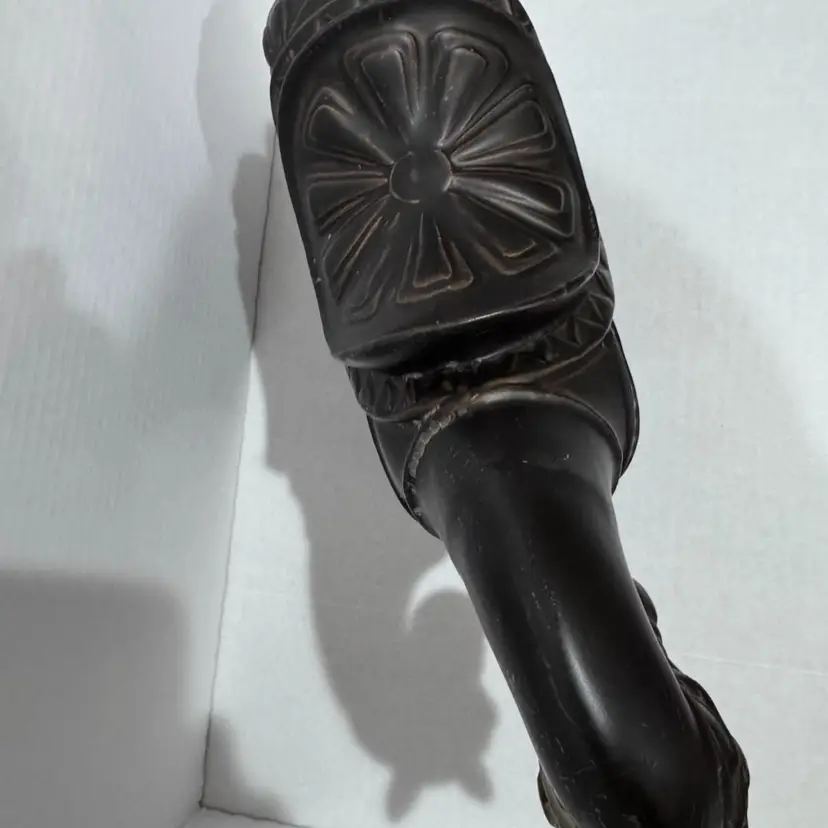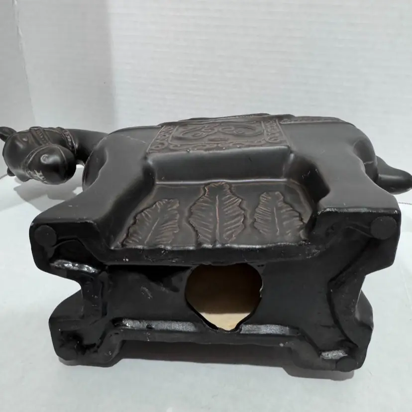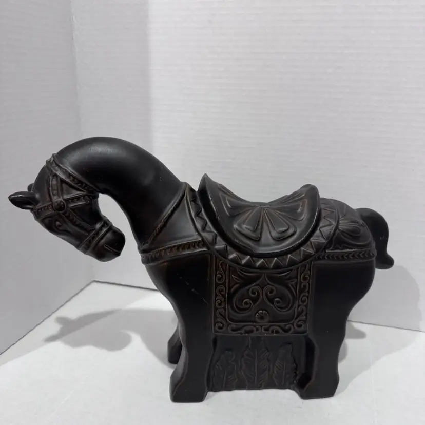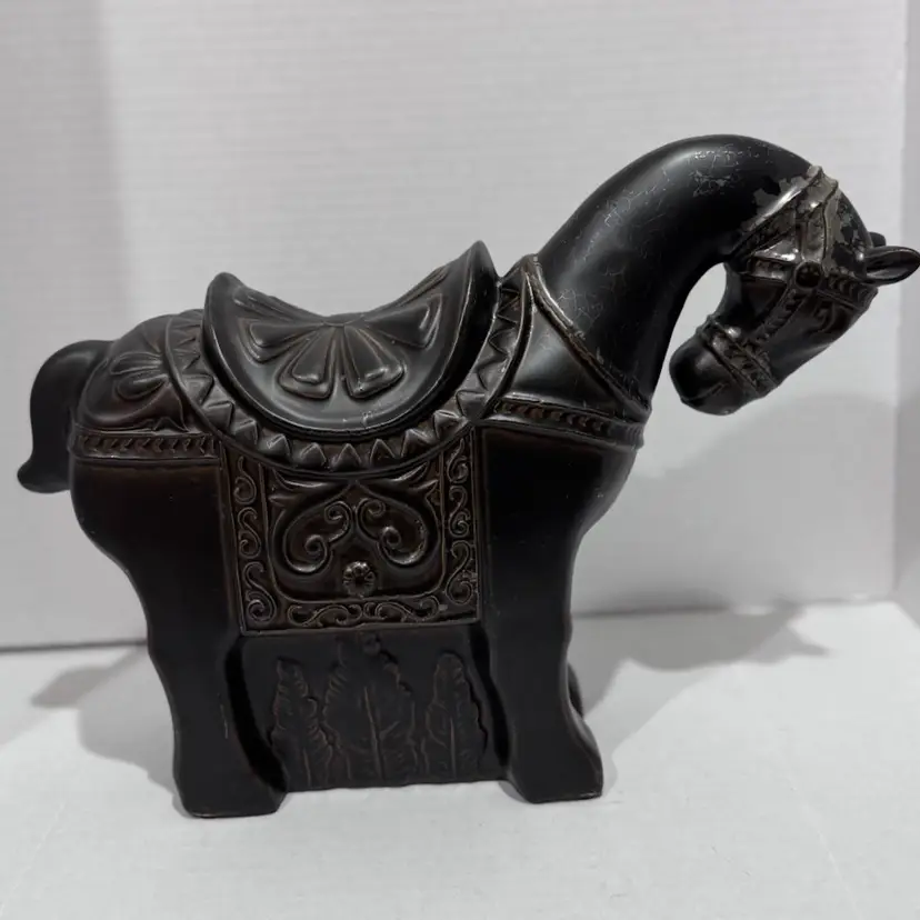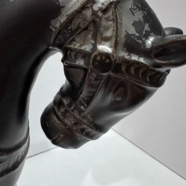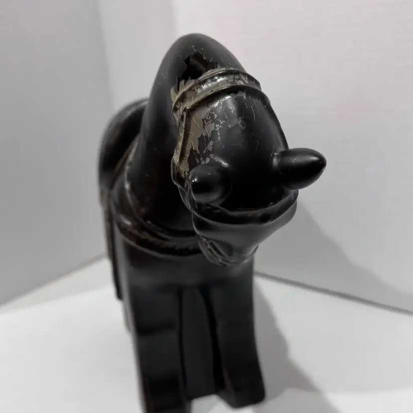 This horse is cool. Dark brown but has like a clear coat that’s starting to crackle and make it look even neater. No chips or cracks. Measures 9 1/2 inches at its tallest and 13 inches wide. A really beautiful piece. Would make a unique gift for a horse lover!
