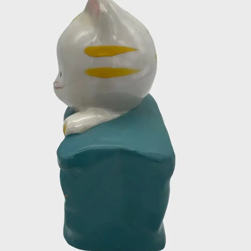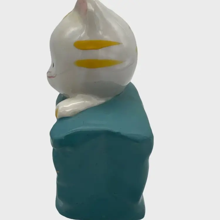 Ceramic bank in the shape of a kitty cat in a shopping bag / purse. The bag is blue and the cat is white with yellow stripes. The bank measures approximately 4.5" tall and 3" across.