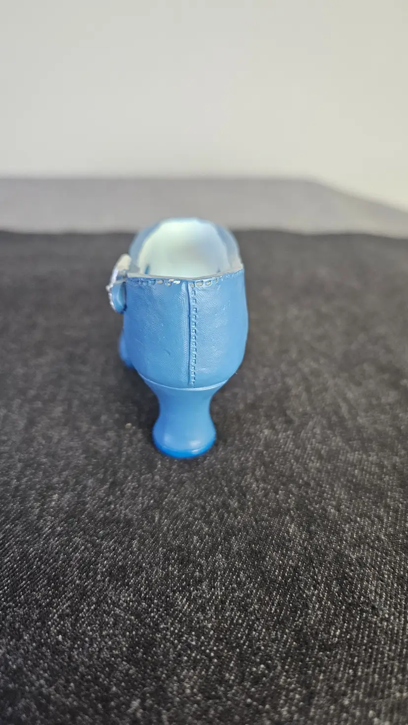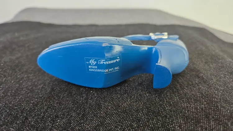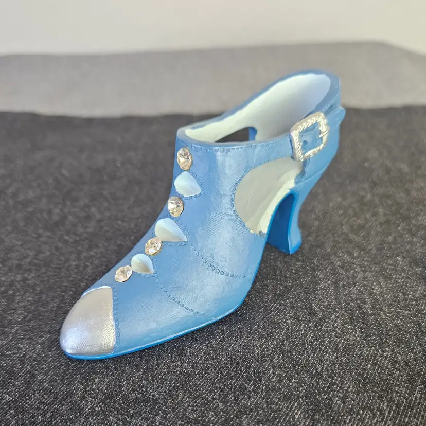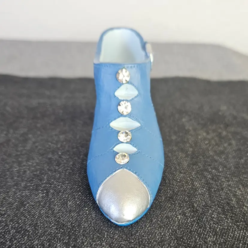 A lovely and unique addition to any miniature ceramic shoe collection. This classic sling back design is a pretty light blue, accented with rhinestones as well as a silver ceramic buckle. Note the detailed "leather" work that adds to the charm of this ceramic figurine. Part of the My Treasure collection by Kingsbridge Int, vintage 1999. Pre-owned, very good condition and well kept. Appx 4" x 2" x 1.5". No box.