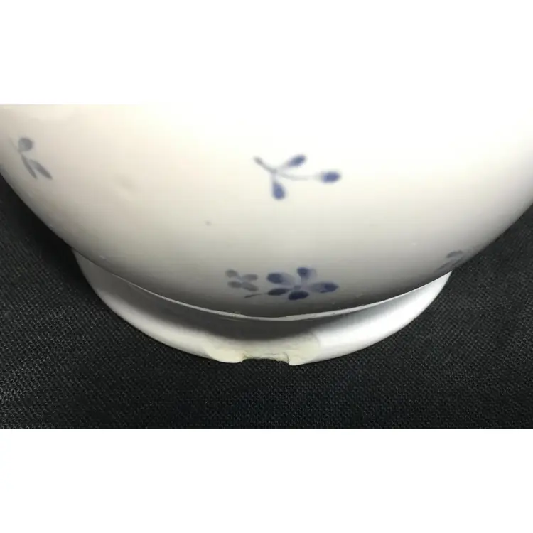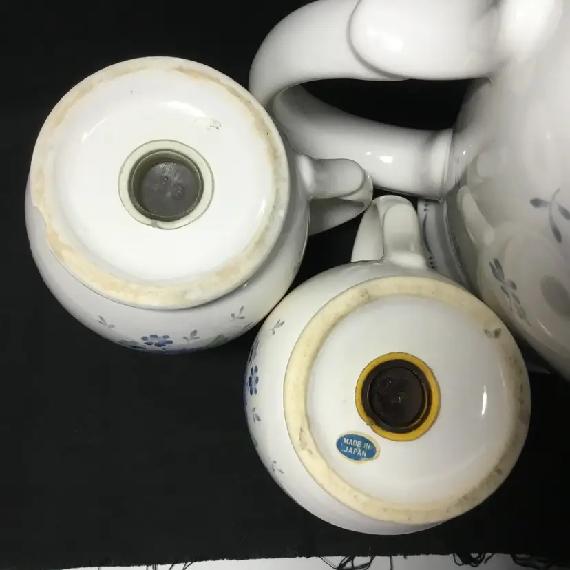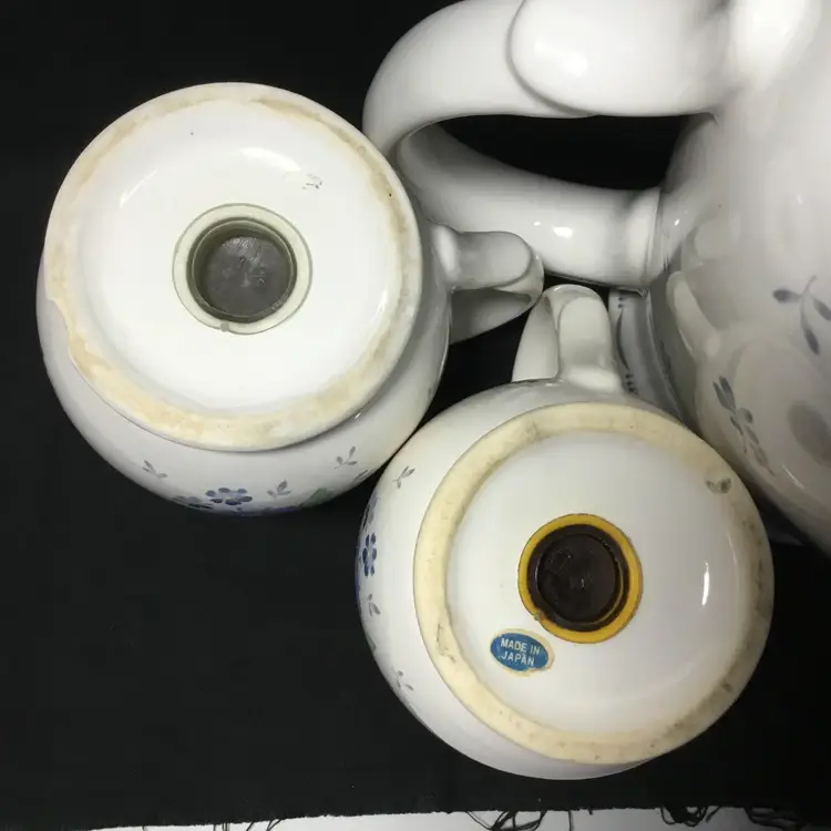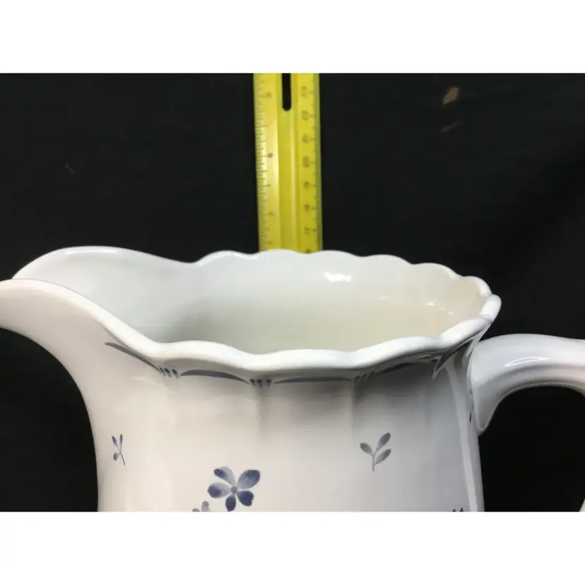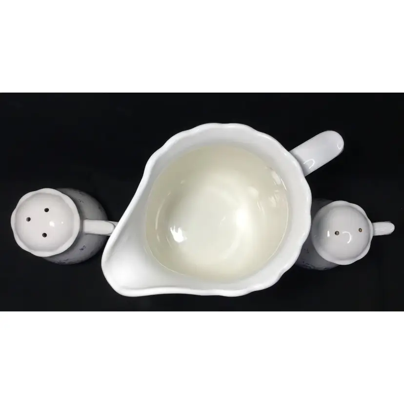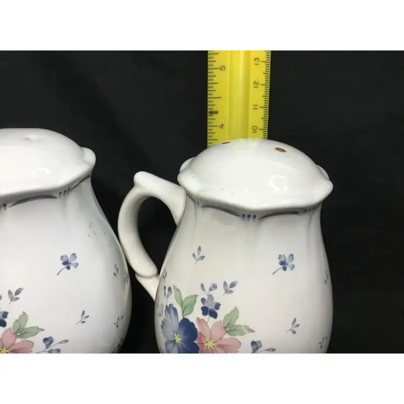 6.5 inches tall pitcher holds 5.5 cups of liquid. Is white glazed ceramic with blue and pink flowers on front and back, tiny blue buds all over, ruffled top edge, curvey handle. Salt shakeris 4 inches tall, has 3 holes in domed top, ruffled edge around top. curvey handle. Pepper shaker matches salt shaker with only 2 holes in domed top. Very good condition, stopper in pepper shaker is stained brown from the pepper, salt shaker has 1/2 inch long chip missing on bottom edge.