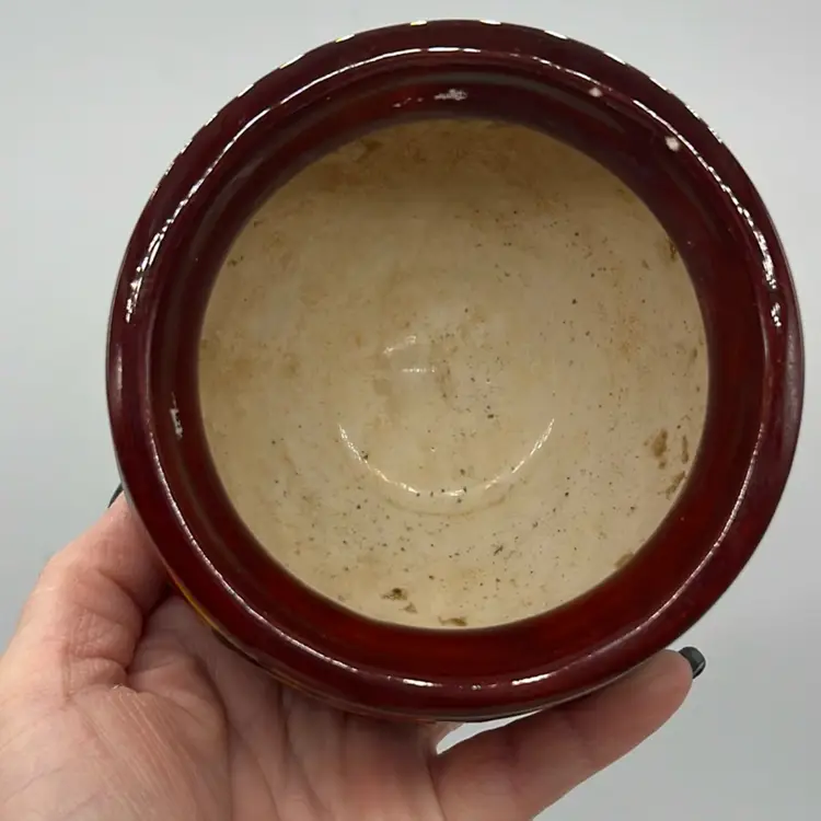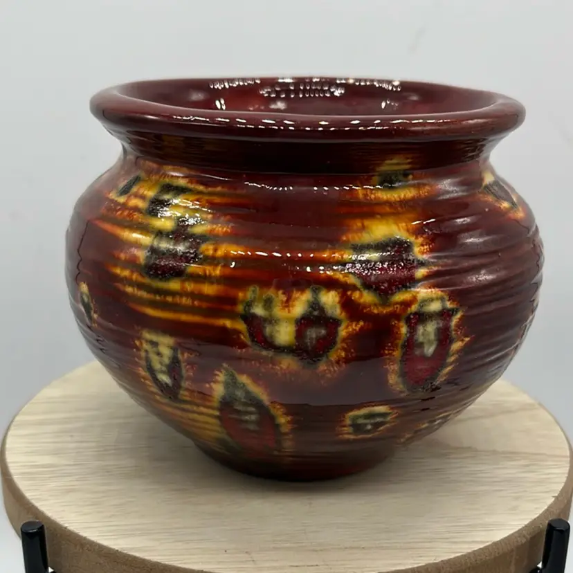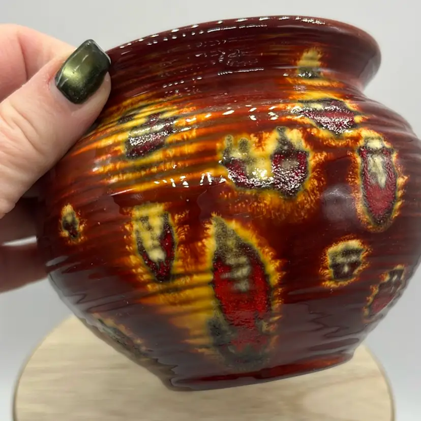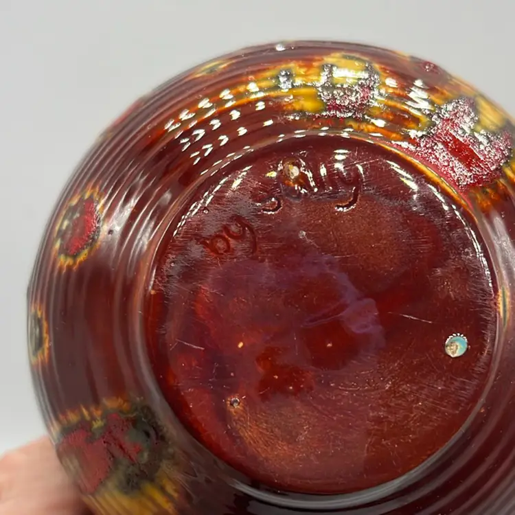 Good condition, no chips or cracks. Amazing fire colors throughout! Does show use inside. Signed By Sally Approx: 4” d x 3.5”