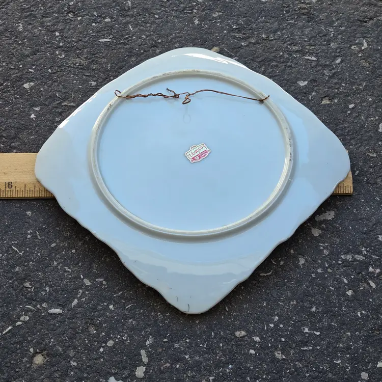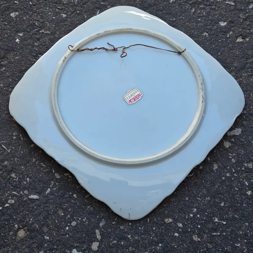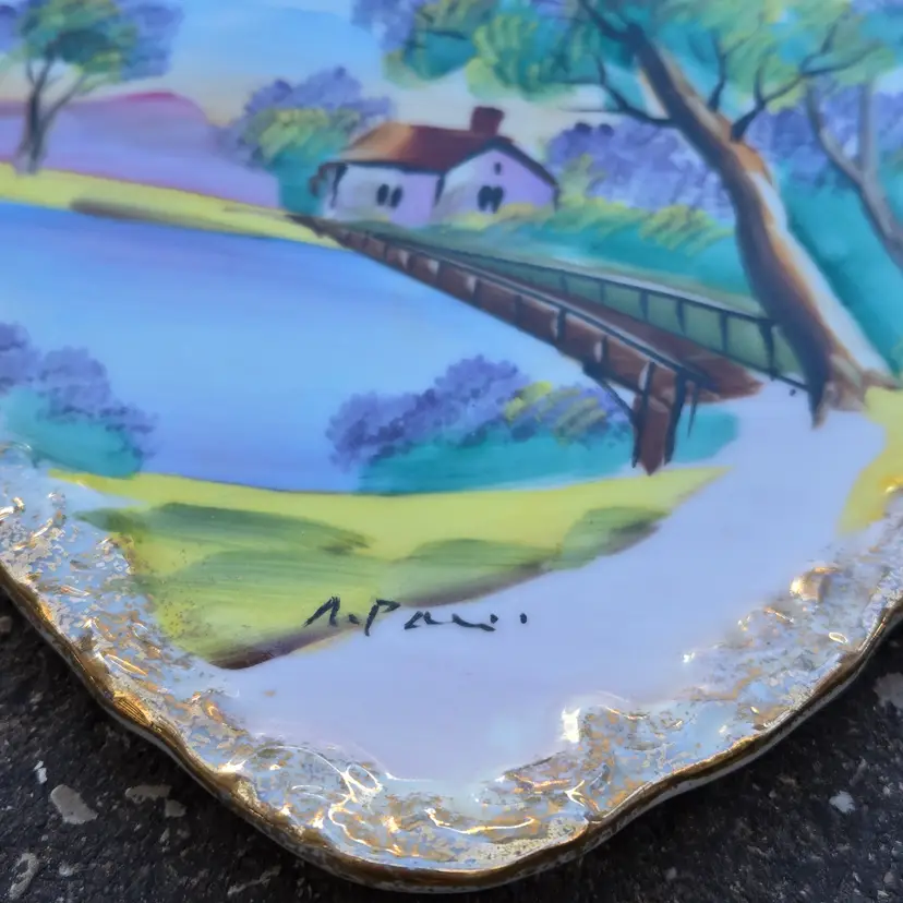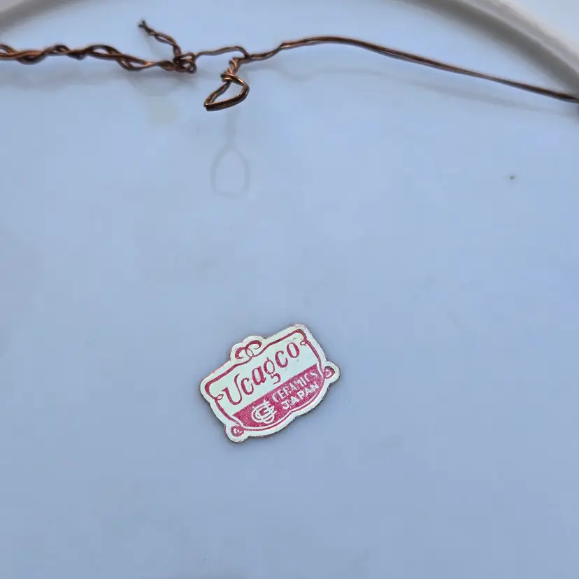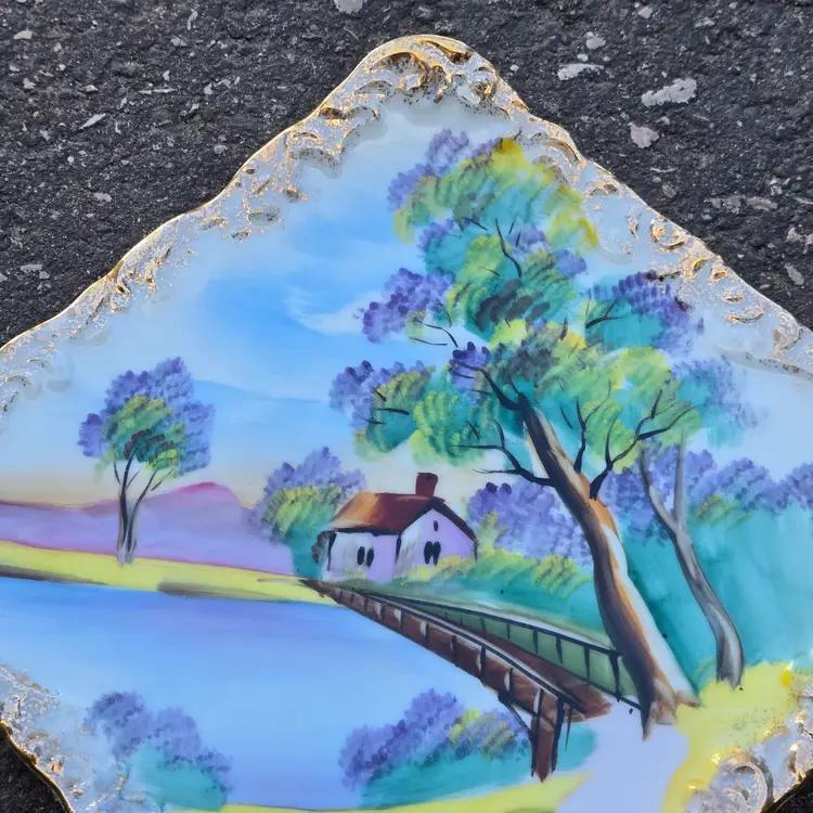Ceramic Plate Hand Painted & Signed Ucagco (original sticker) Japan 8¼" diameter Water Bridge Cottage Flowering Trees Vintage. Used condition with some dirt, missing gold and old metal hanging wire on backside. Please view all the photos and please ask any questions prior to purchase when possible.