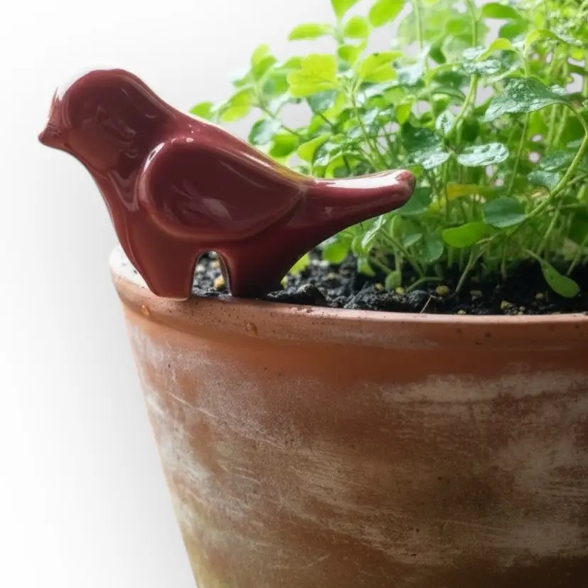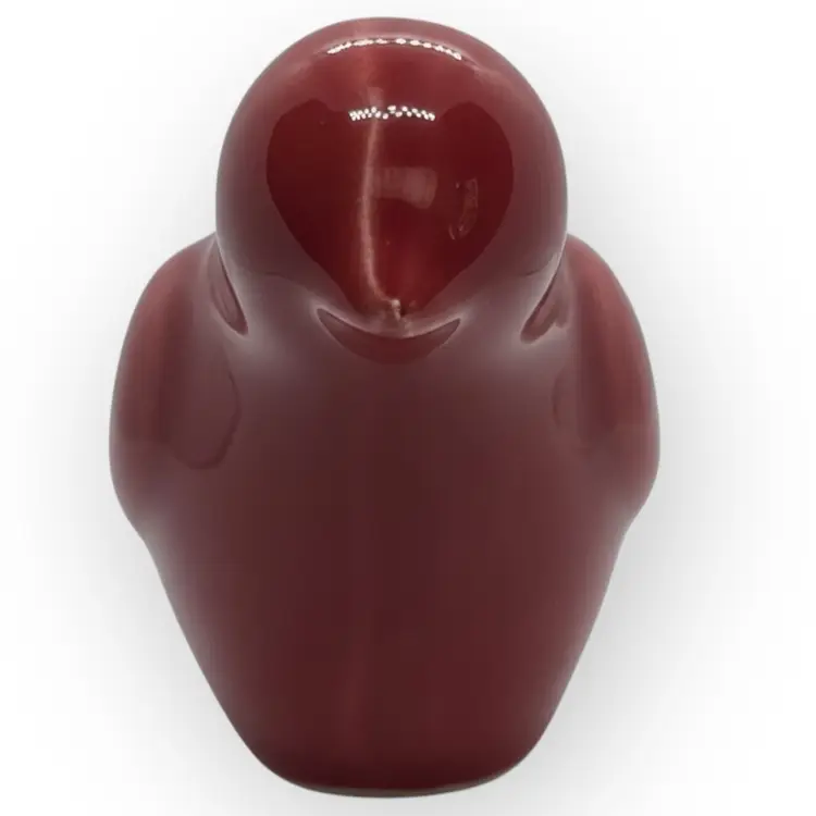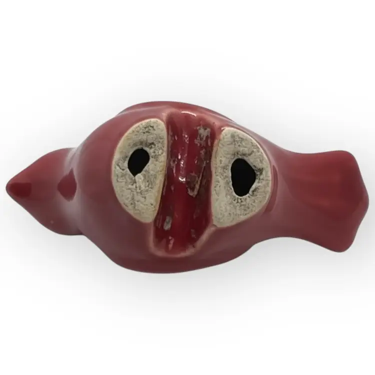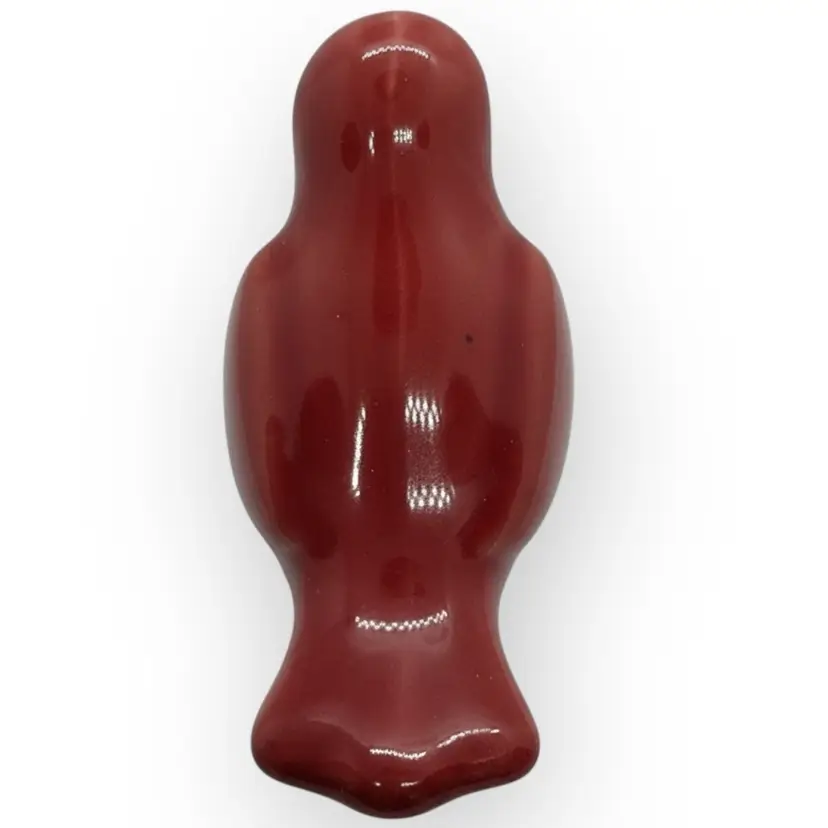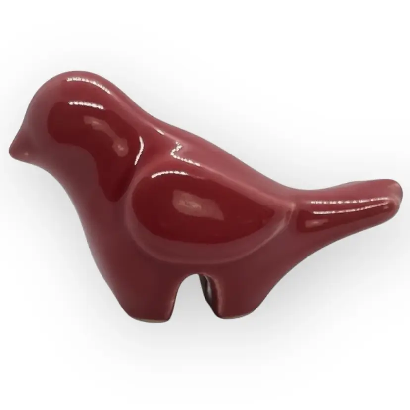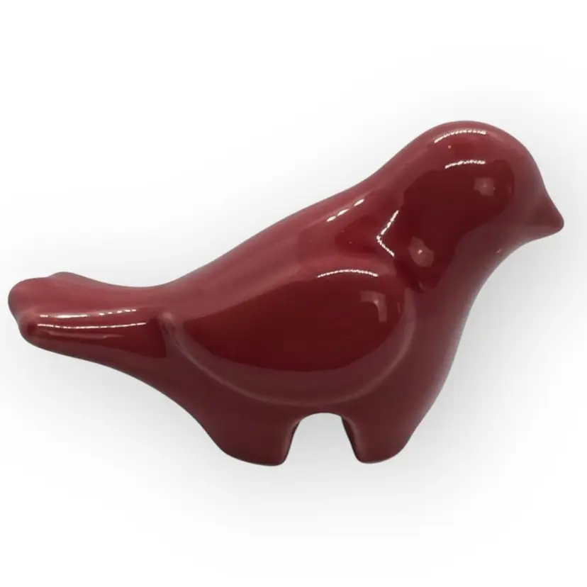 This modern little red ceramic birdie perches on the side of your planter to dress up your plant. It is 4-1/2” long from the tip of the beak to the tip of the tail. It is 2-1/2” wide and 2-1/2” tall. There are no chips, cracks or repaired spots.