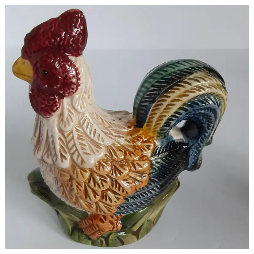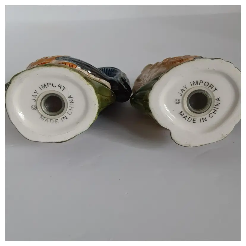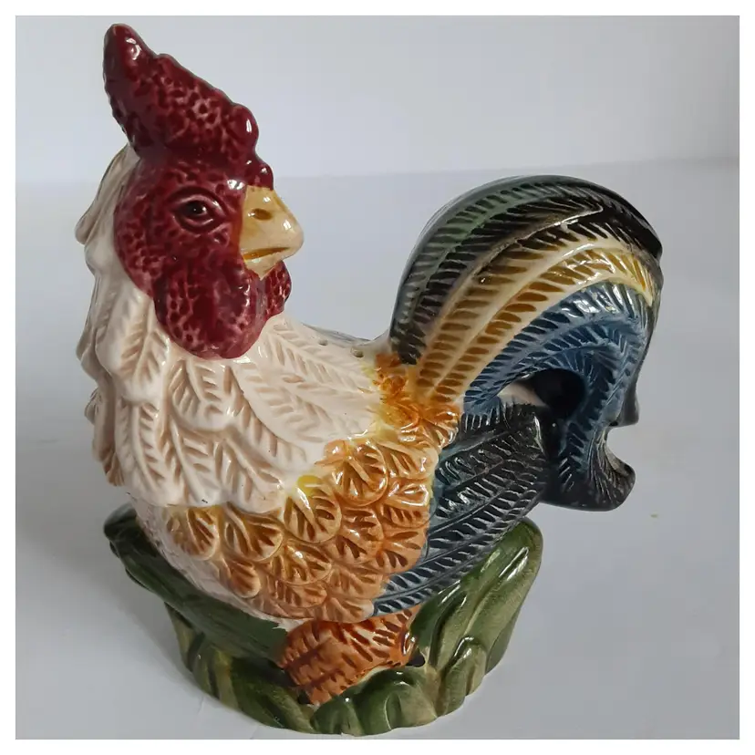 These salt and pepper shakers are 2 roosters. For those people that collect chickens and roosters these are the perfect pair. They are bright and colorful, show very little signs of wear. They would be a perfect addition to your kitchen and table.