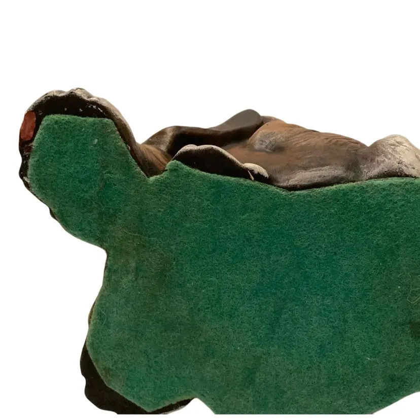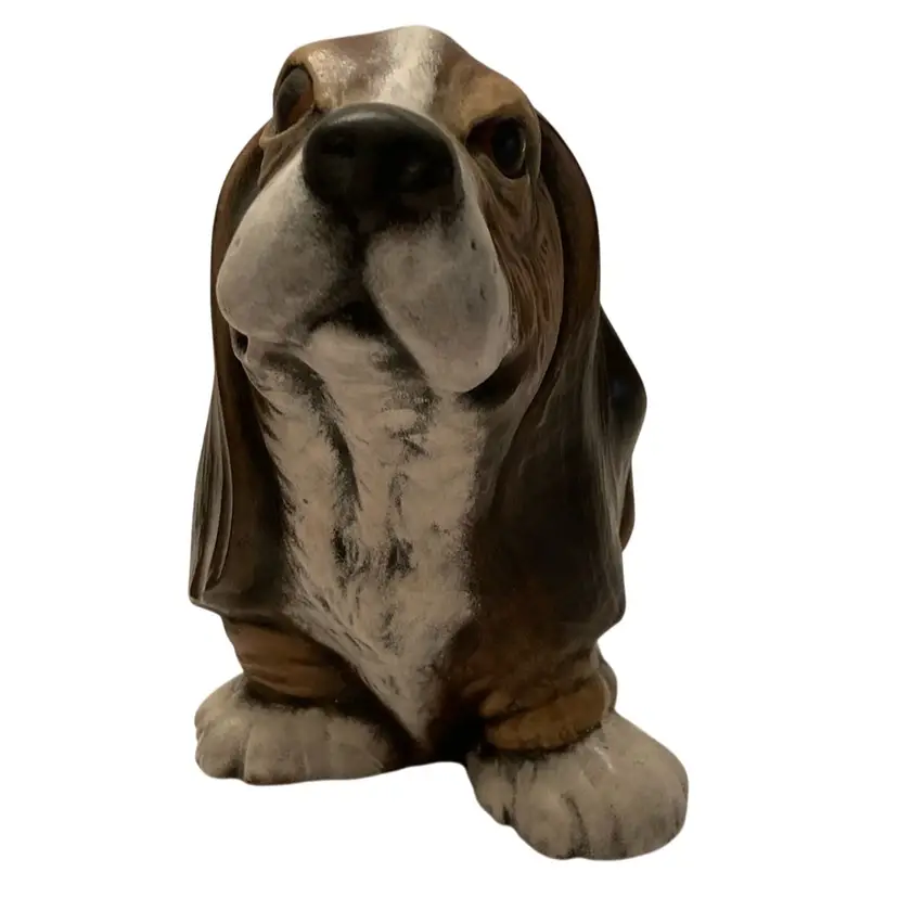 7” tall x 5.5” wide. Very cute sitting basset hound scratching himself. Small chip on bottom of foot which you can’t see when upright.