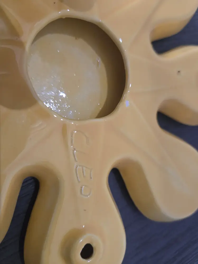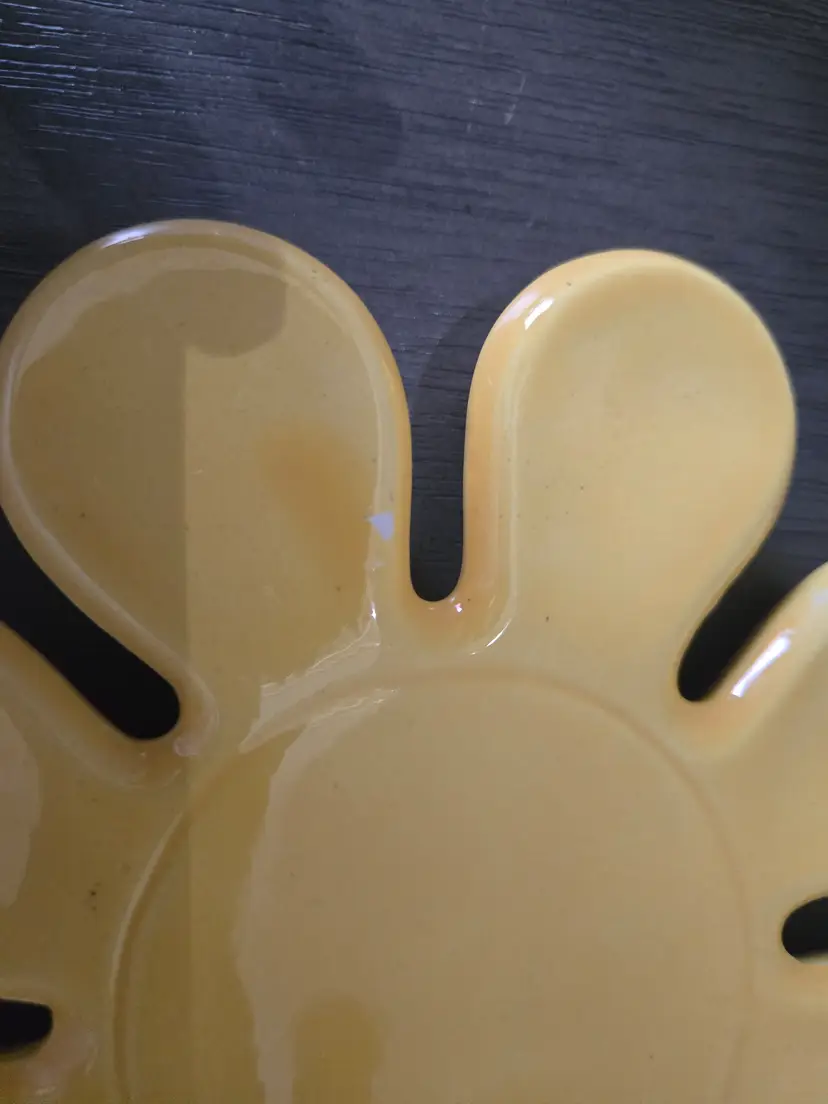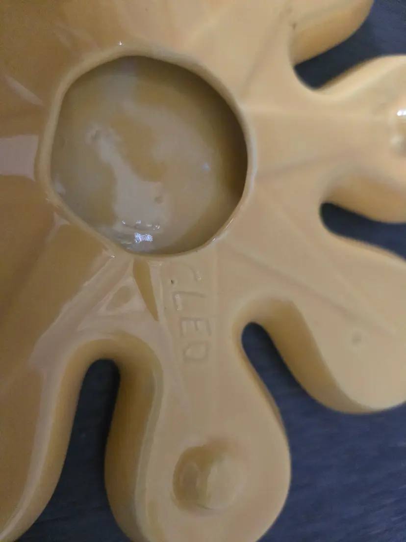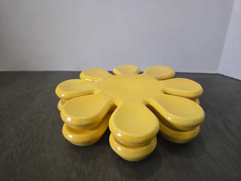 Set of 2 studio Pottery trivets in the shape of a sunflower, signed by artist Cleo, 6" across, yellow