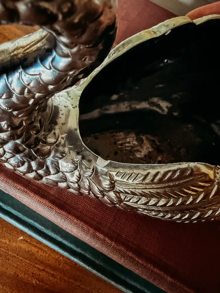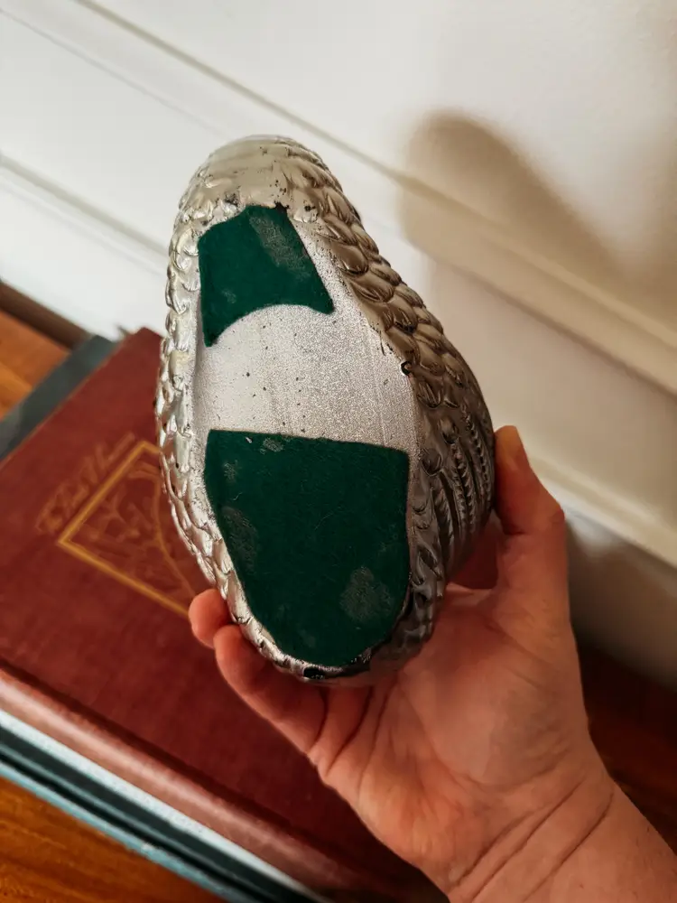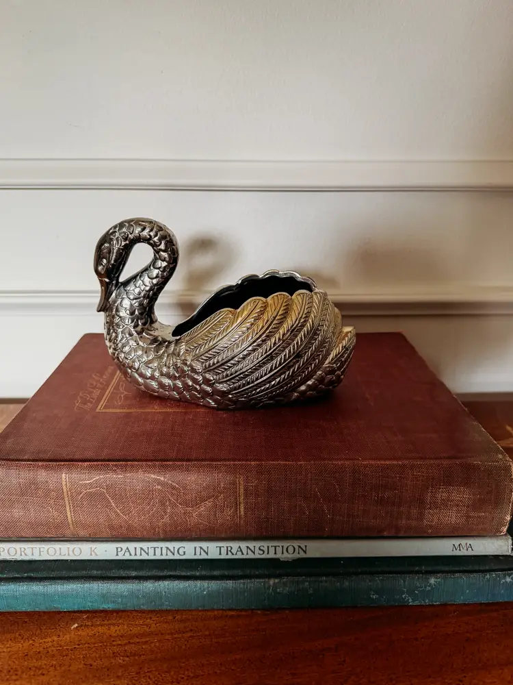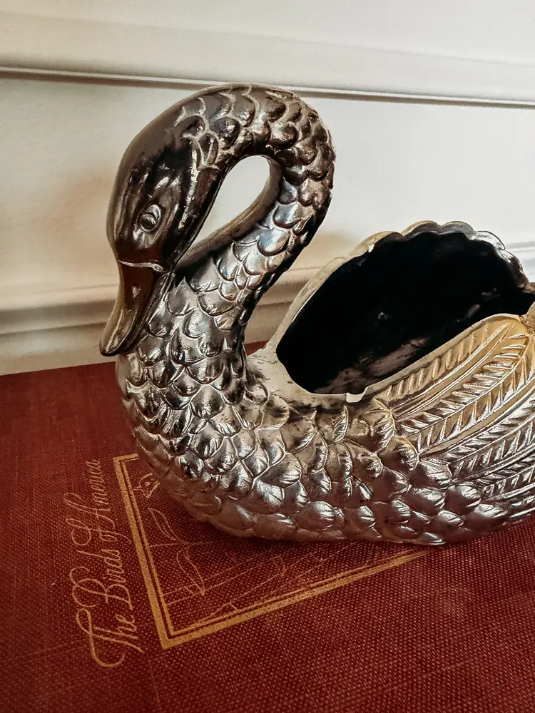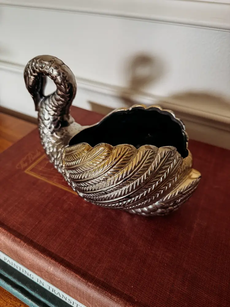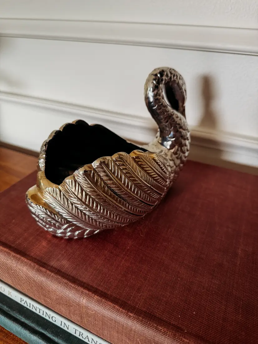 painted with silver and gold toned paint, this planter almost looks like silver plated metal! One chip shown in the photo. A stunning treasure!
