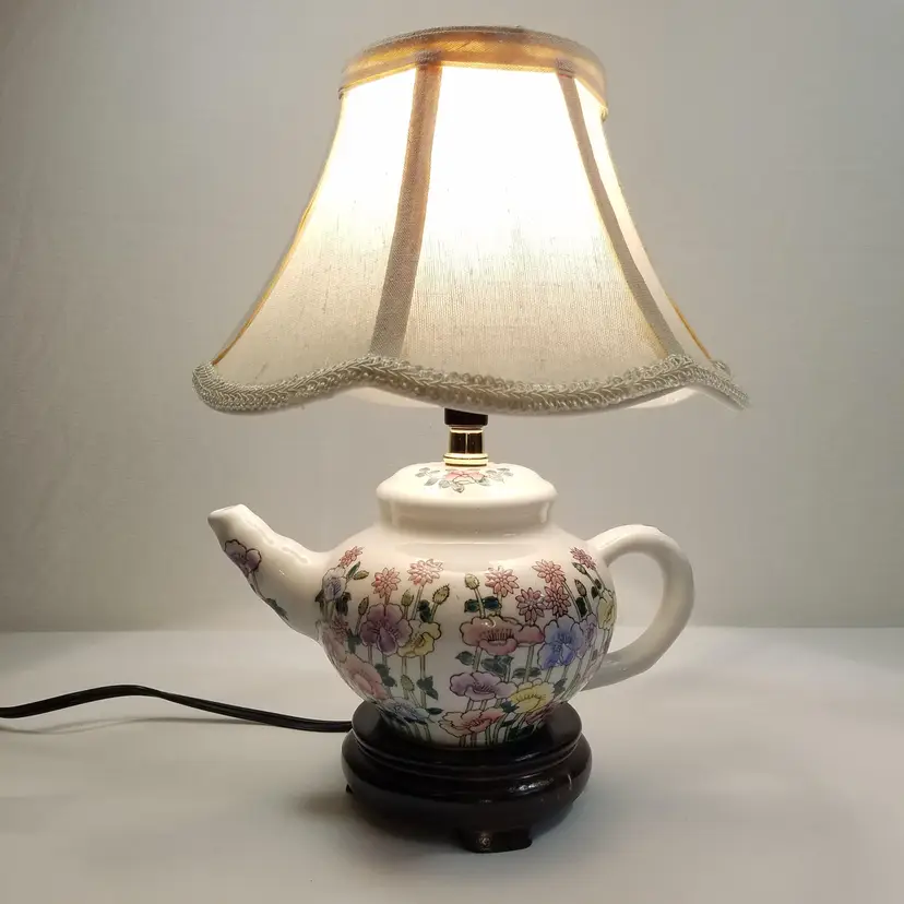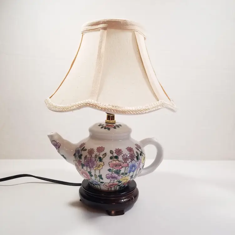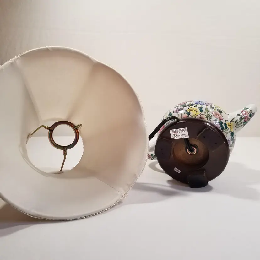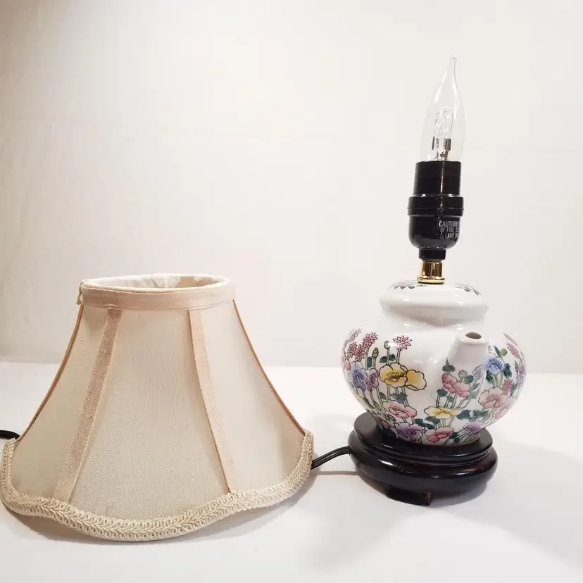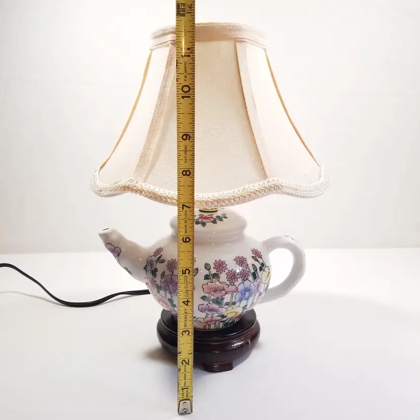 The shade it is 9" in diameter, the lamp stands 12.75" tall. There is no damage, the shade is nice for vintage, may have vintage marks. No breaks cracks or chips. The wood base has a few nicks in it. Great little night lamp.