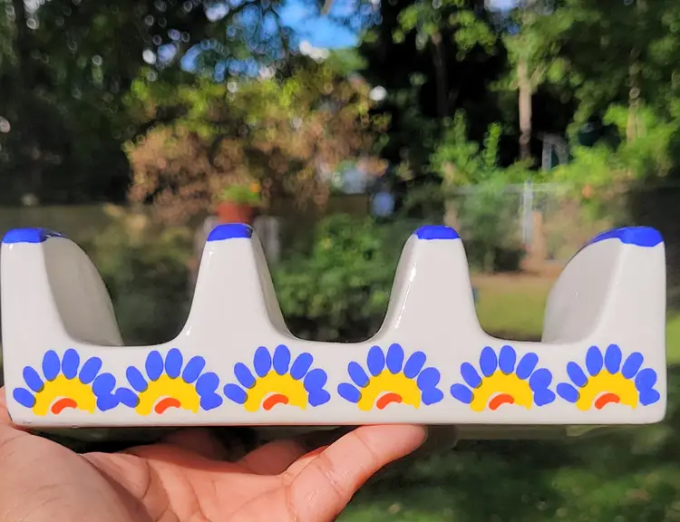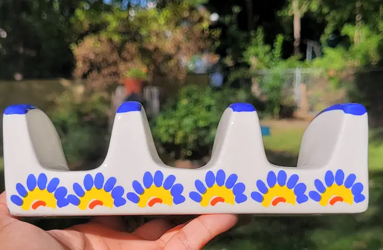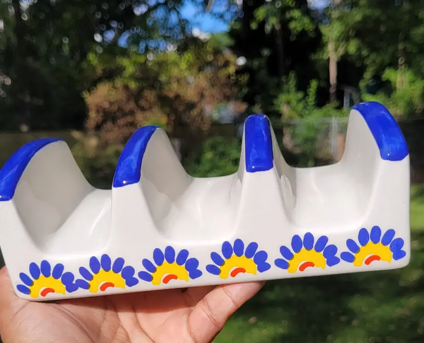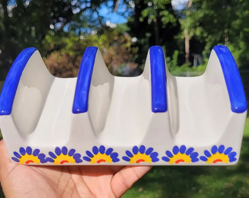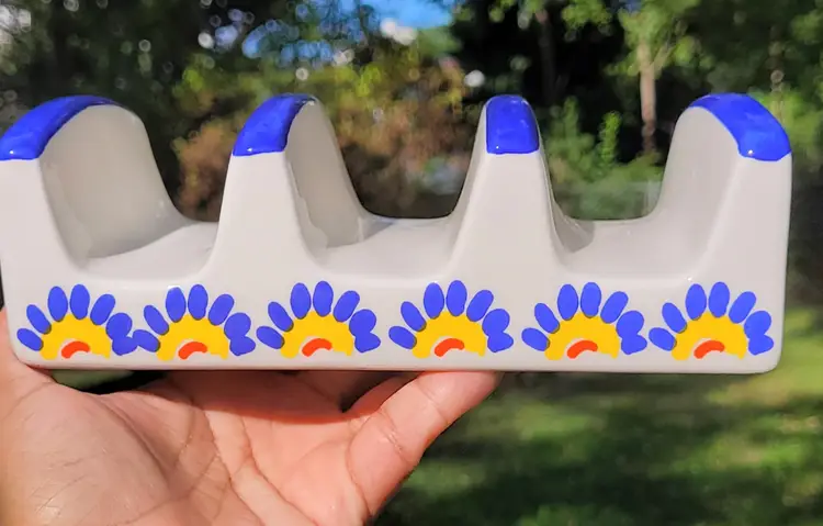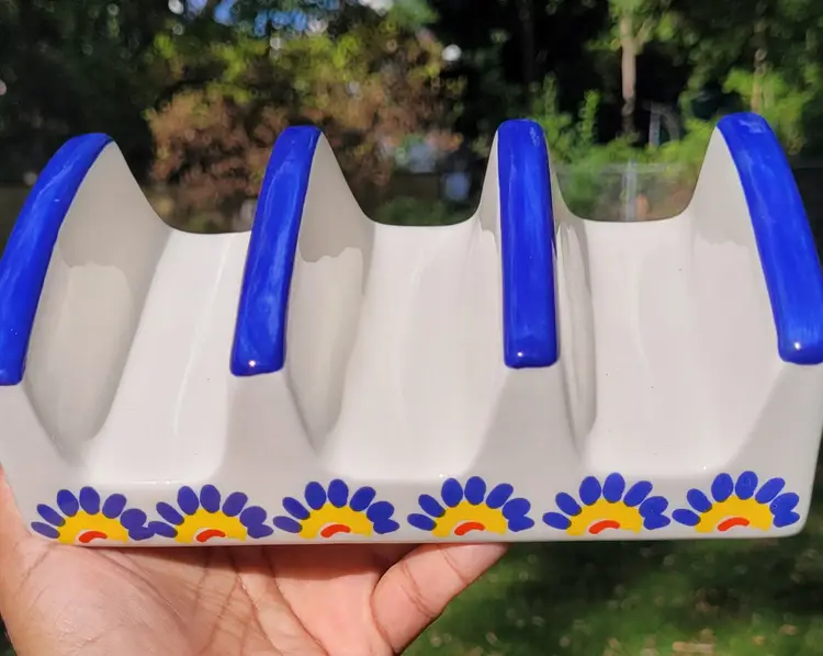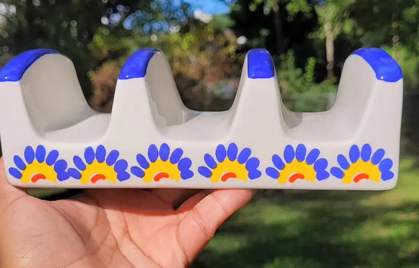 Add a touch of personality to your kitchen with this ceramic taco holder from Prima. The shiny finish and all-over multicolor pattern make it a fun addition to any kitchen. Hold 3 tacos at a time.