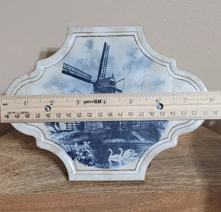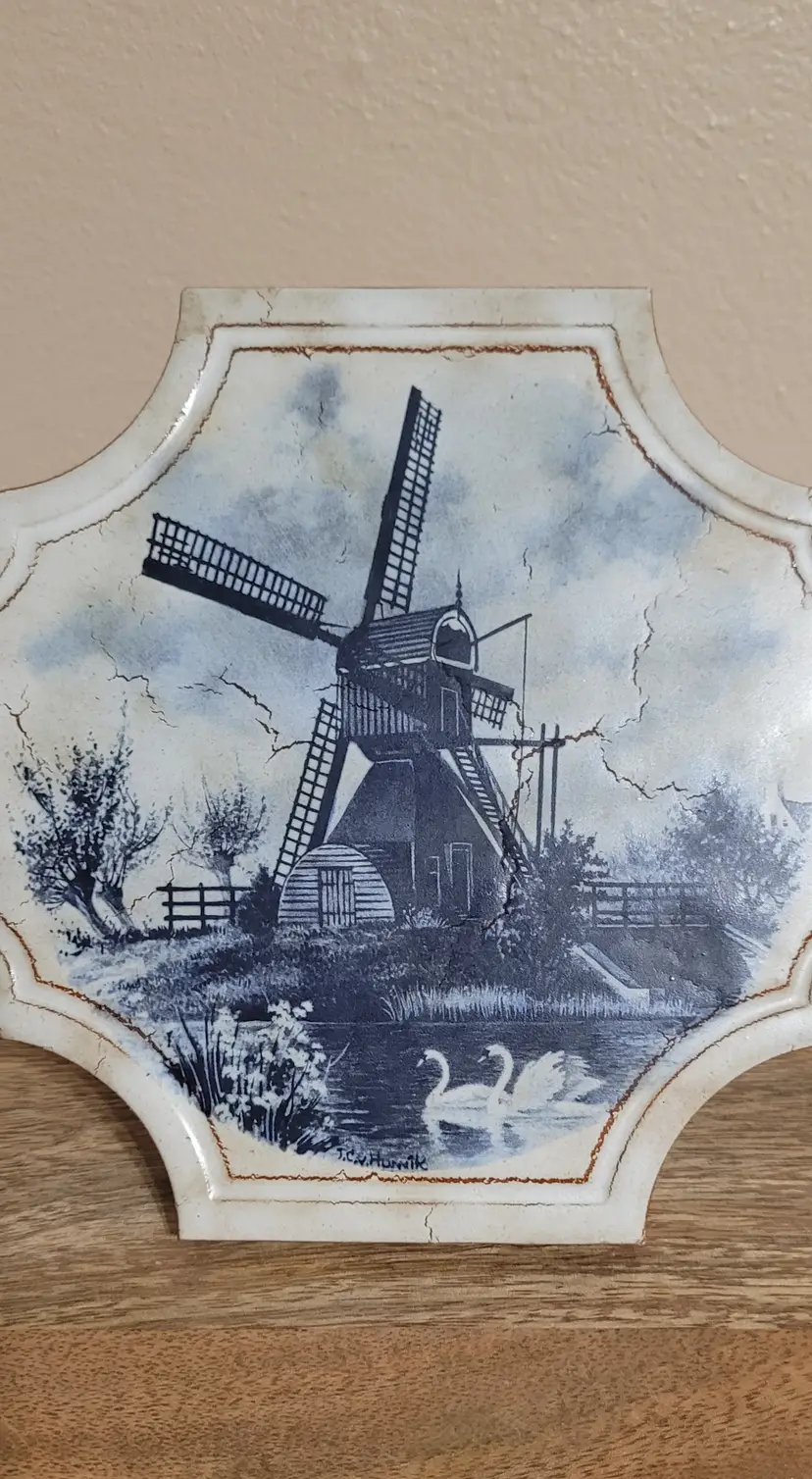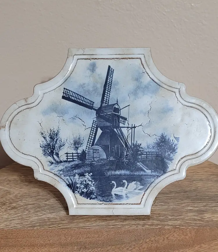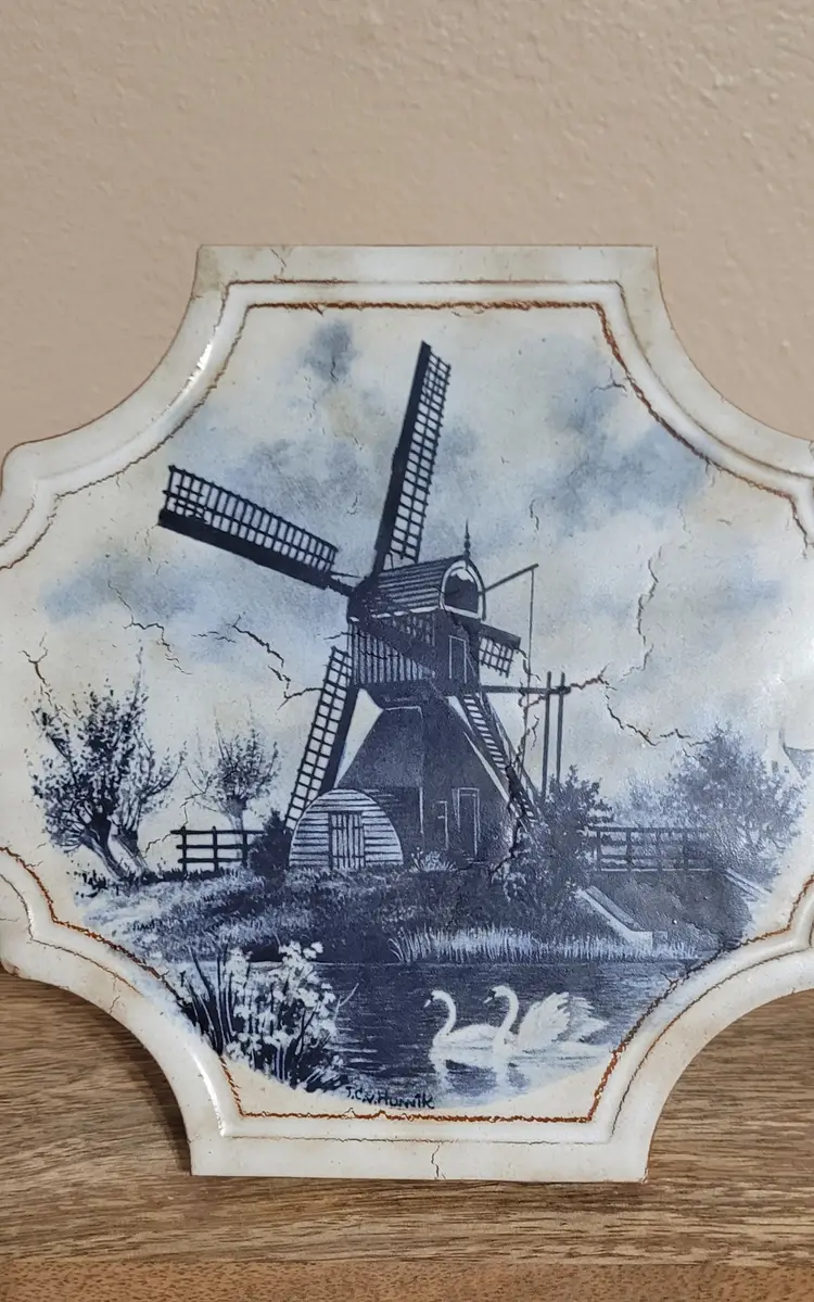 Windmill and Swans Made in Italy 6" x 8". Beautiful blueish & gray colors. Hook on back for easy hanging.